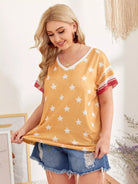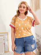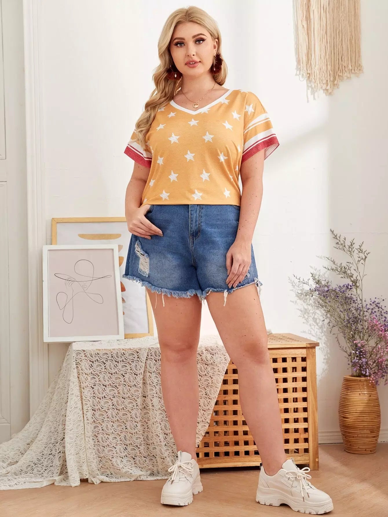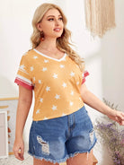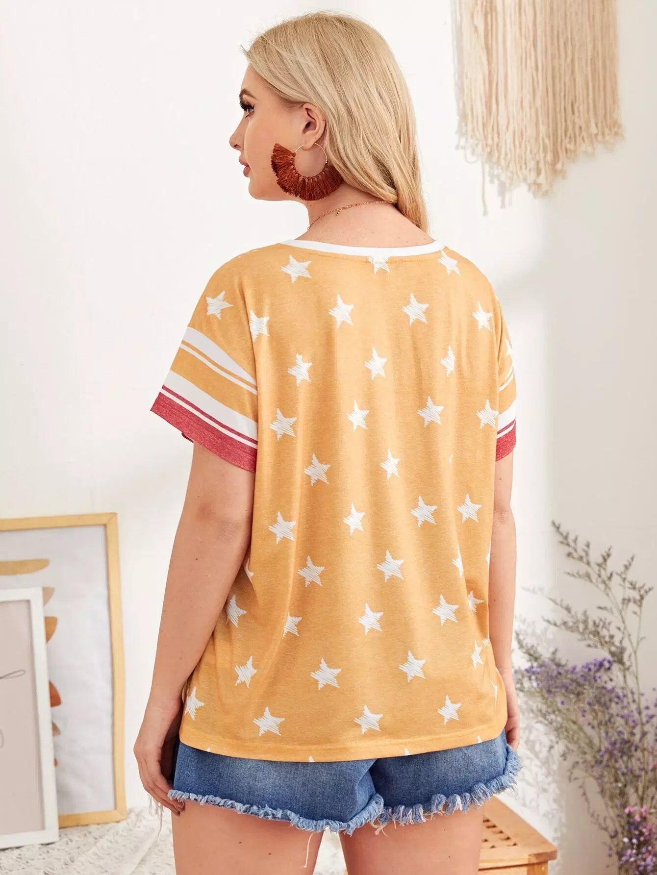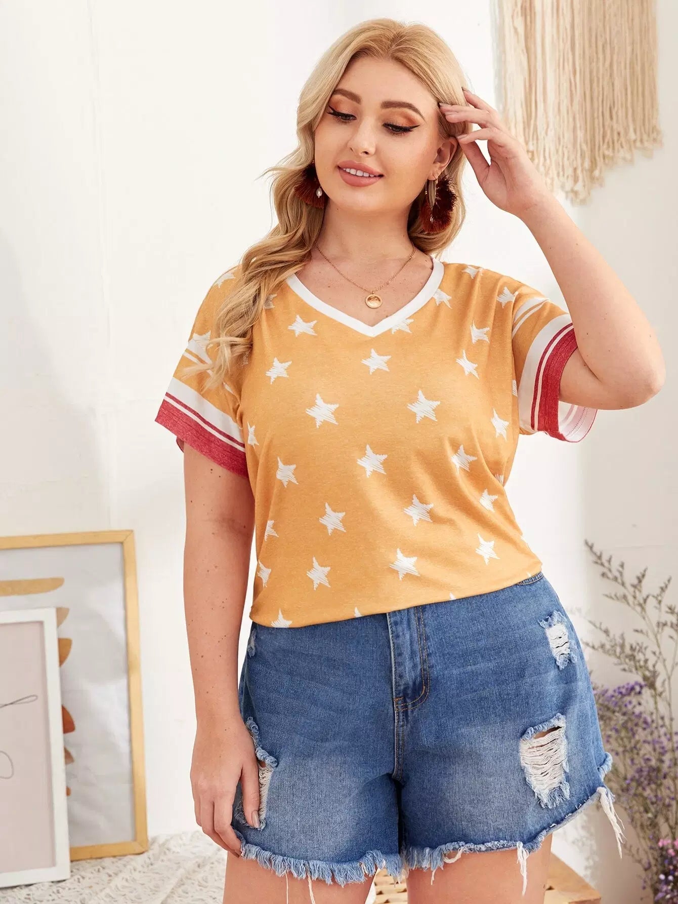 تي شيرت برقبة على شكل نجمة مطبوع على شكل حرف V زائد