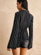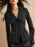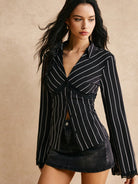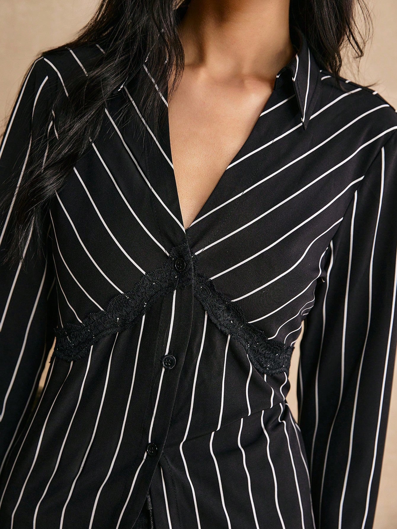 women Poï؟½selle Elegant Lace Splicing Color Block Striped Flare Long Sleeve Tie Shirt