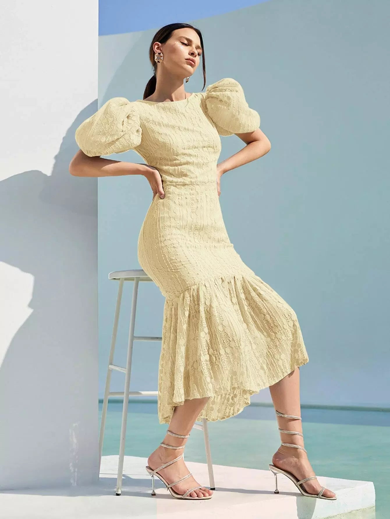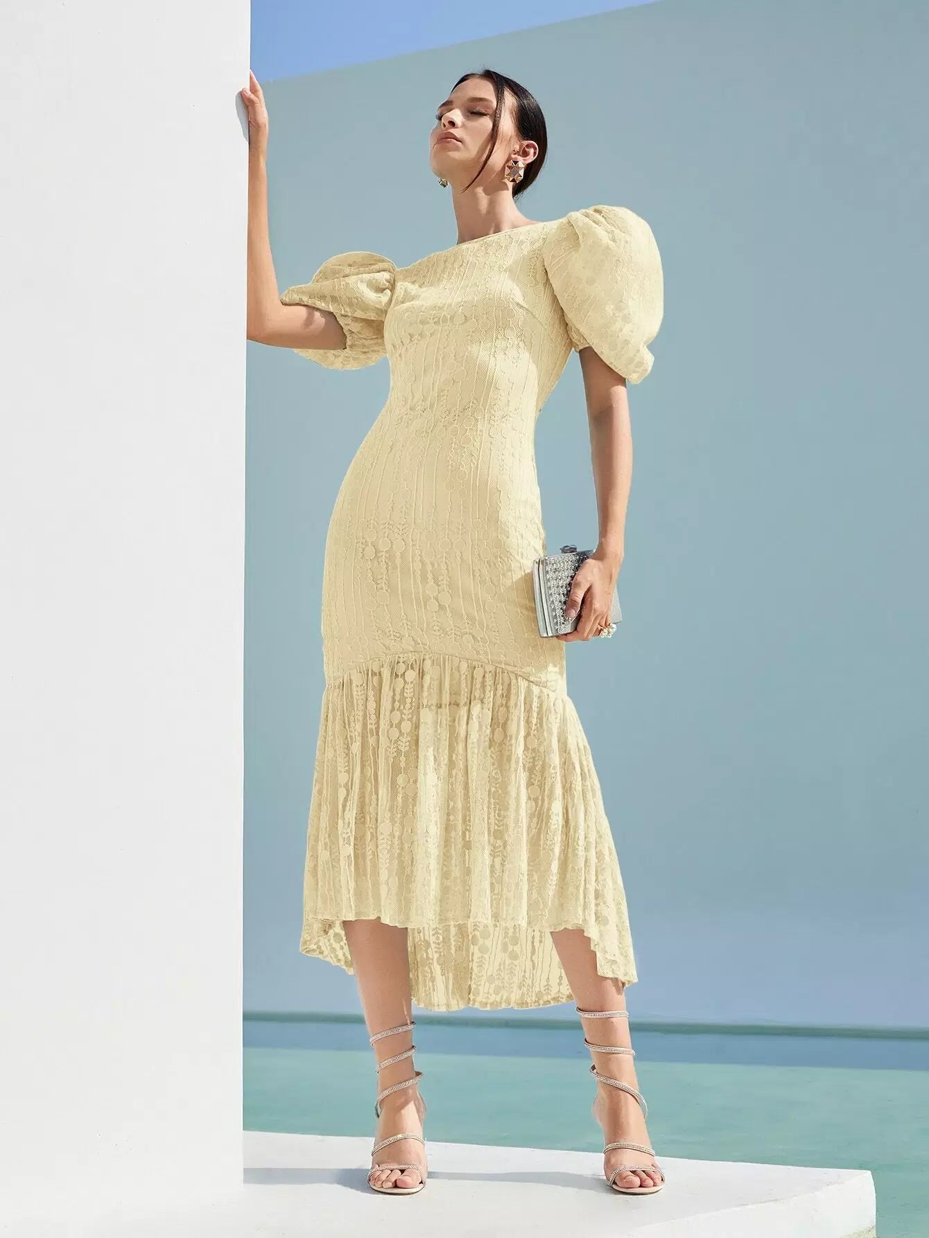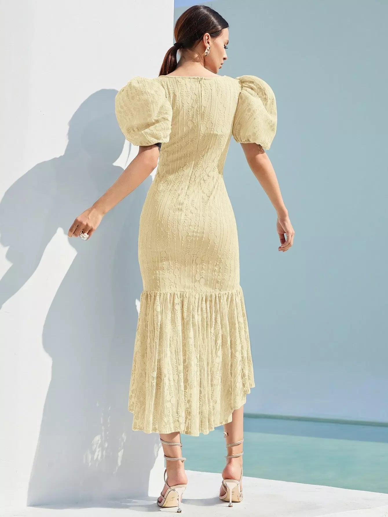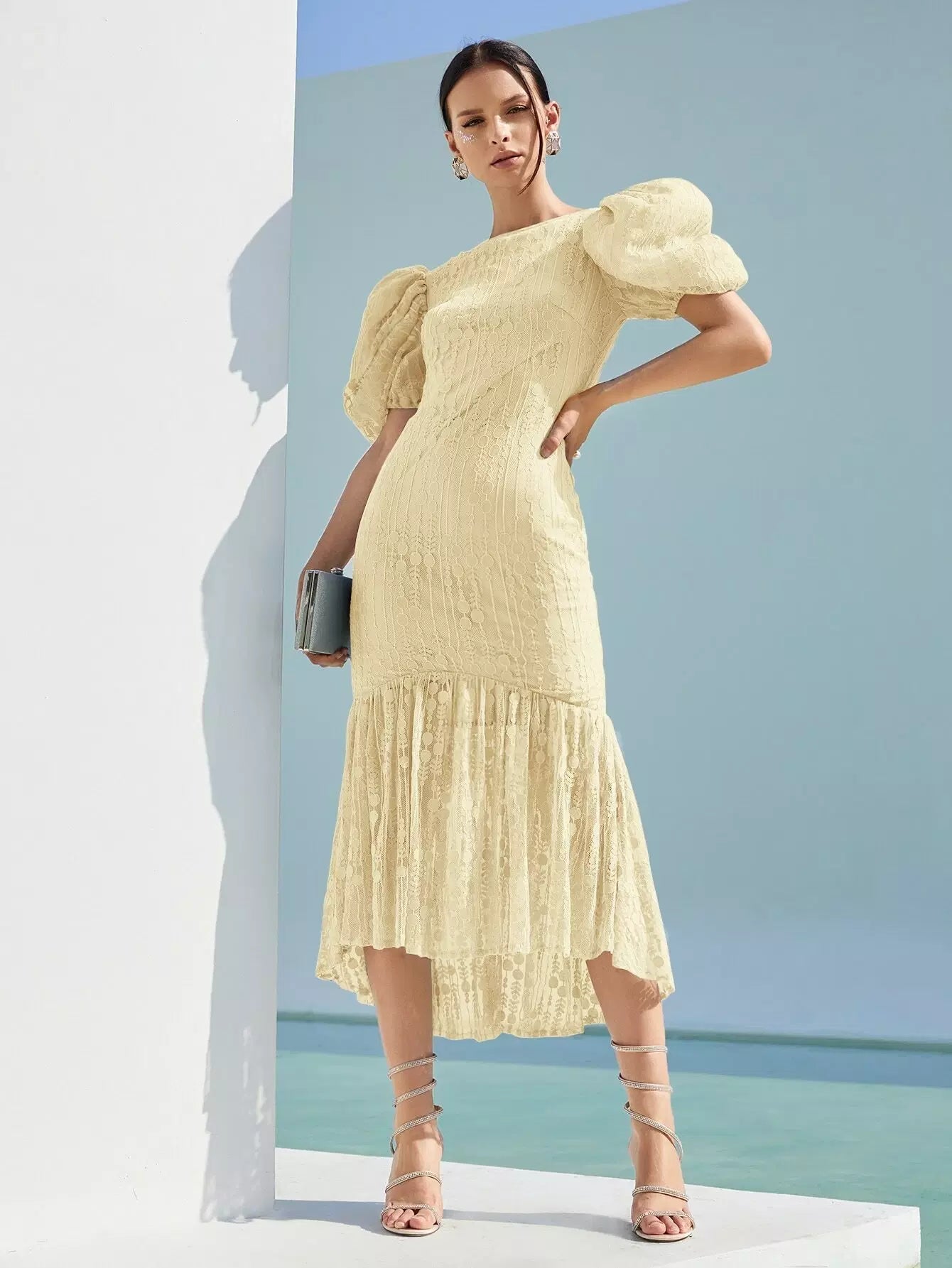 فستان بأكمام كشكش بحافة كشكش من الدانتيل المتراكب