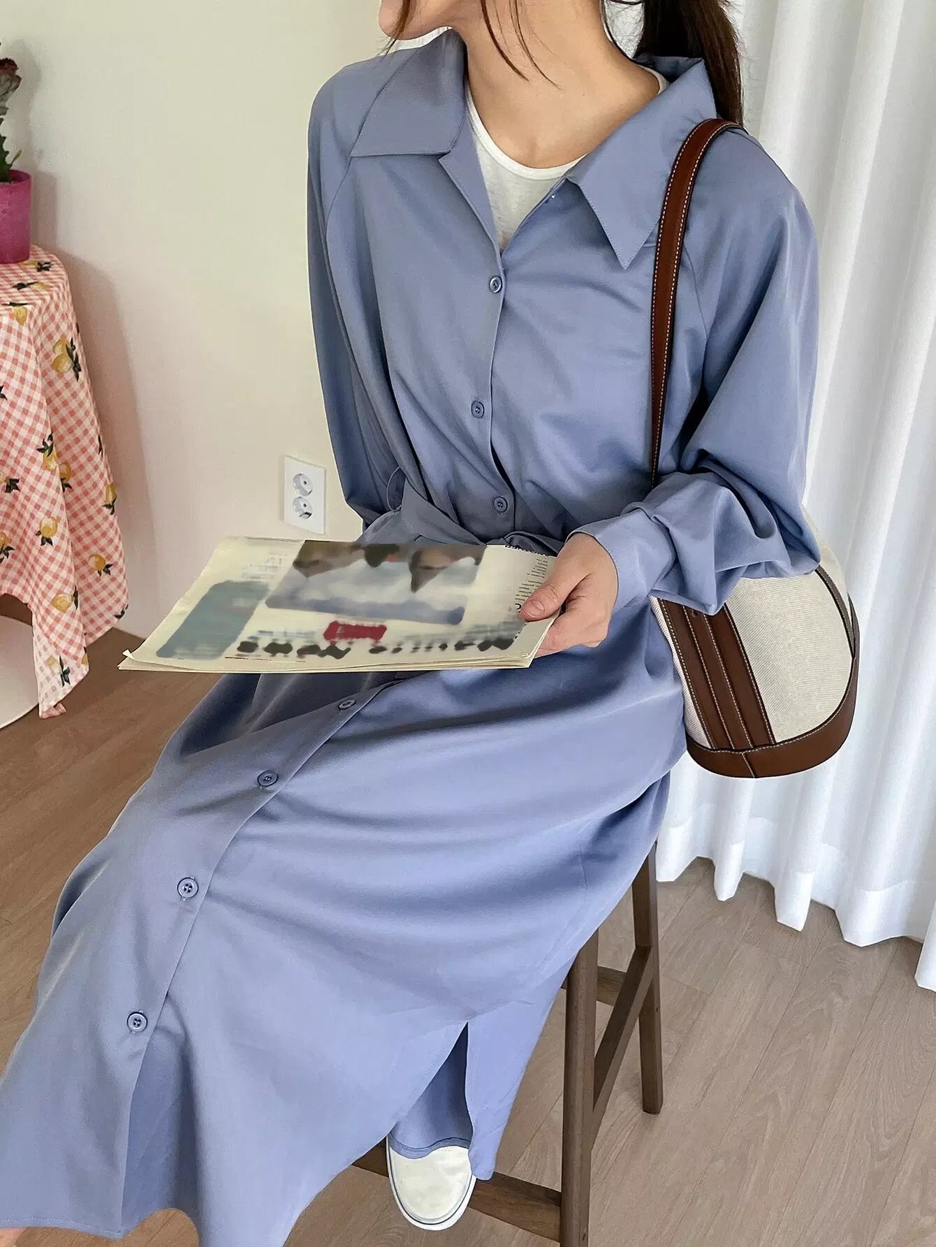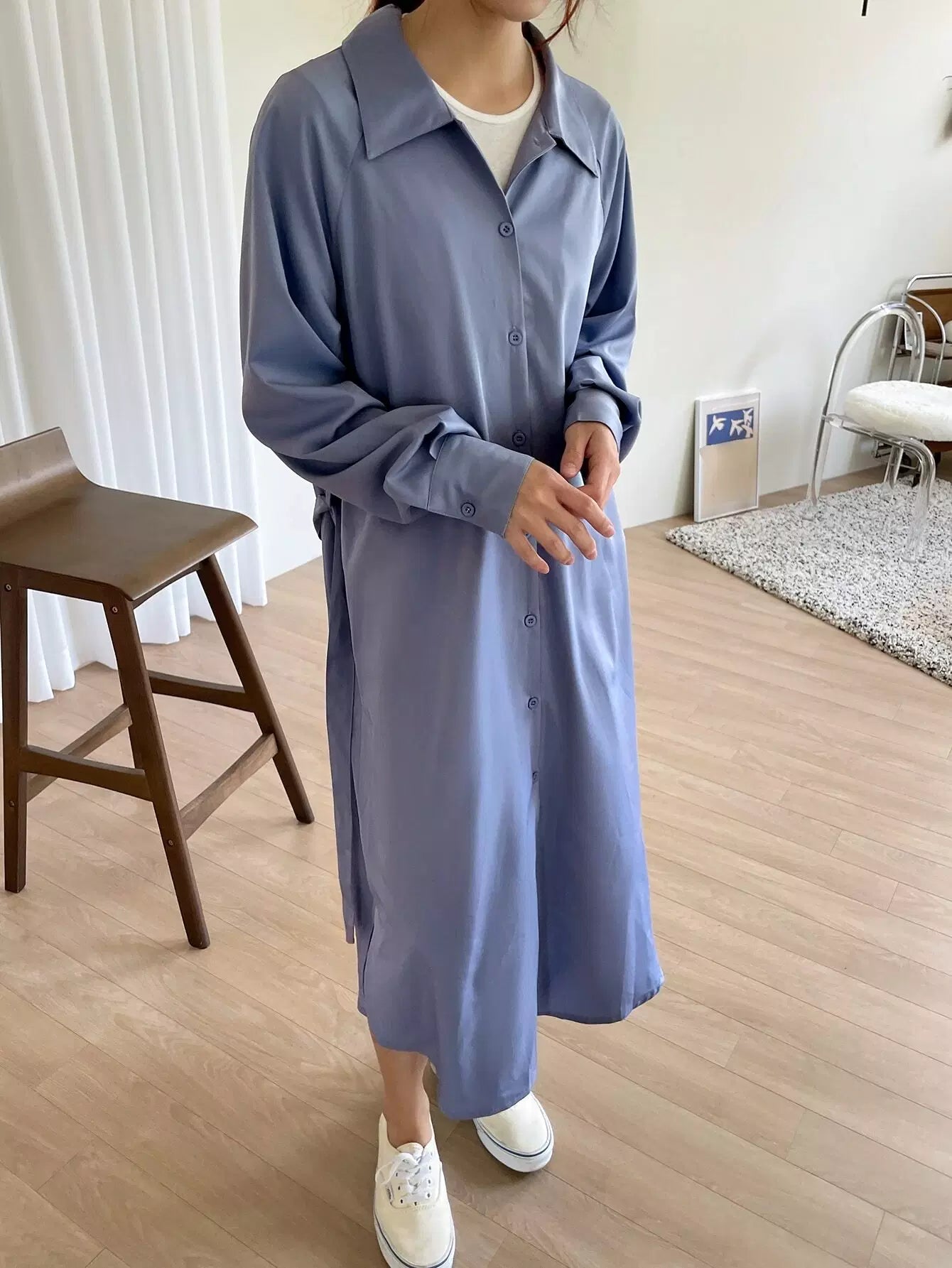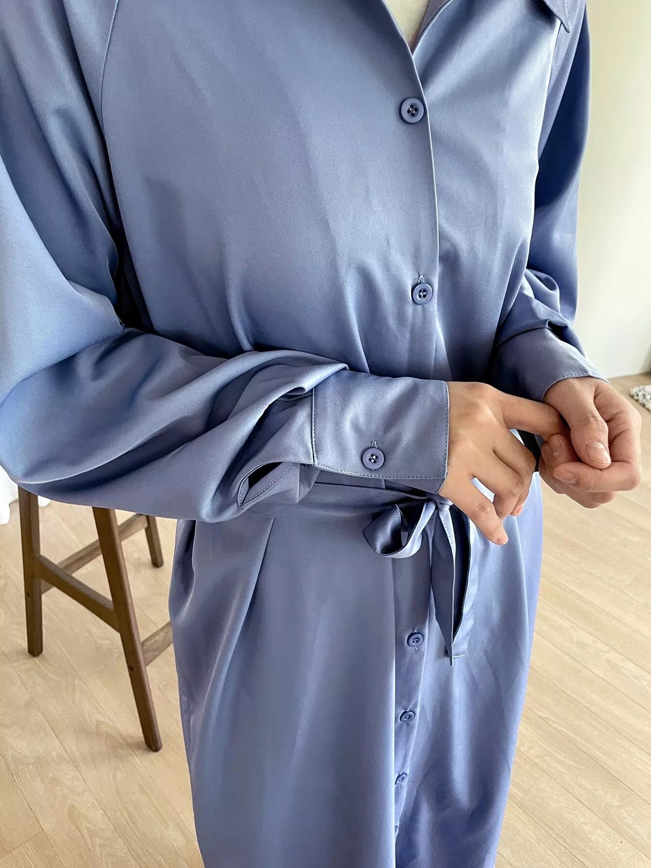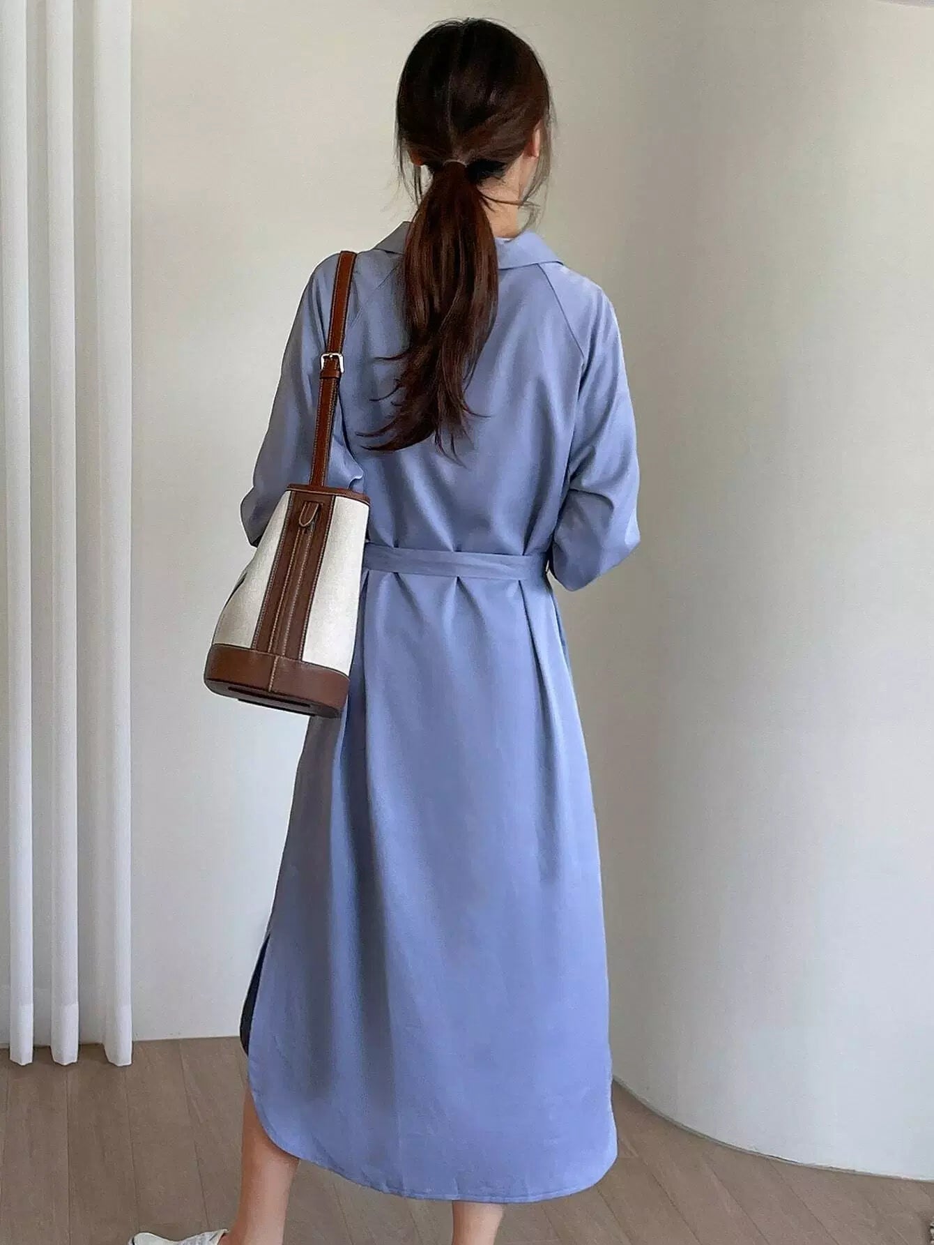 فستان قميص بأكمام راجلان وحاشية مقسمة بدون حزام