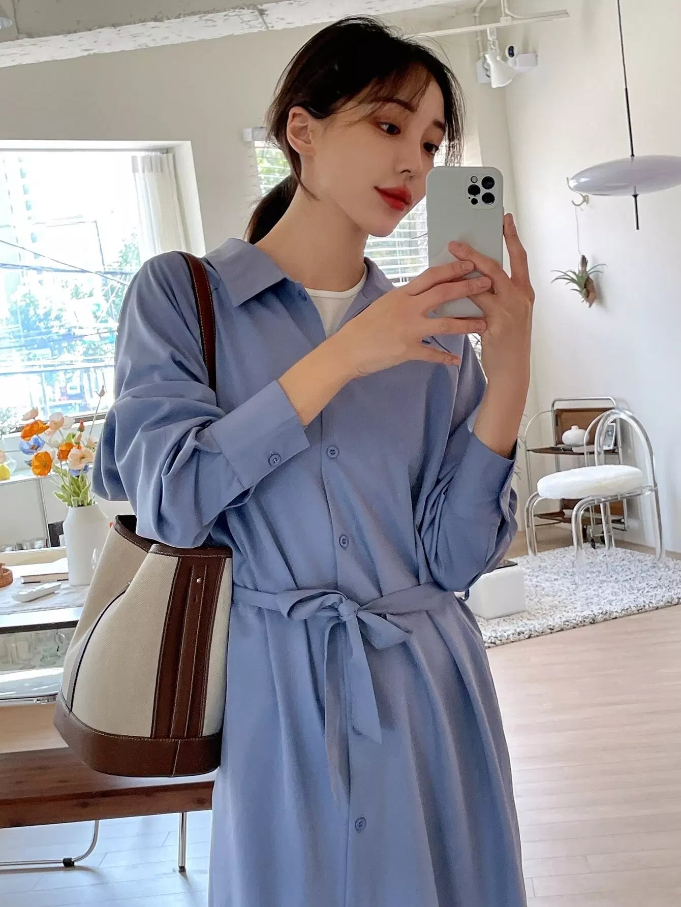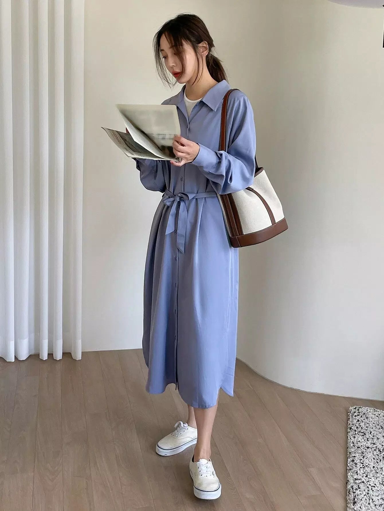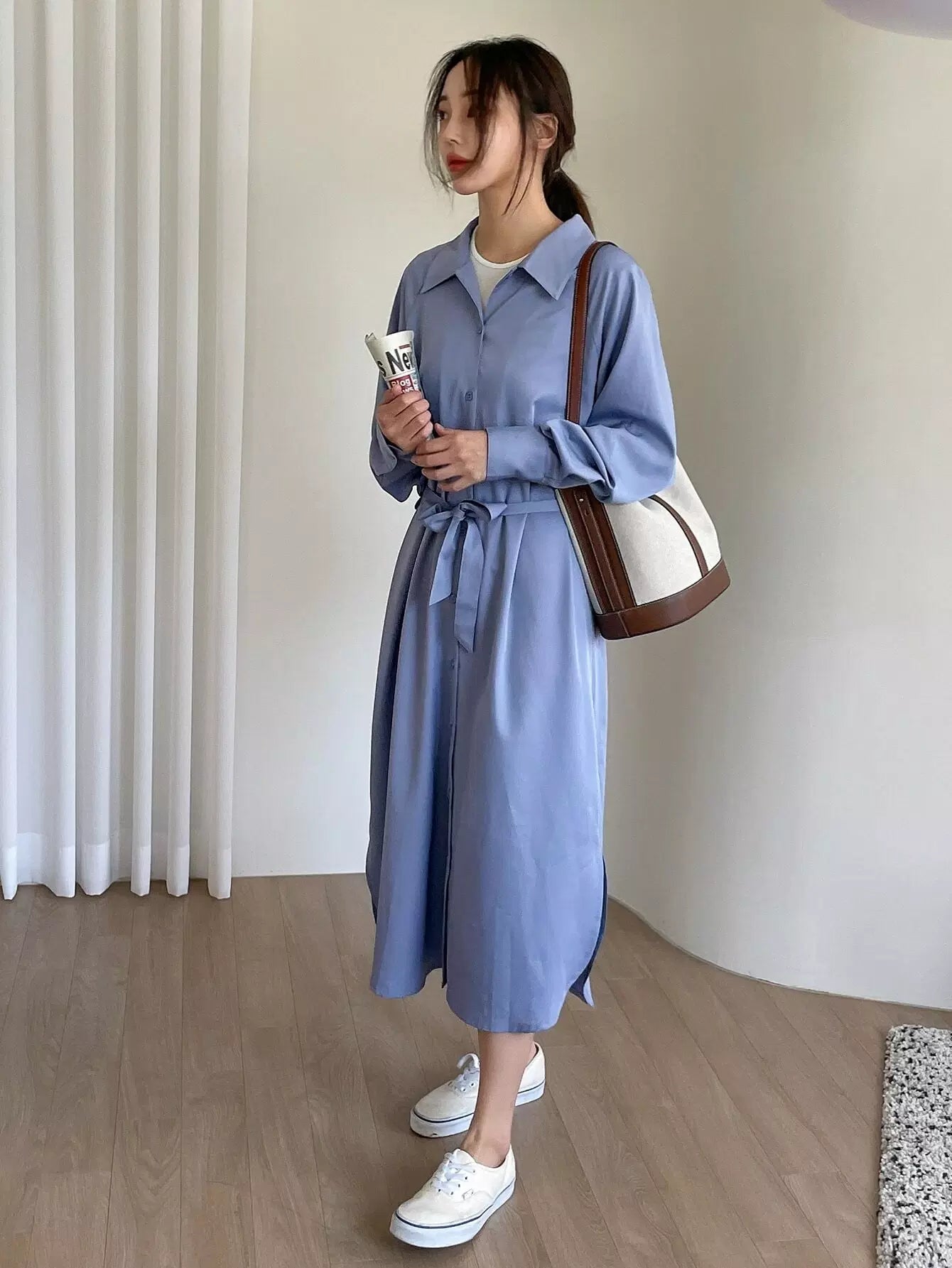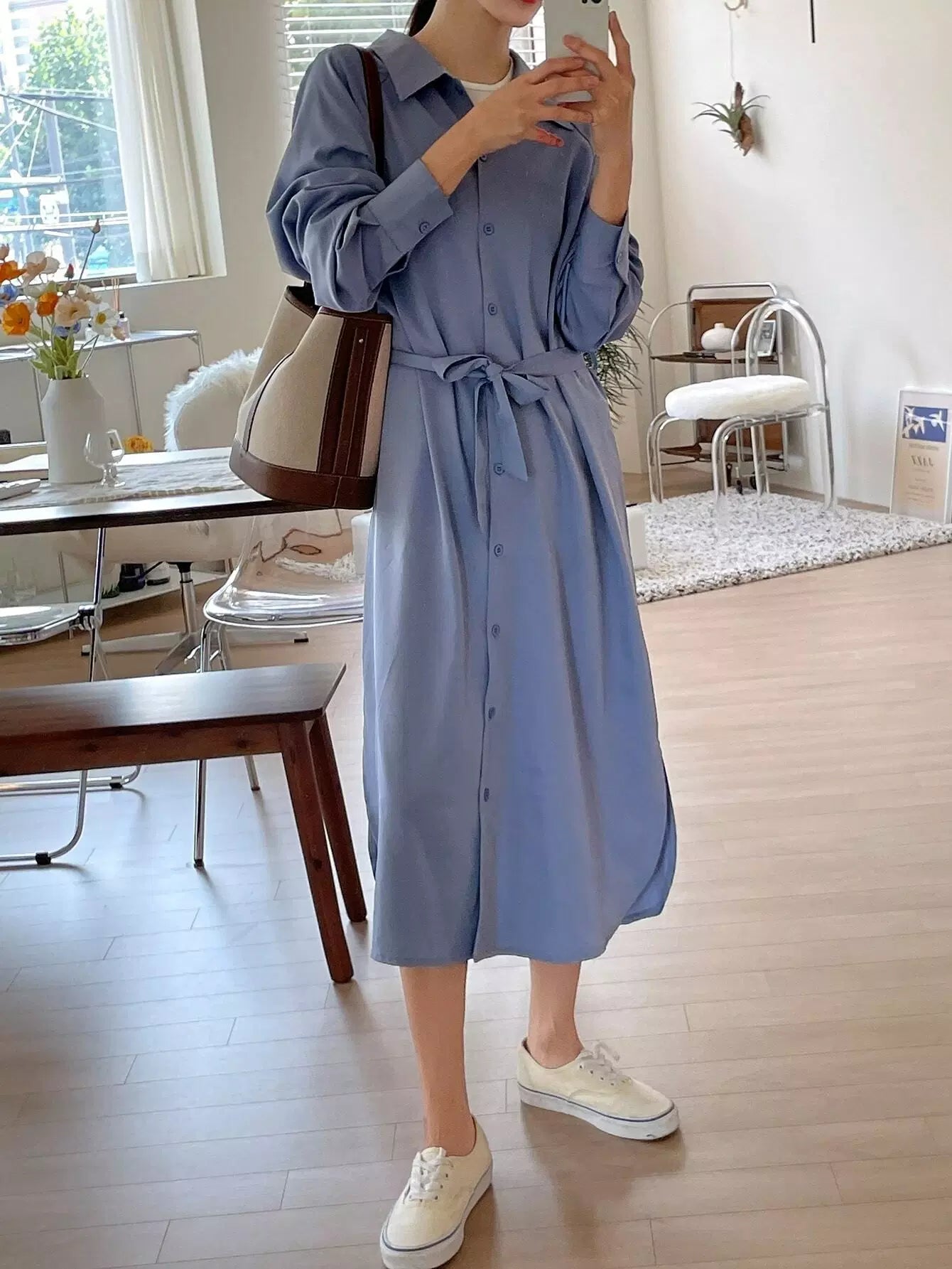 فستان قميص بأكمام راجلان وحاشية مقسمة بدون حزام
