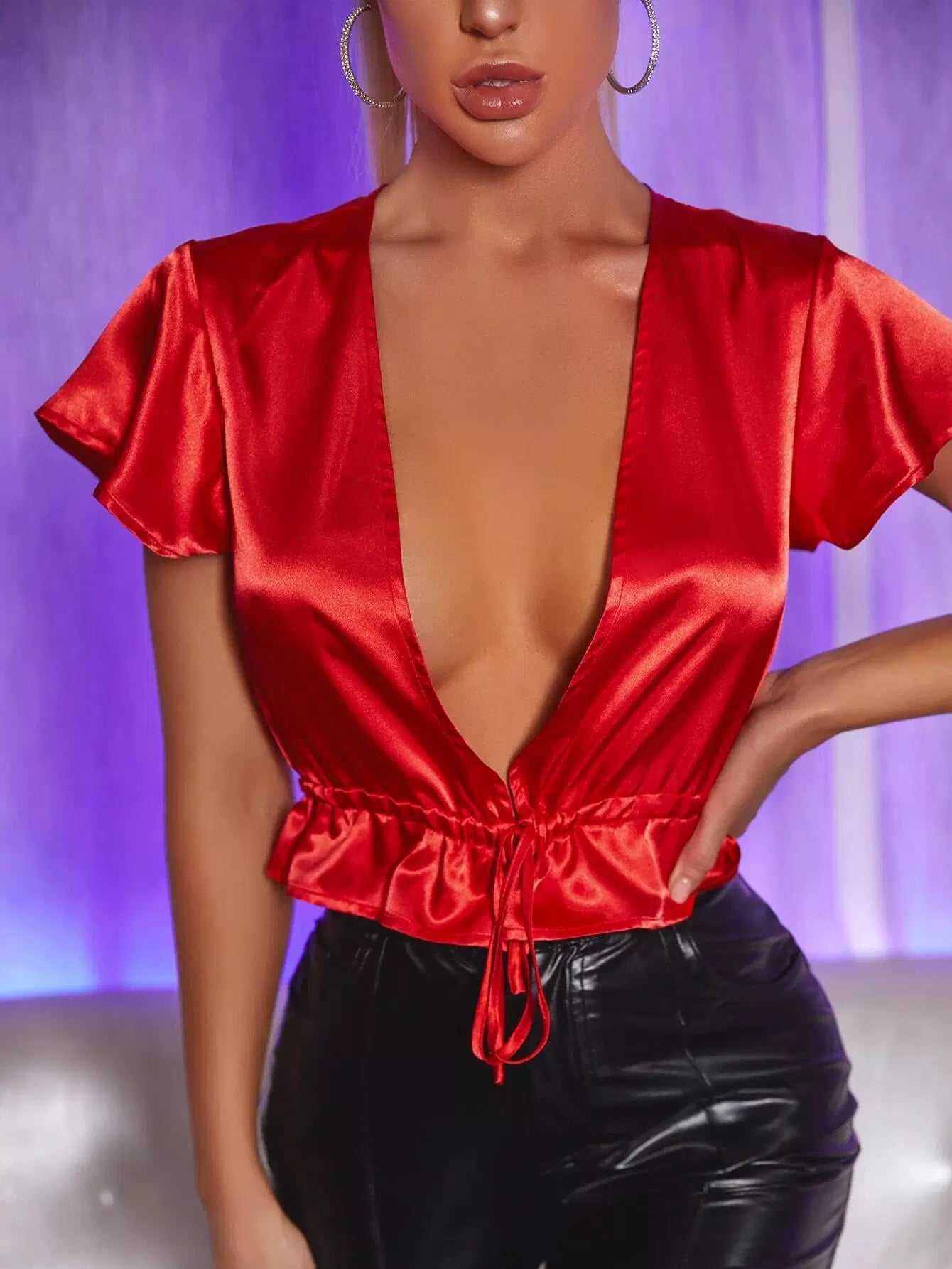 بلوزة من الساتان برقبة على شكل حرف V برباط خصر على شكل حرف V