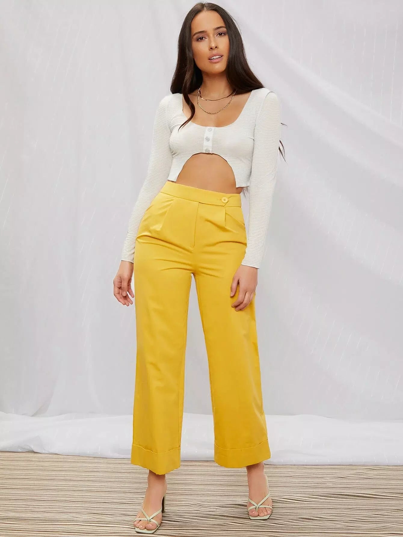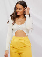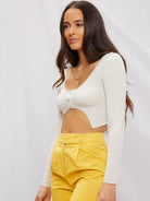 بلوزة برقبة دائرية بأزرار أمامية غير متناسقة الحواف