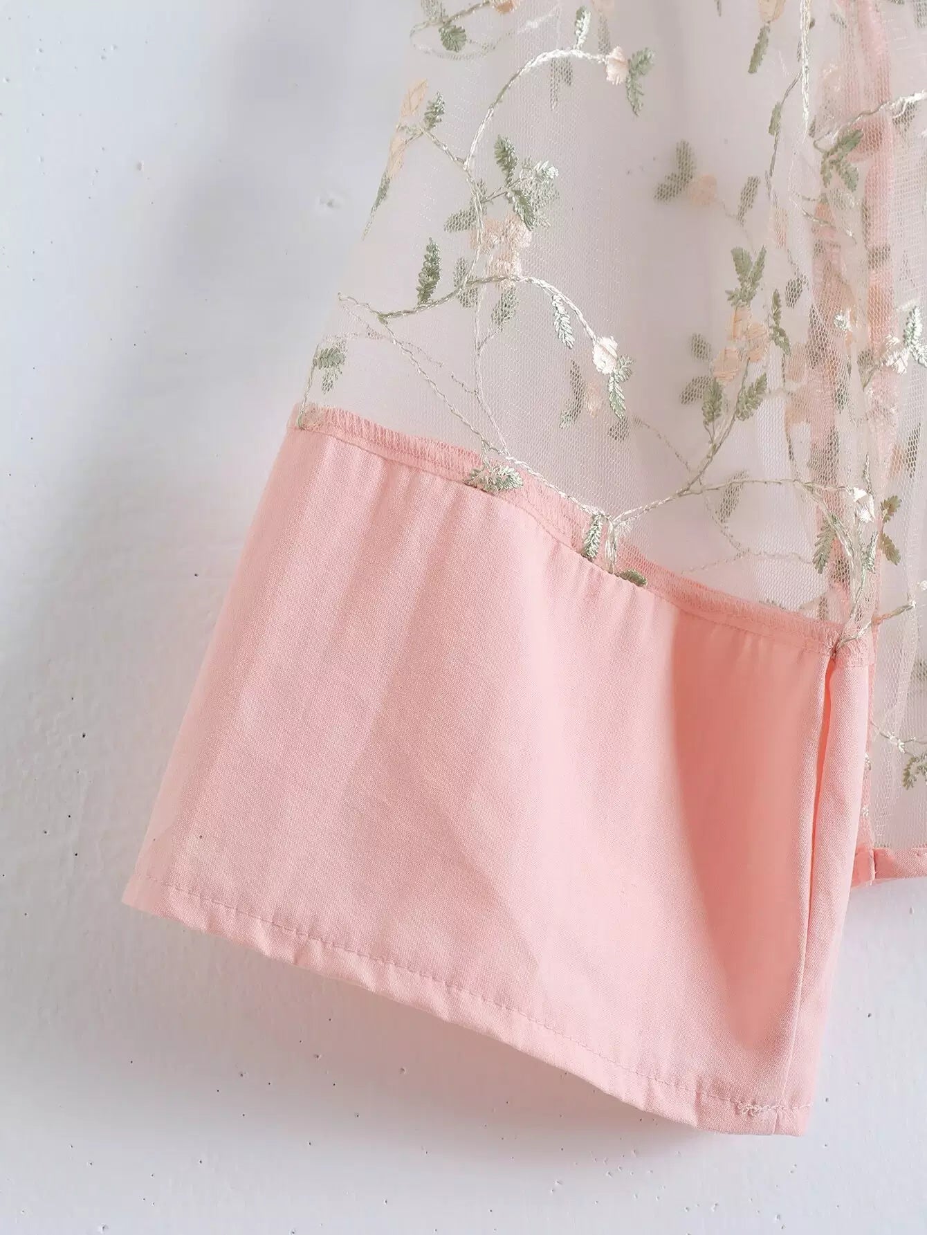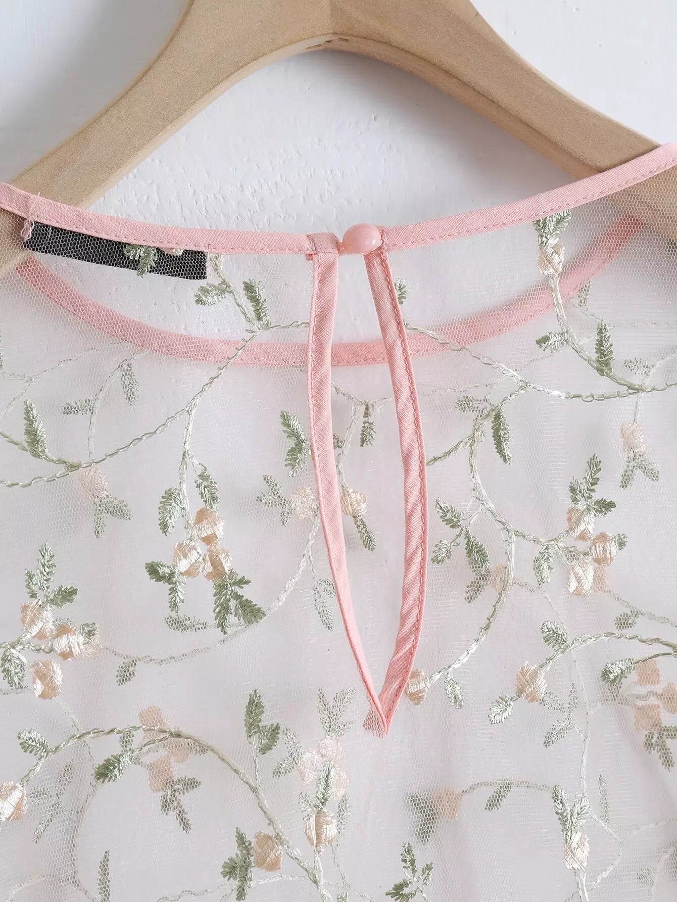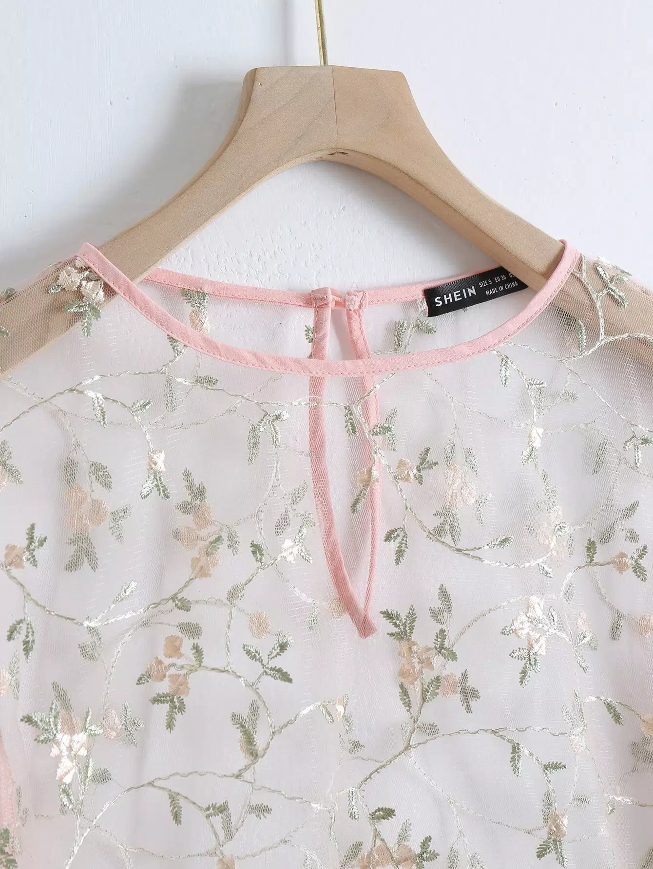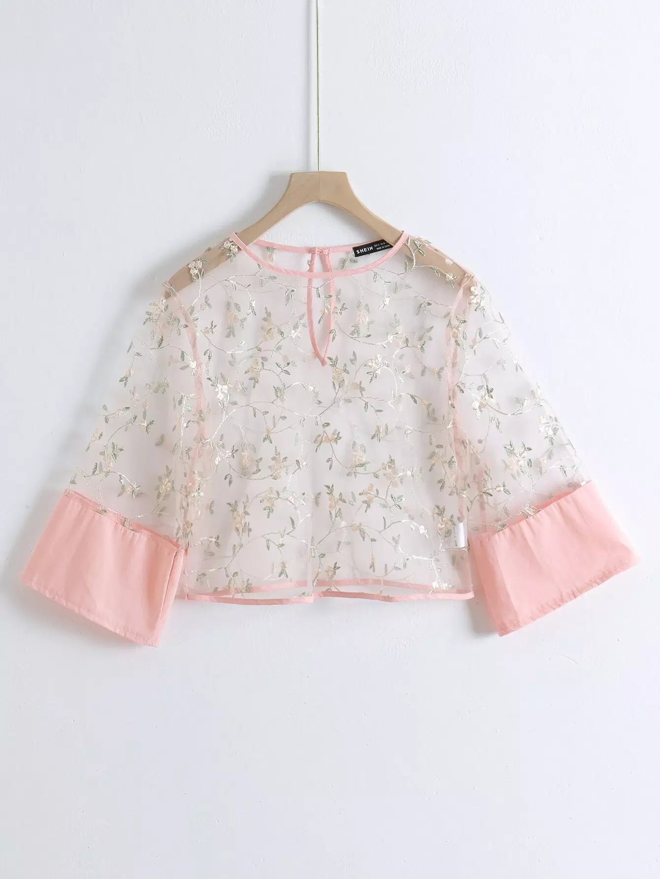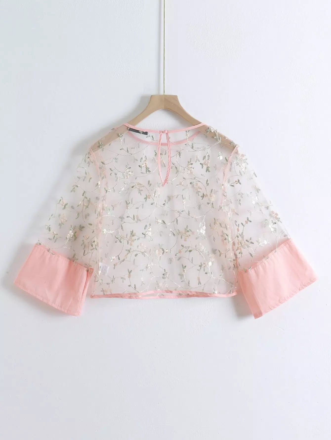 بلوزة قصيرة شفافة مطرزة بتطريزات شبكية شفافة