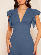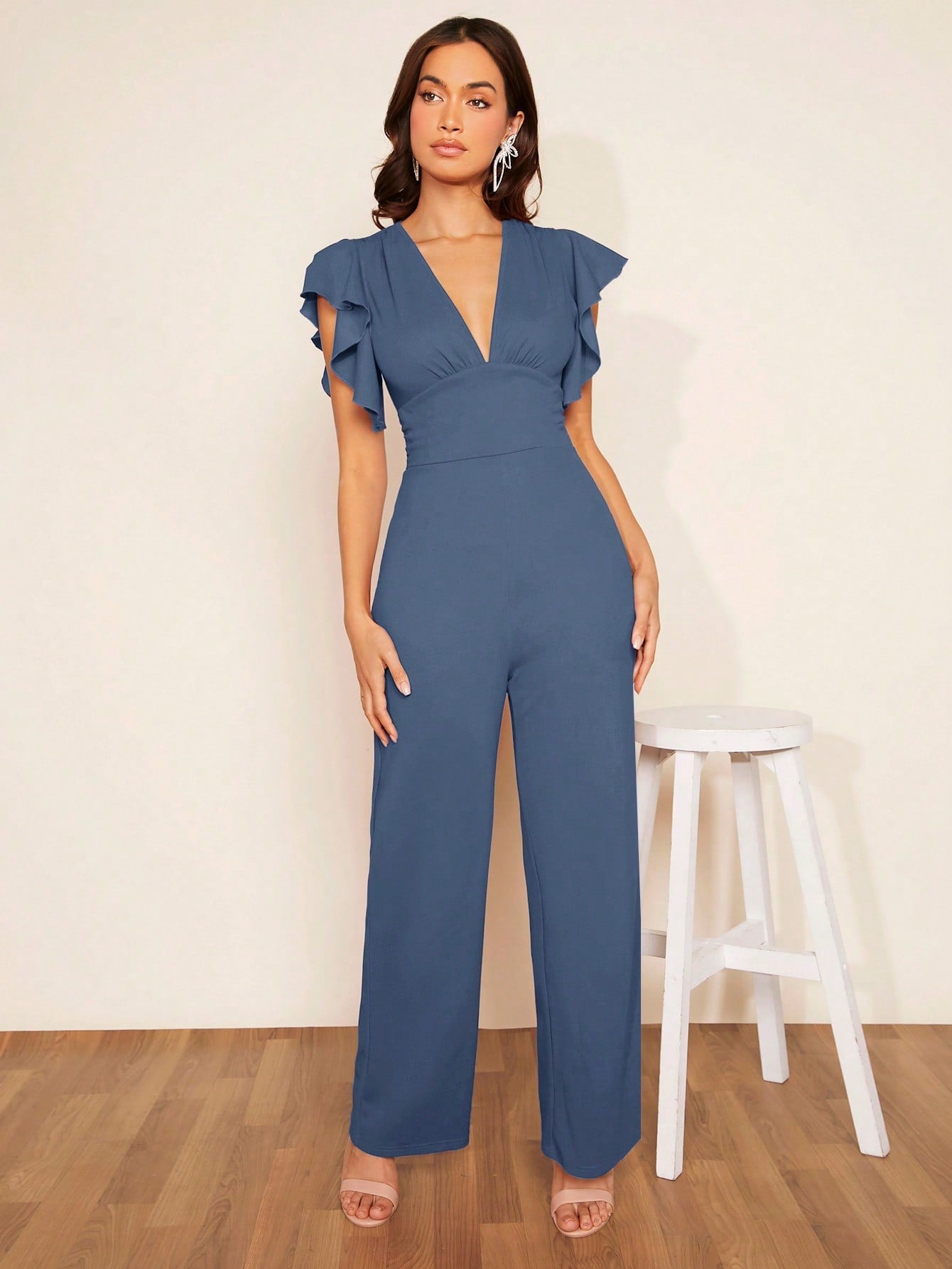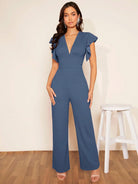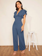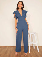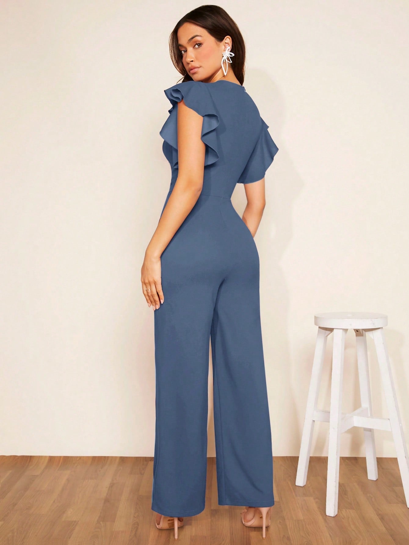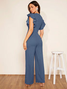 women SHEIN Clasi Women's Solid Color V-Neck Ruffle Trim Elegant Jumpsuit