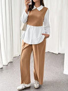 SHEIN Essnce Plus Size Women's Spring And Autumn Fashion Casual Daily Khaki Long-Sleeved Shirt 2 In 1