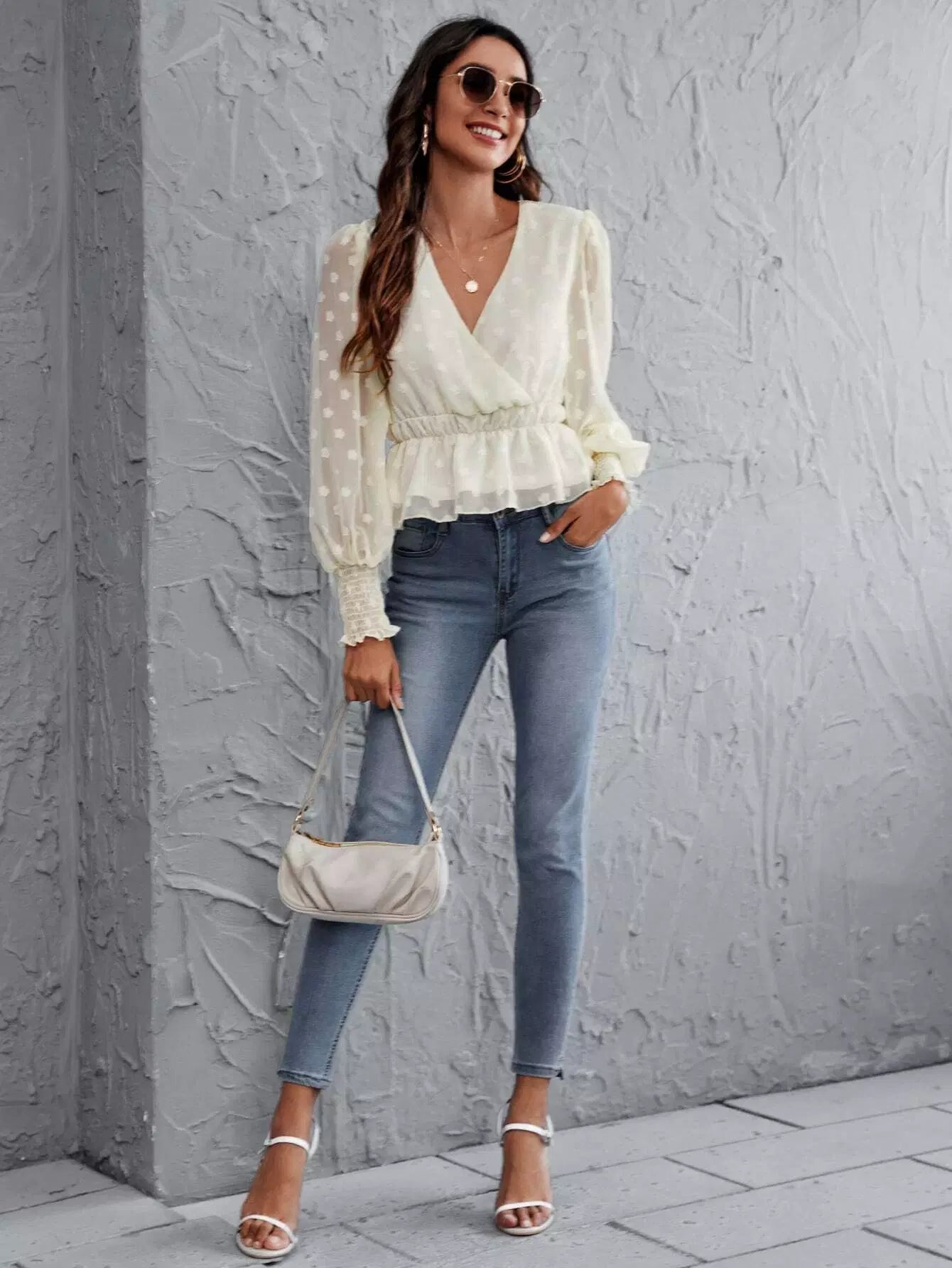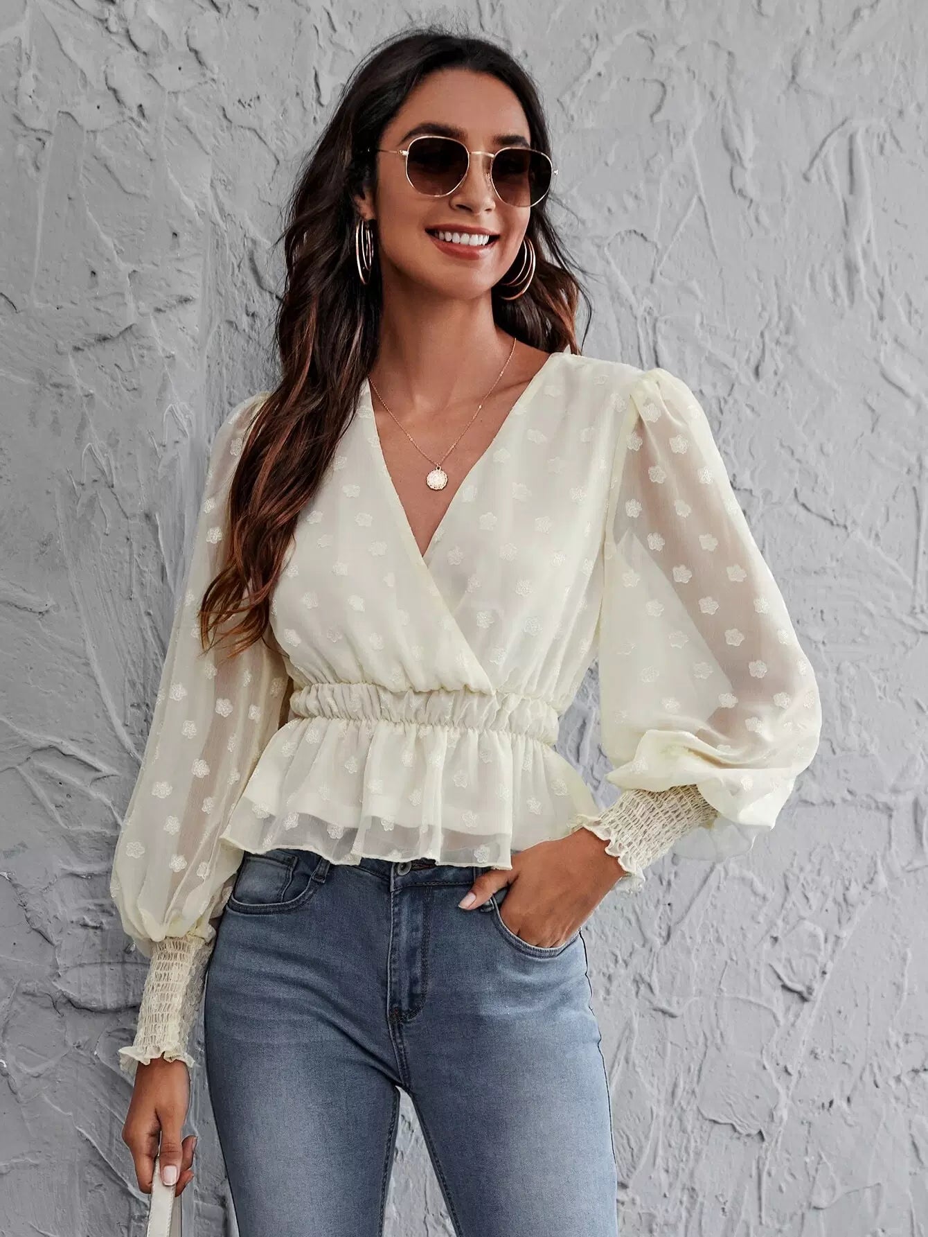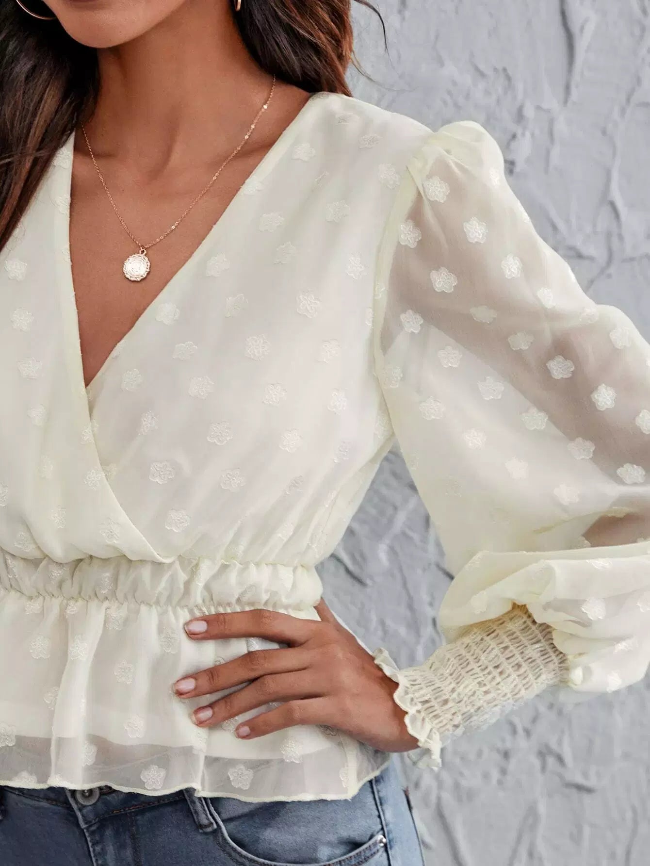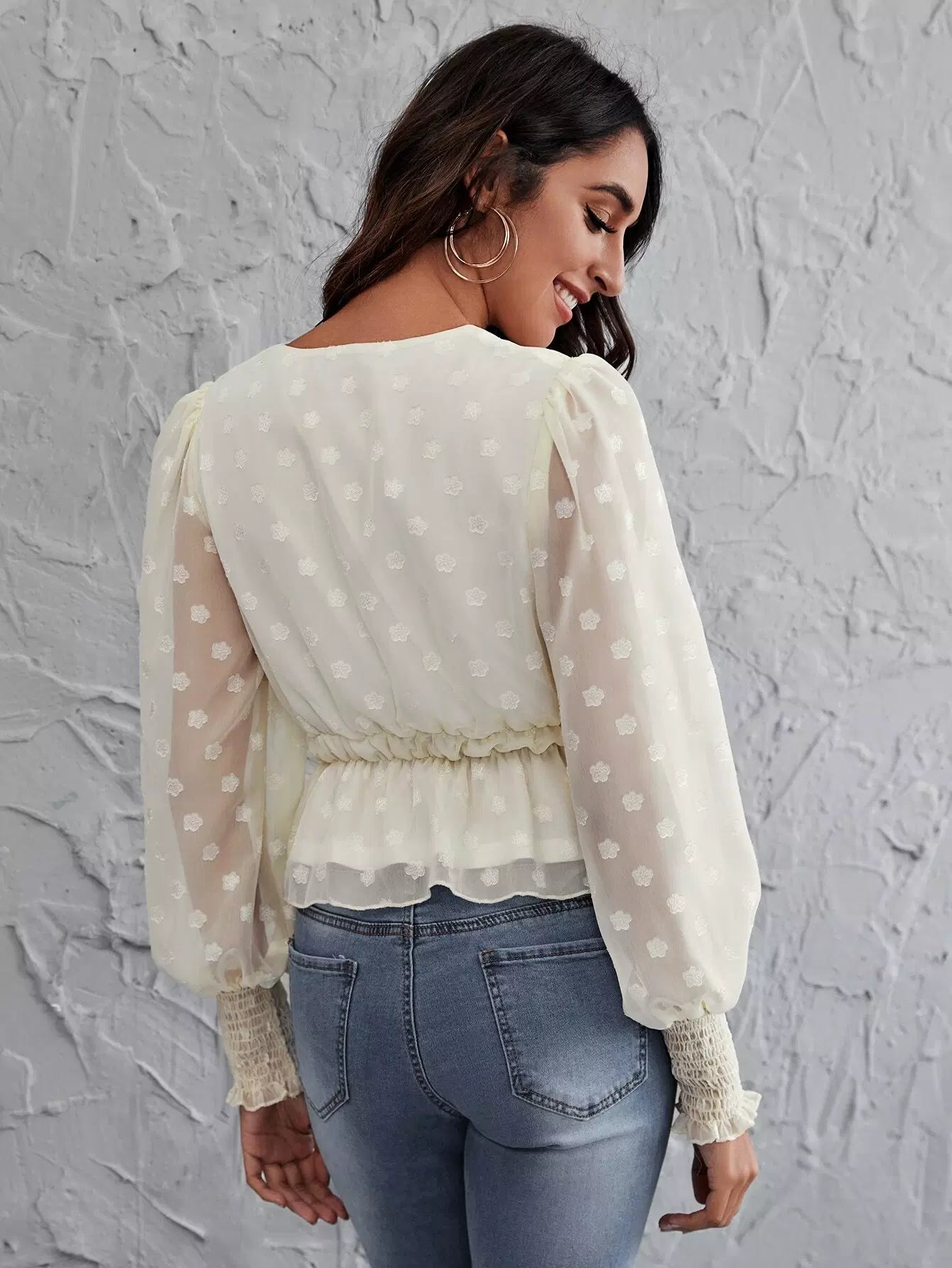 للنساء - بلوزة بيبلوم شبكية جاكار ذات أساور مكشكشة