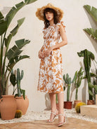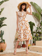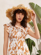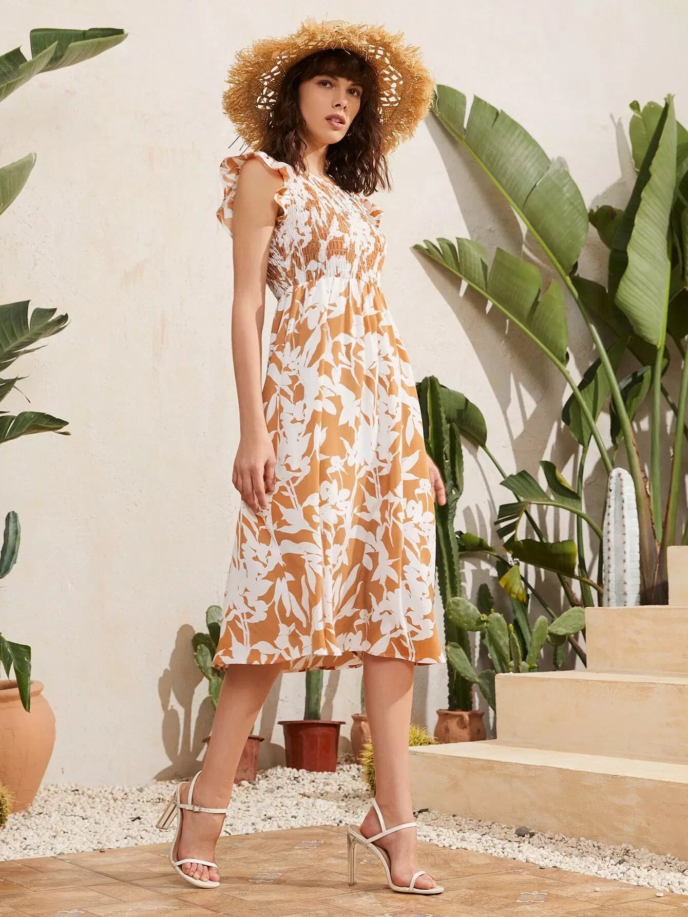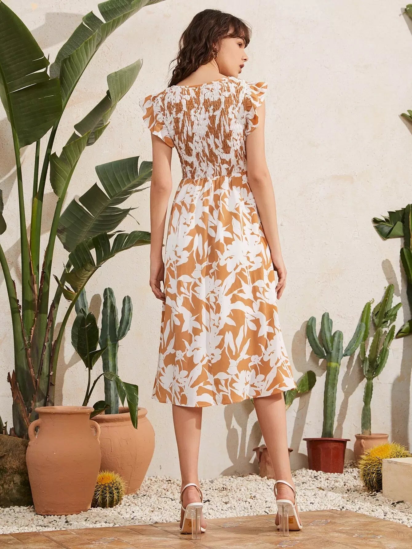 للنساء - فستان مزين بالزهور مزين بكشكشة وتفاصيل مكشكشة