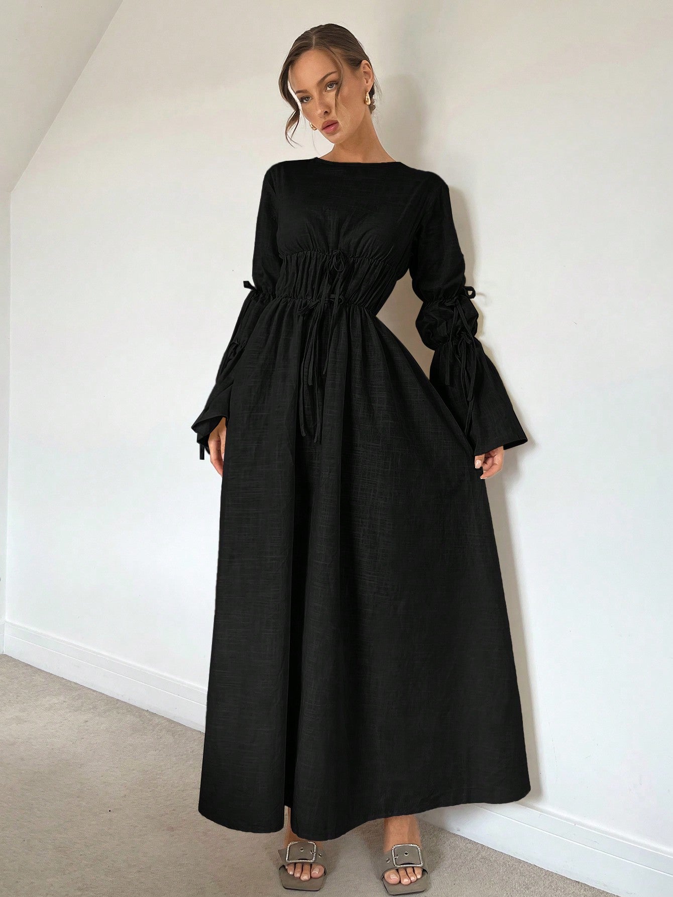 Siren Gaze New Autumn Lantern Sleeve Ruched Tie Waist Long A-Line Dress, Natural Color Cotton Casual
