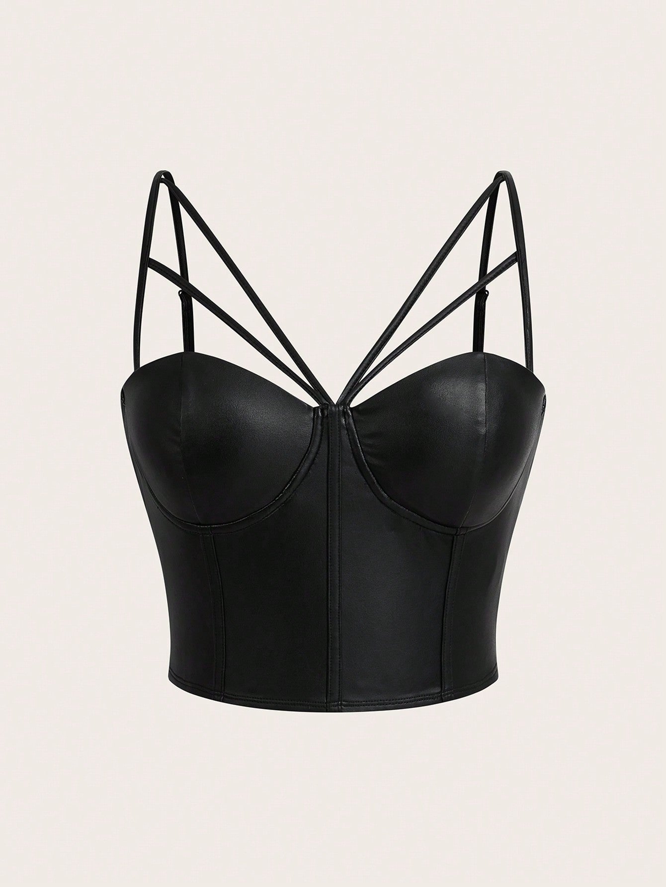 women Slaydiva Women Solid Color Hollow-Out PU Leather Spaghetti Strap Sexy Camisole