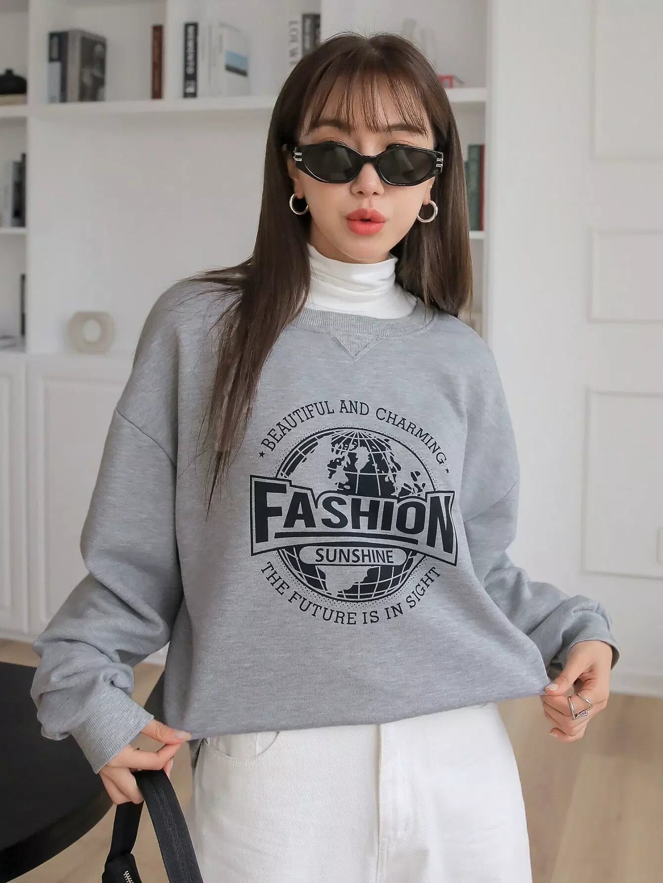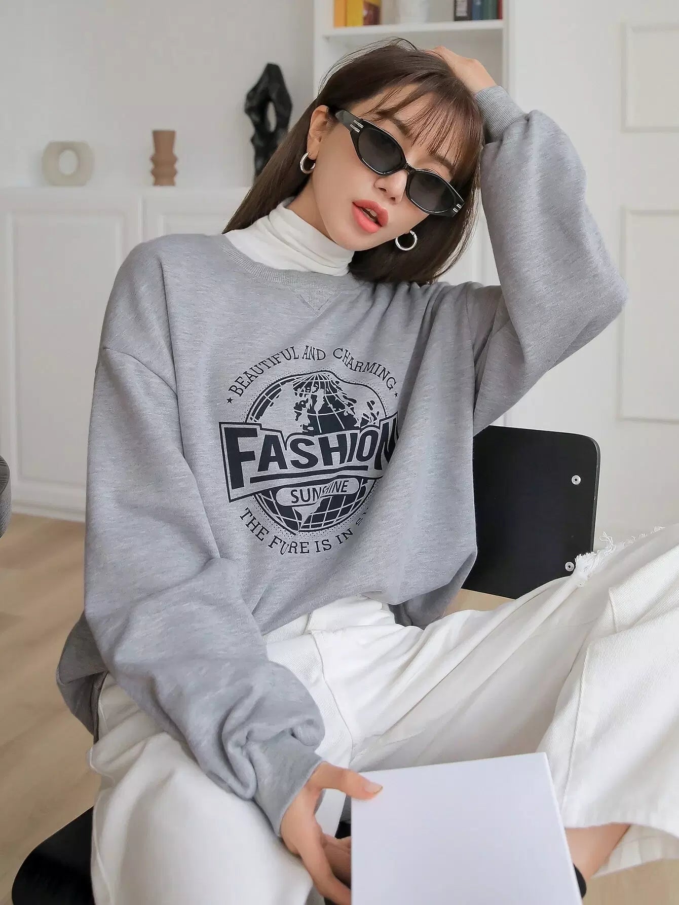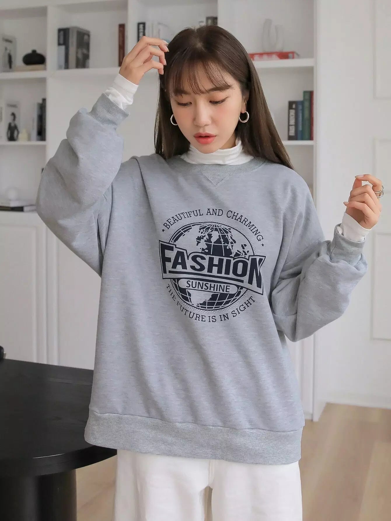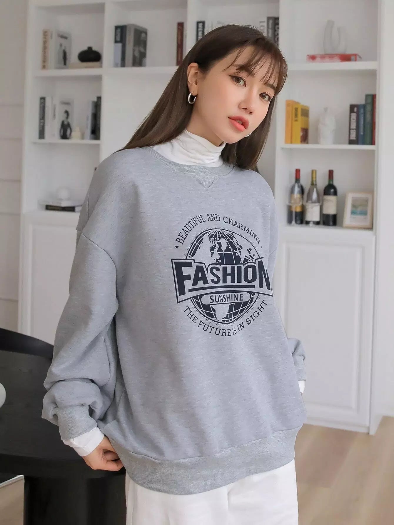 سويت شيرت منسدل الكتف مطبوع عليه شعار