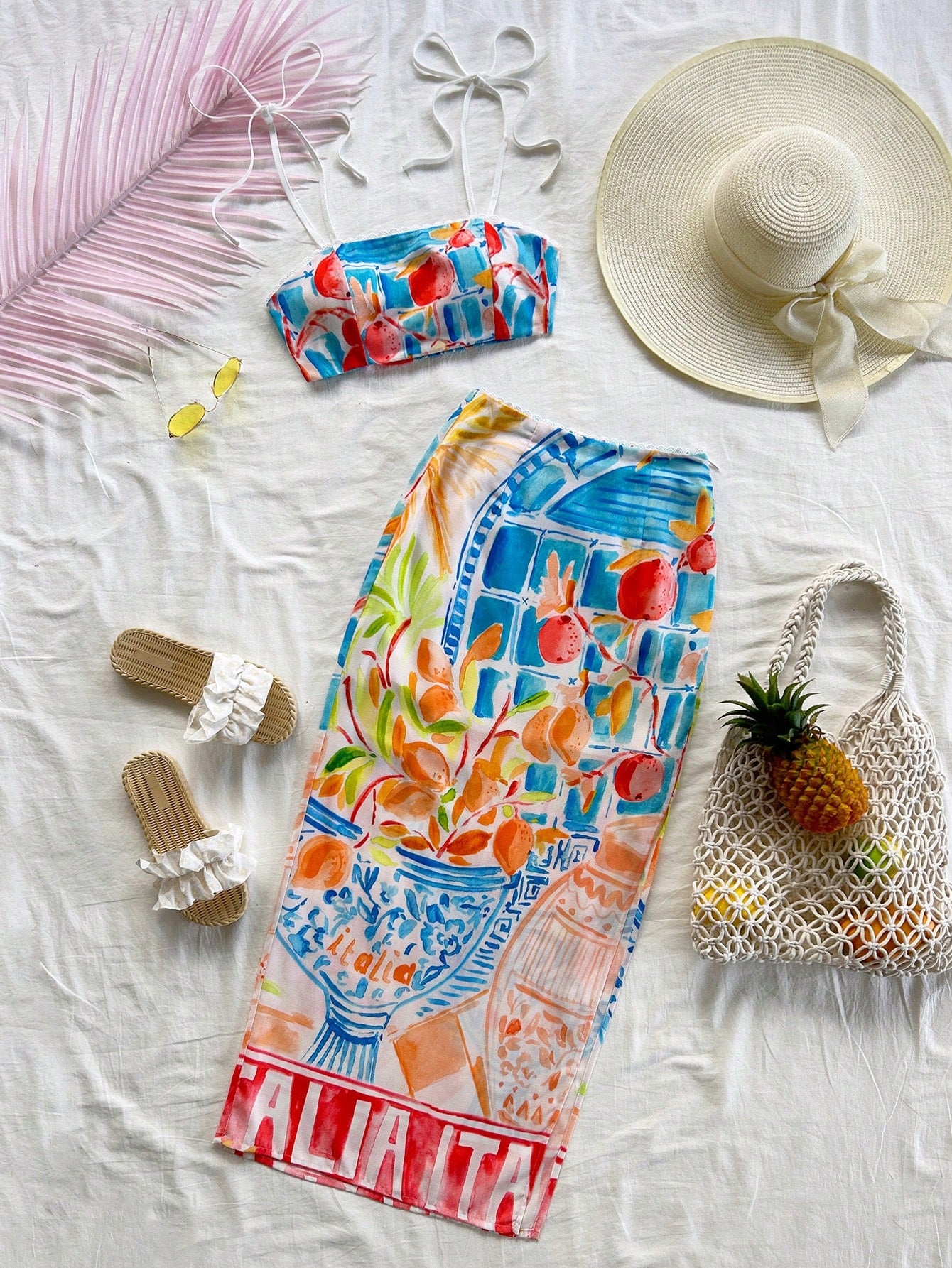 قميص داخلي قصير مطبوع عليه مناظر طبيعية وفواكه من Soleia للنساء، بأشرطة كتف مزينة بفيونكة، مناسب للعطلات