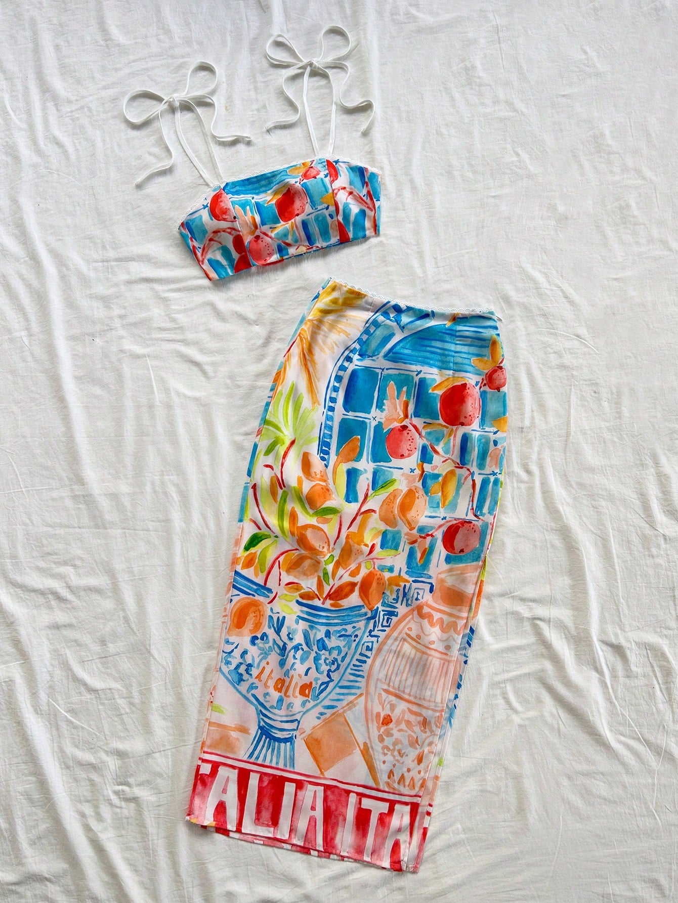 Soleia Women's Vacation Style Fun Scenery & Fruit Printed Short Cami With Bowknot Shoulder Straps And