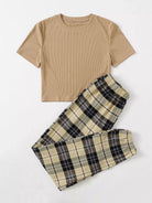 تي شيرت سادة مضلع سادة وبنطلون منقوش