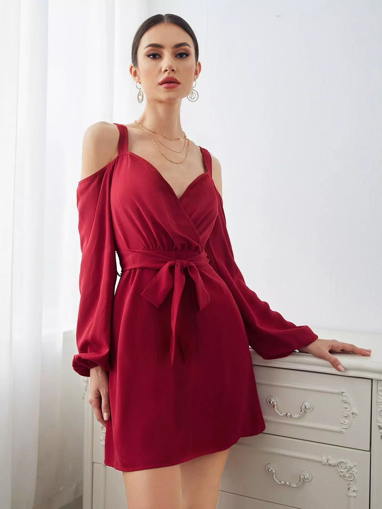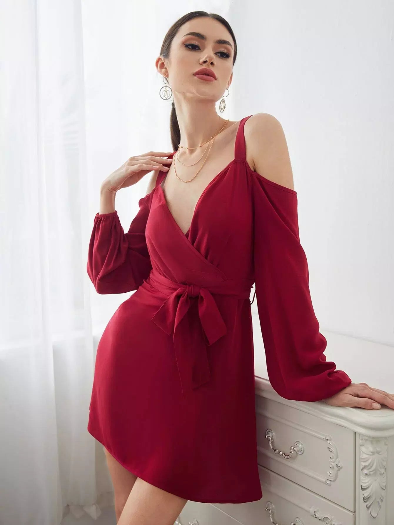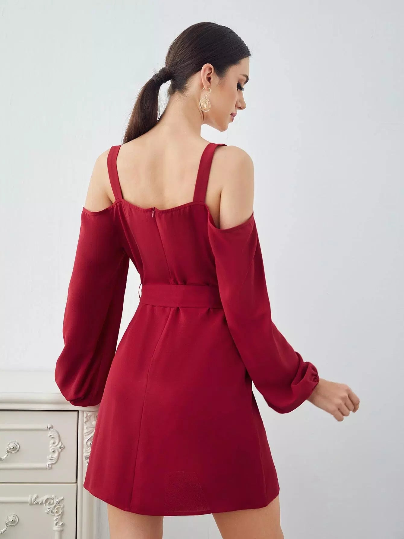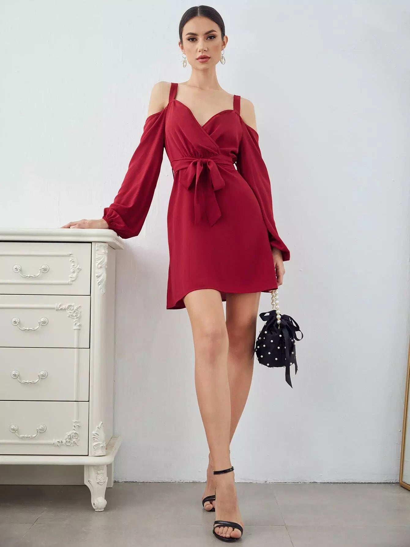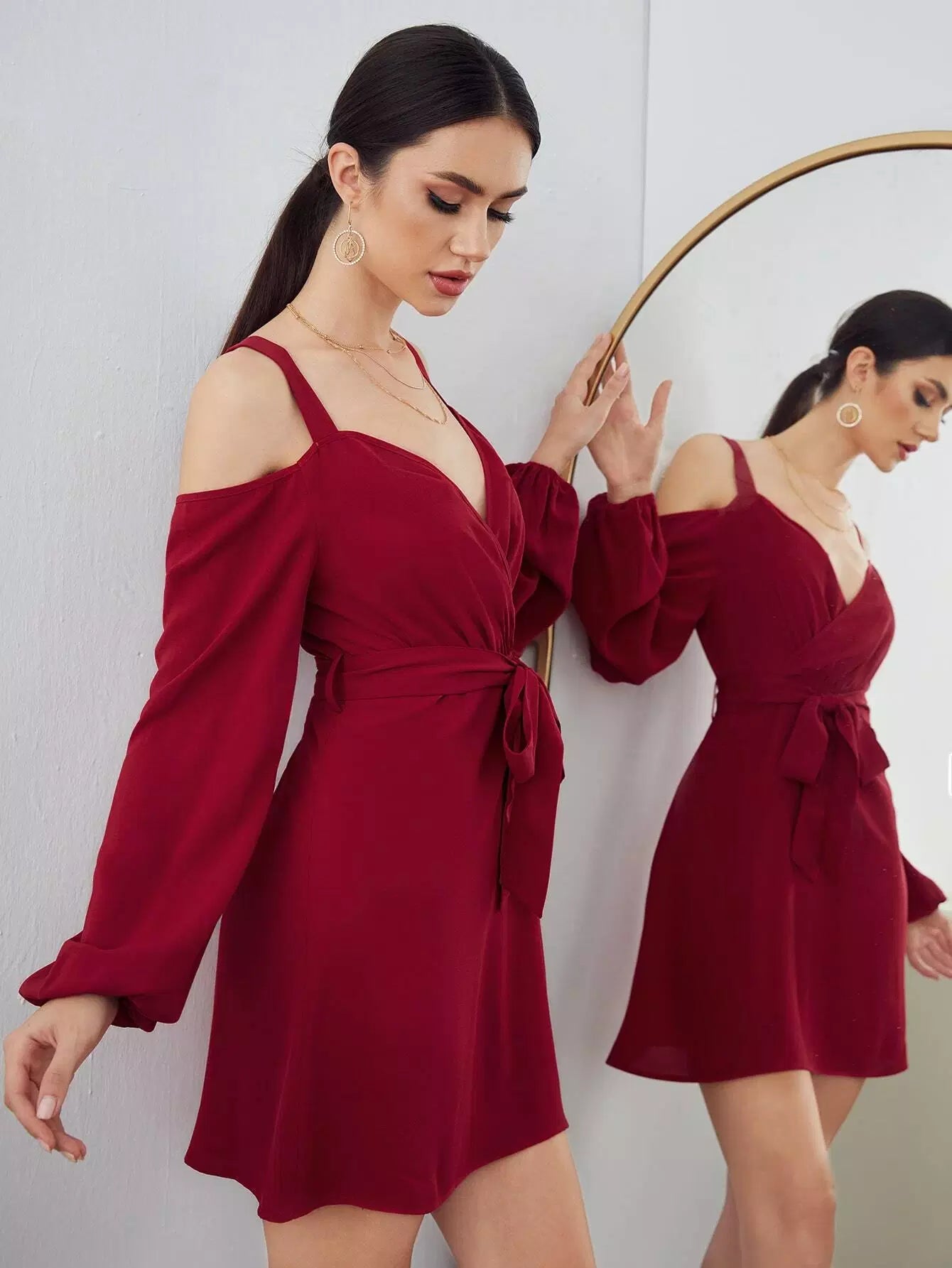 فستان سادة بربطة عنق ذات أكتاف باردة سادة
