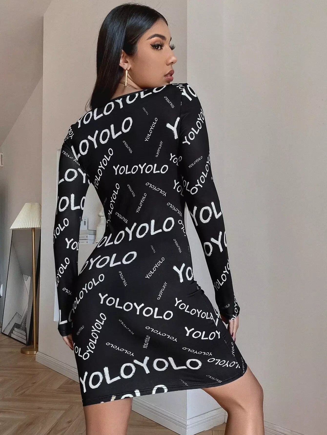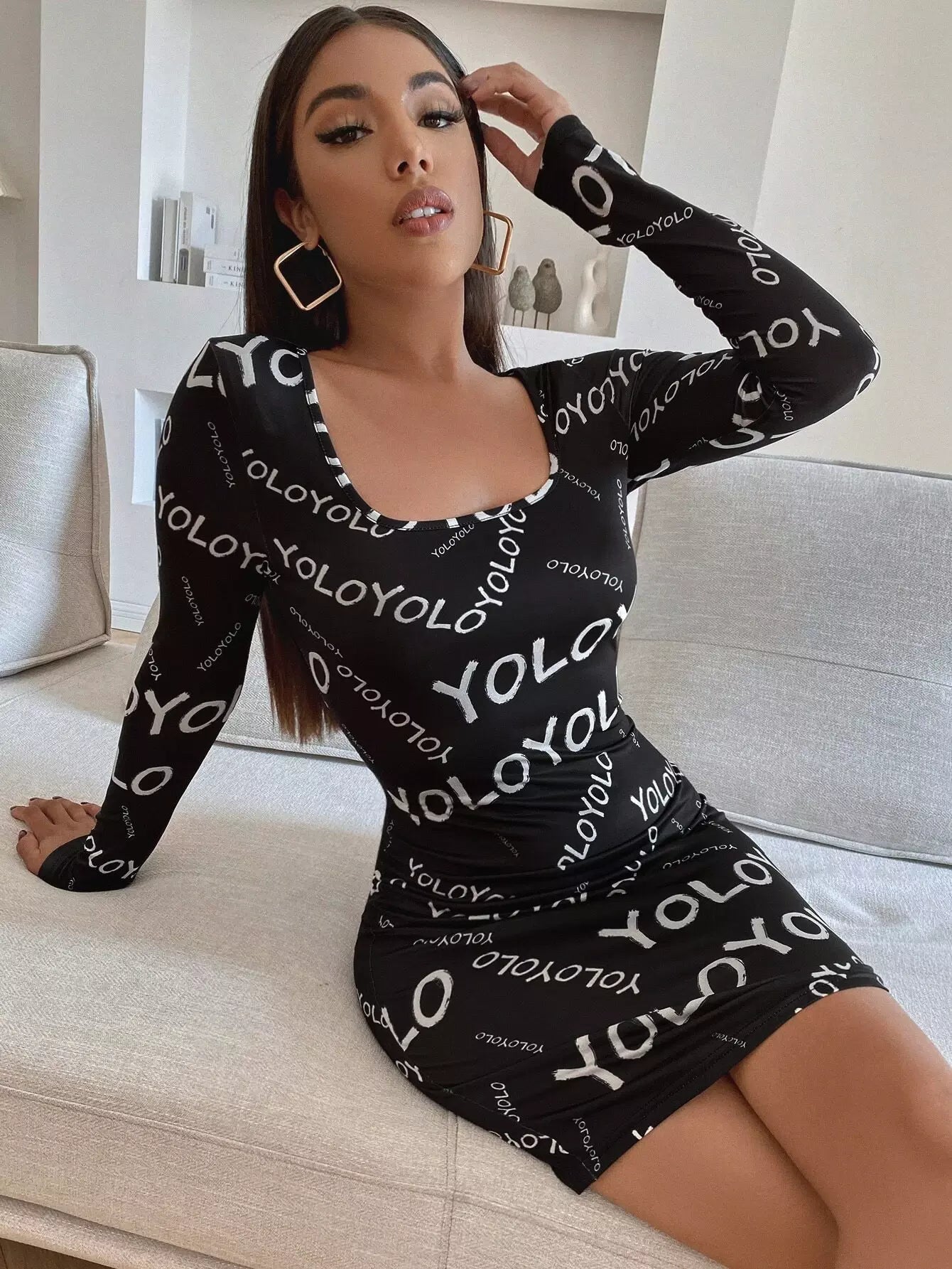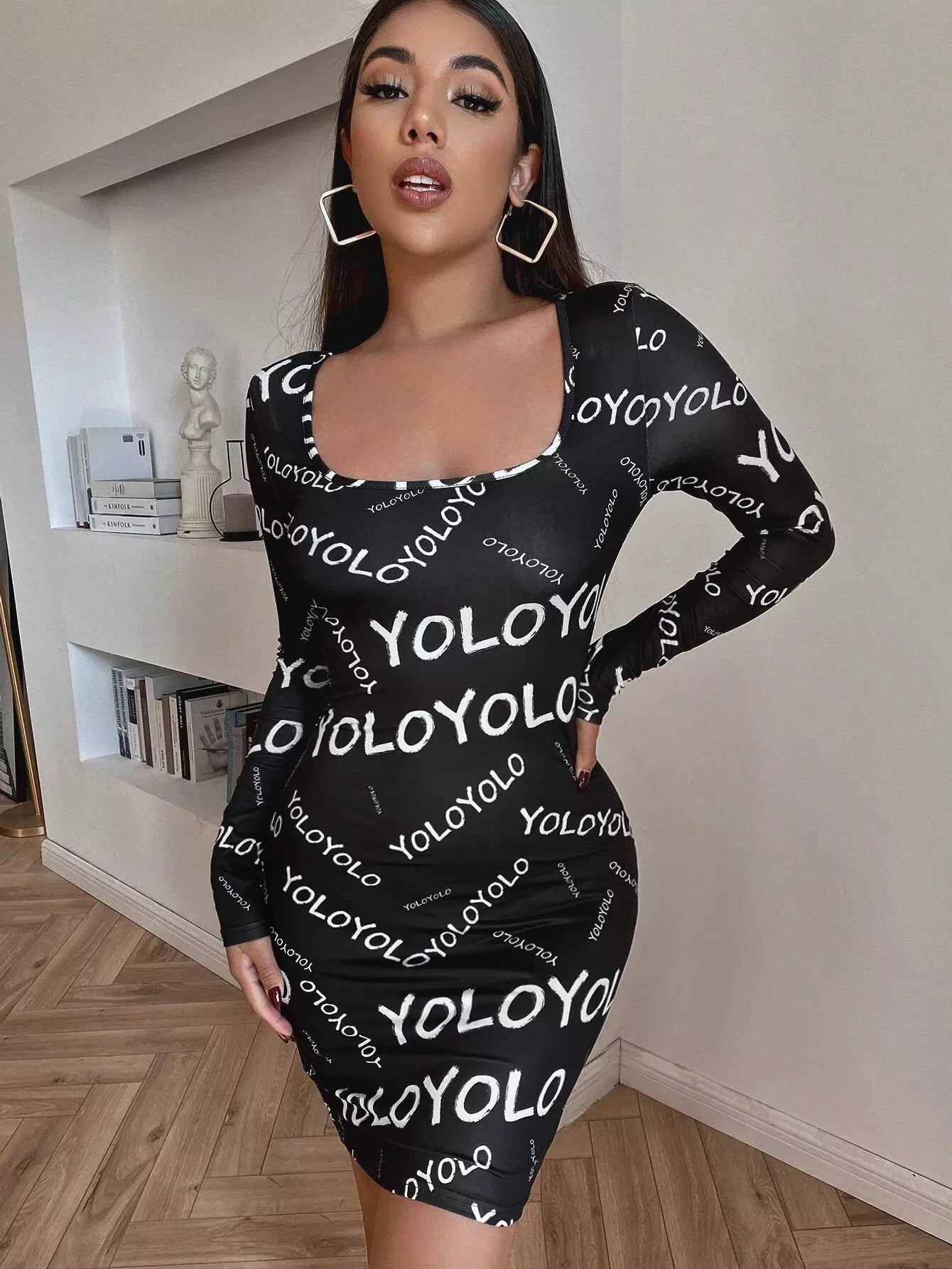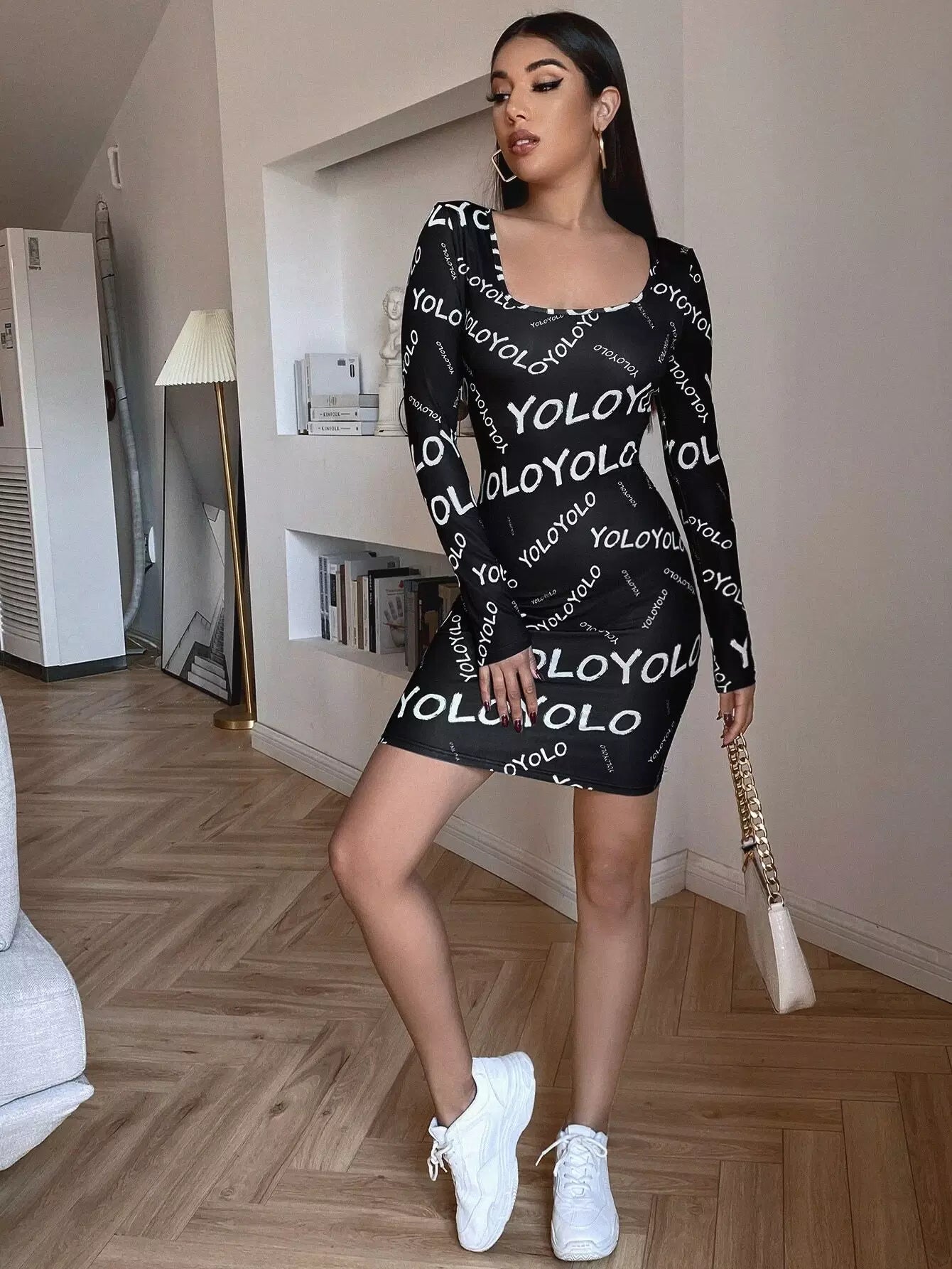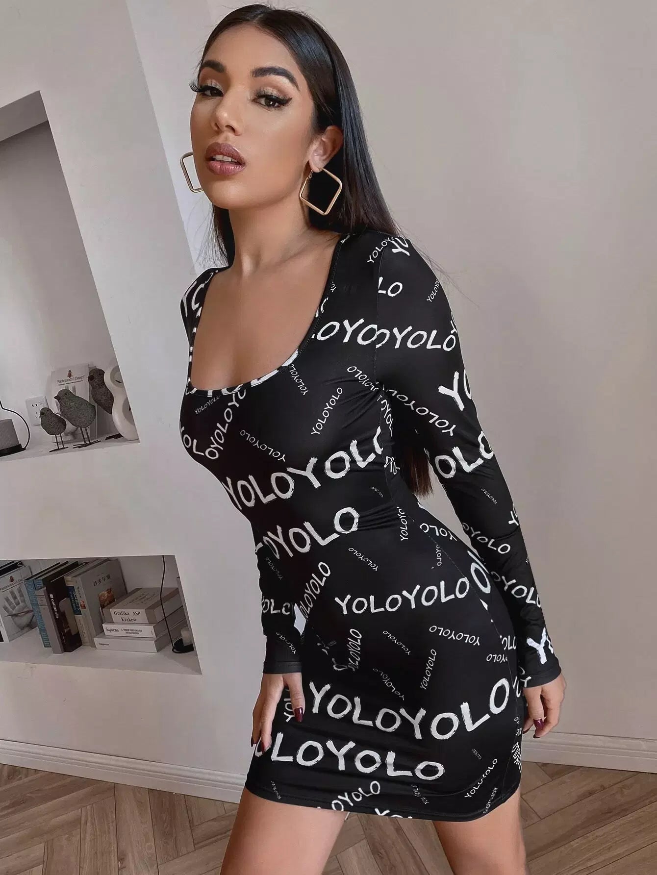 فستان بوديكون بياقة مربعة برقبة مربعة برسومات على شكل حرف
