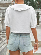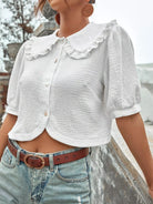 بلوزة قصيرة ذات ياقة منفوخة بأكمام منفوخة وأزرار منفوخة