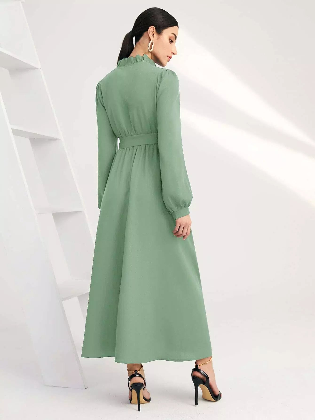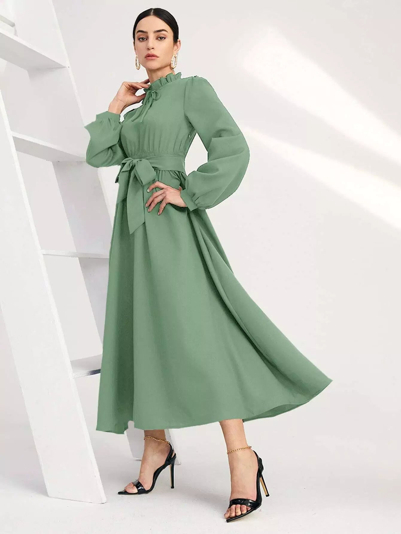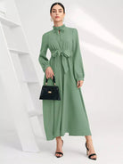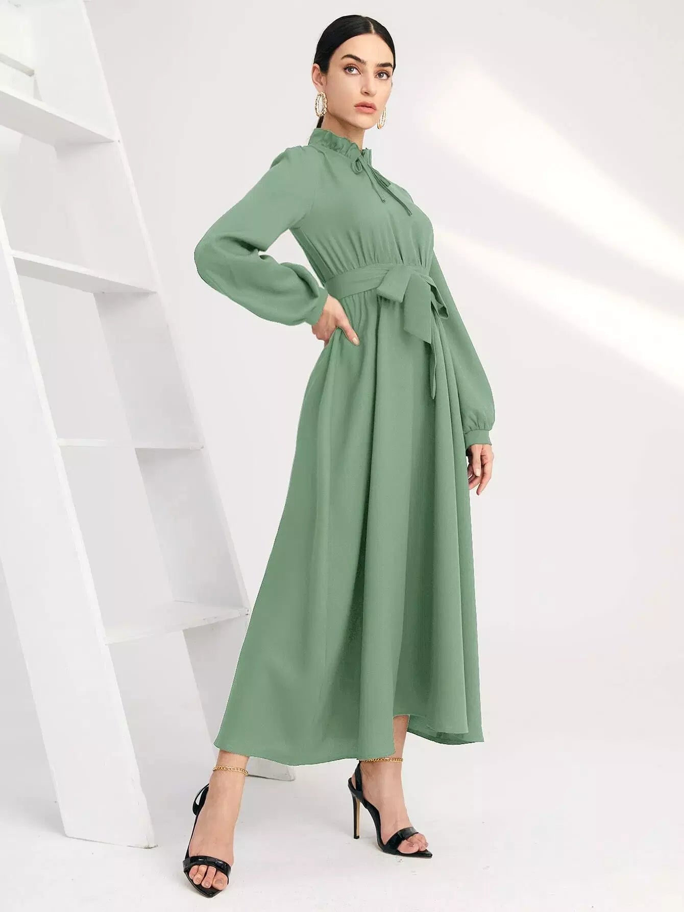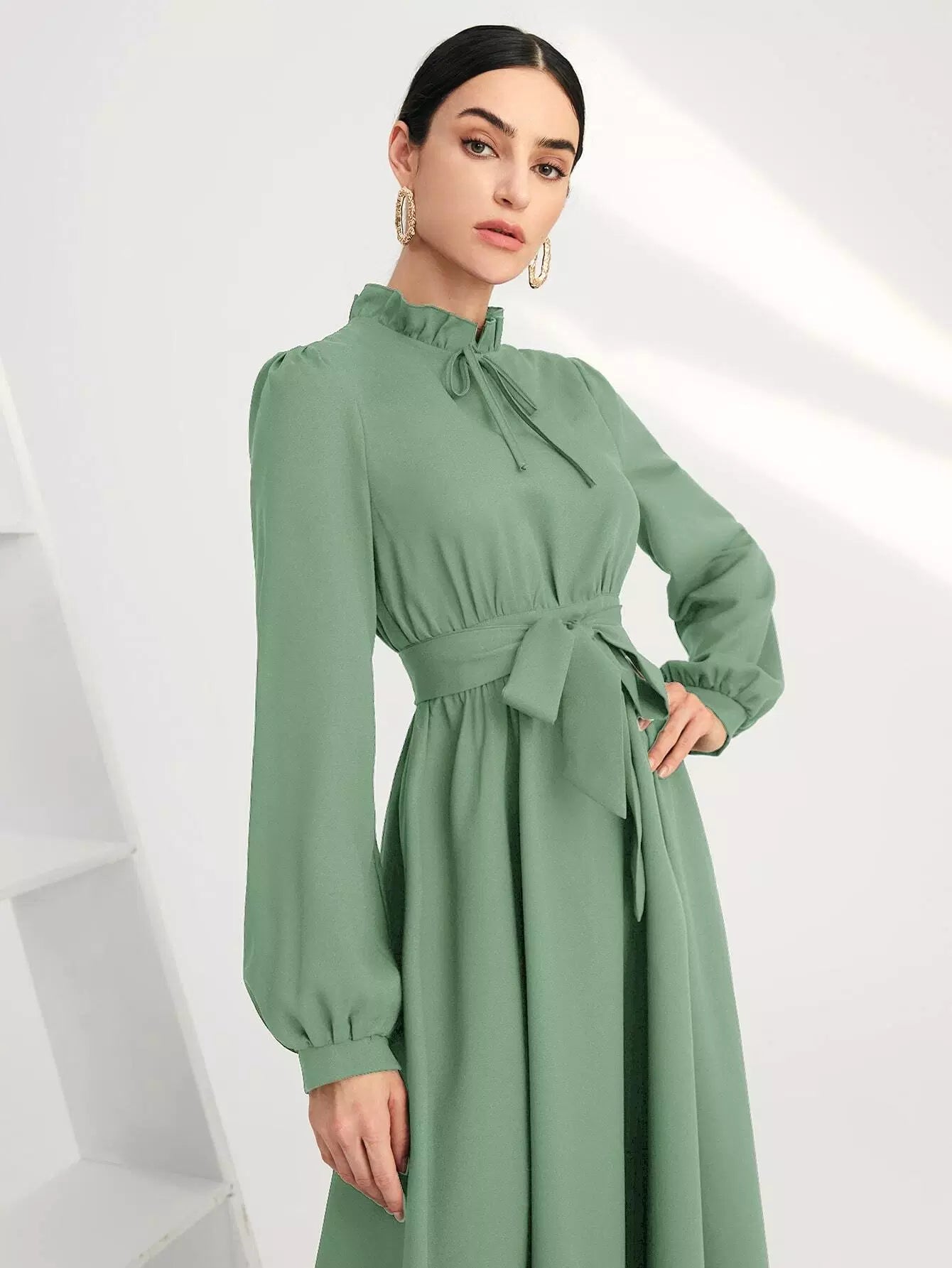 فستان بأكمام أسقف وياقة مربوطة بدون حزام