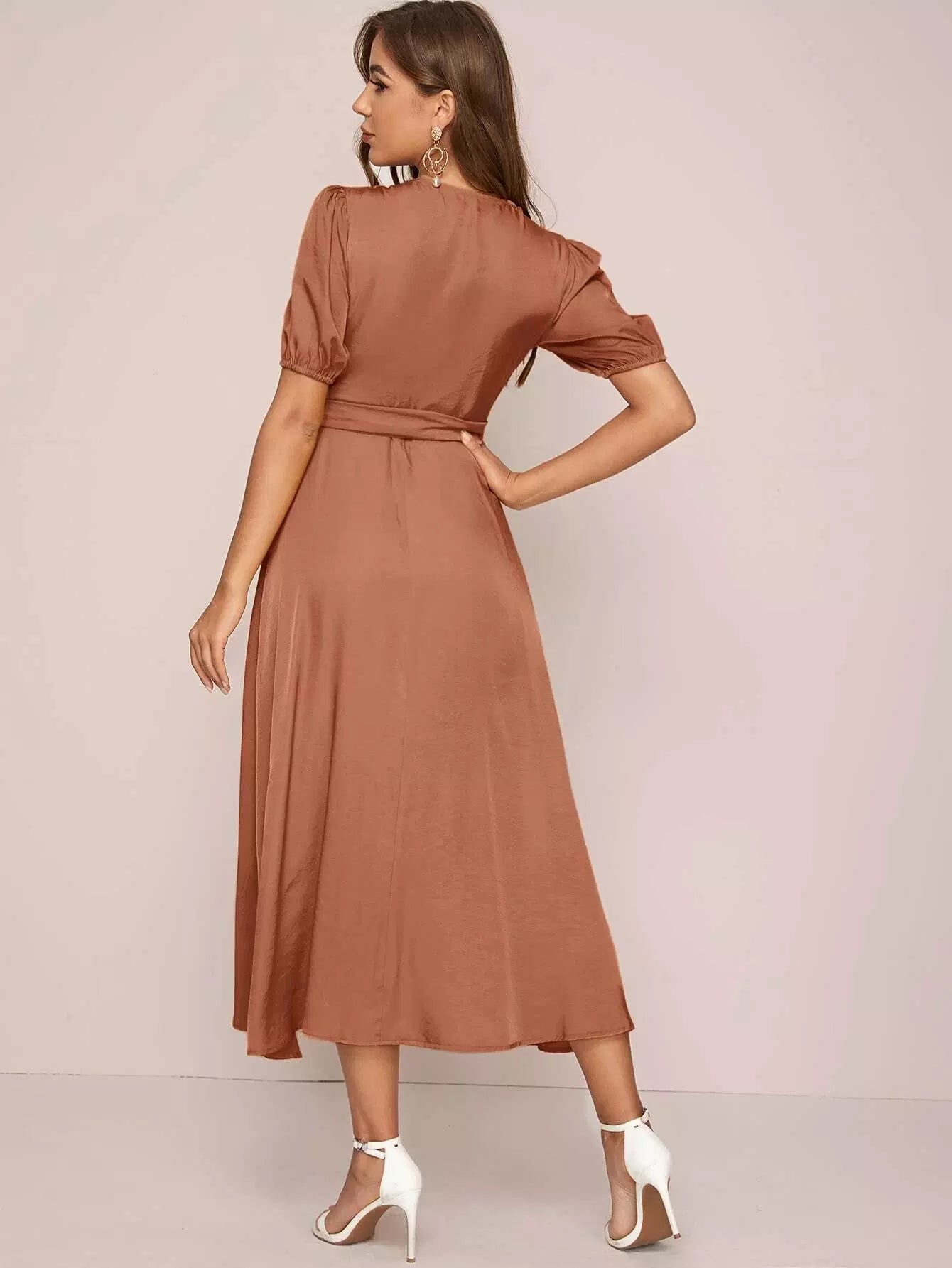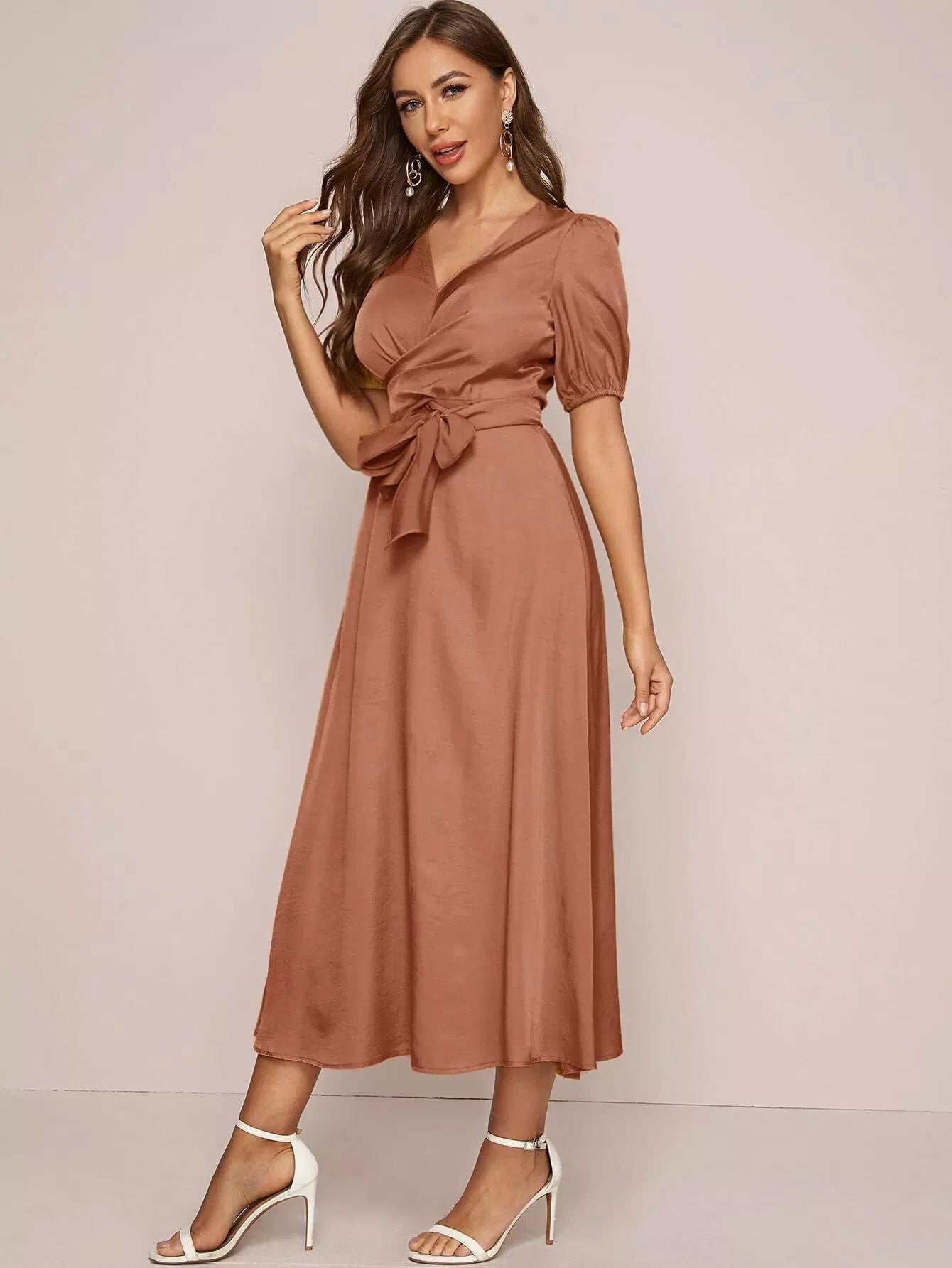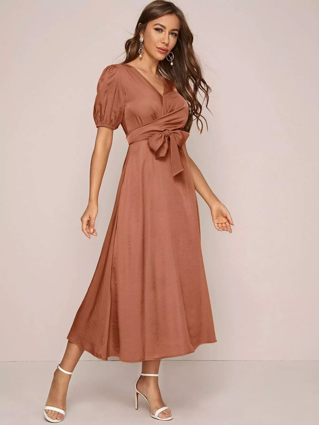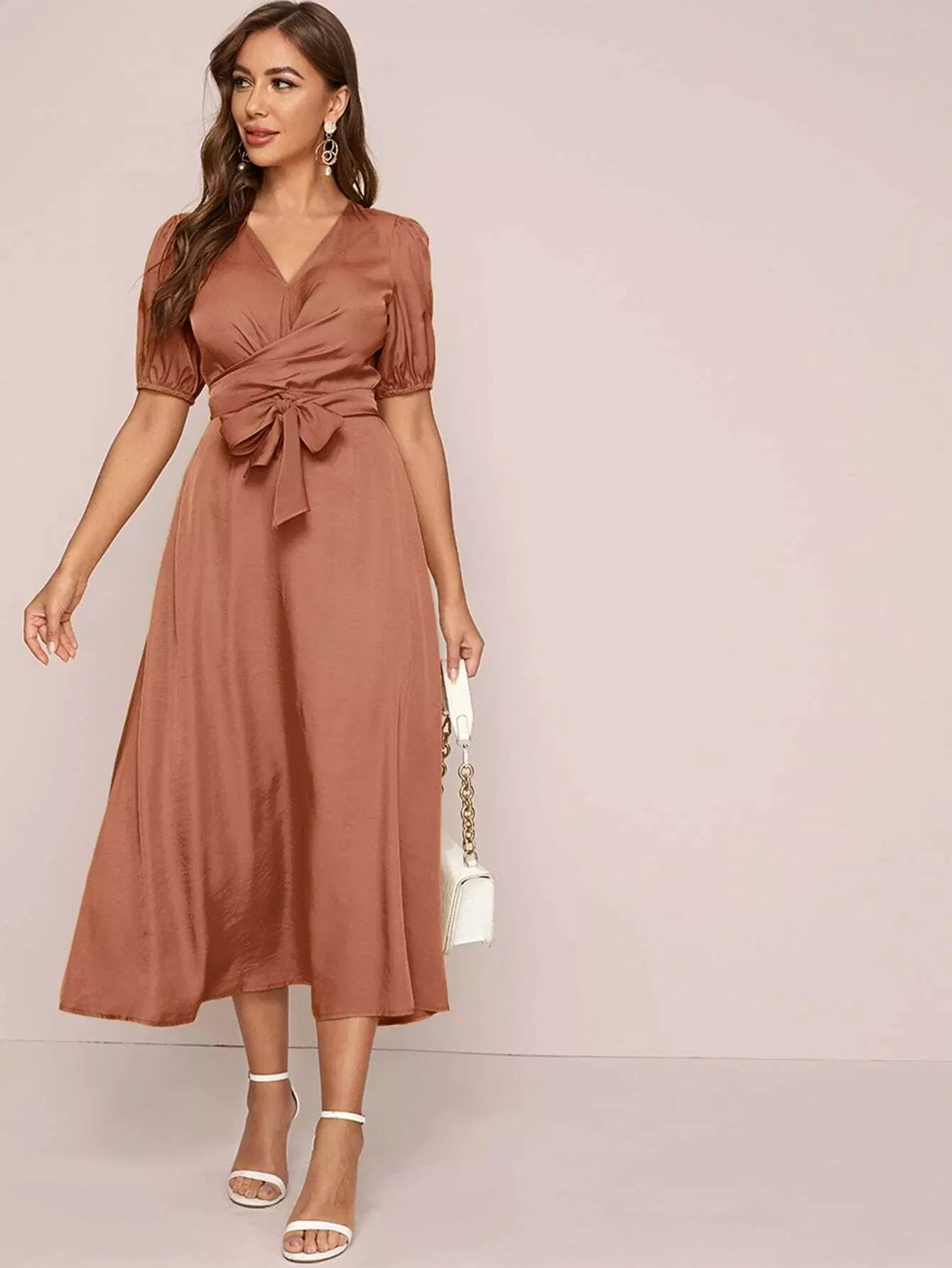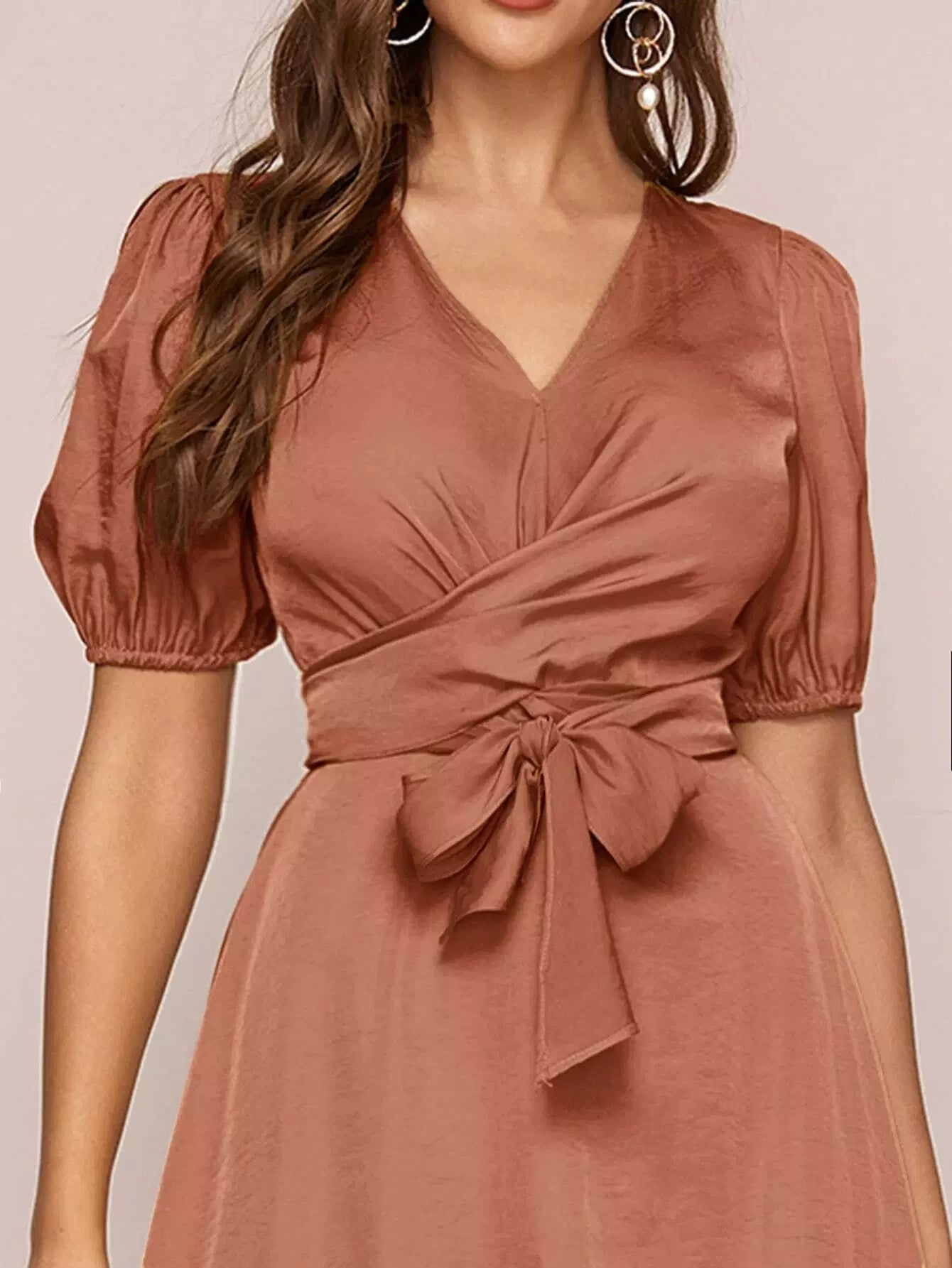 فستان بأكمام منفوشة بأكمام ملتوية من الأمام وربطة عنق ذاتية