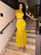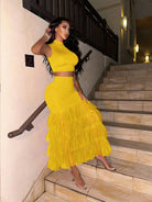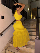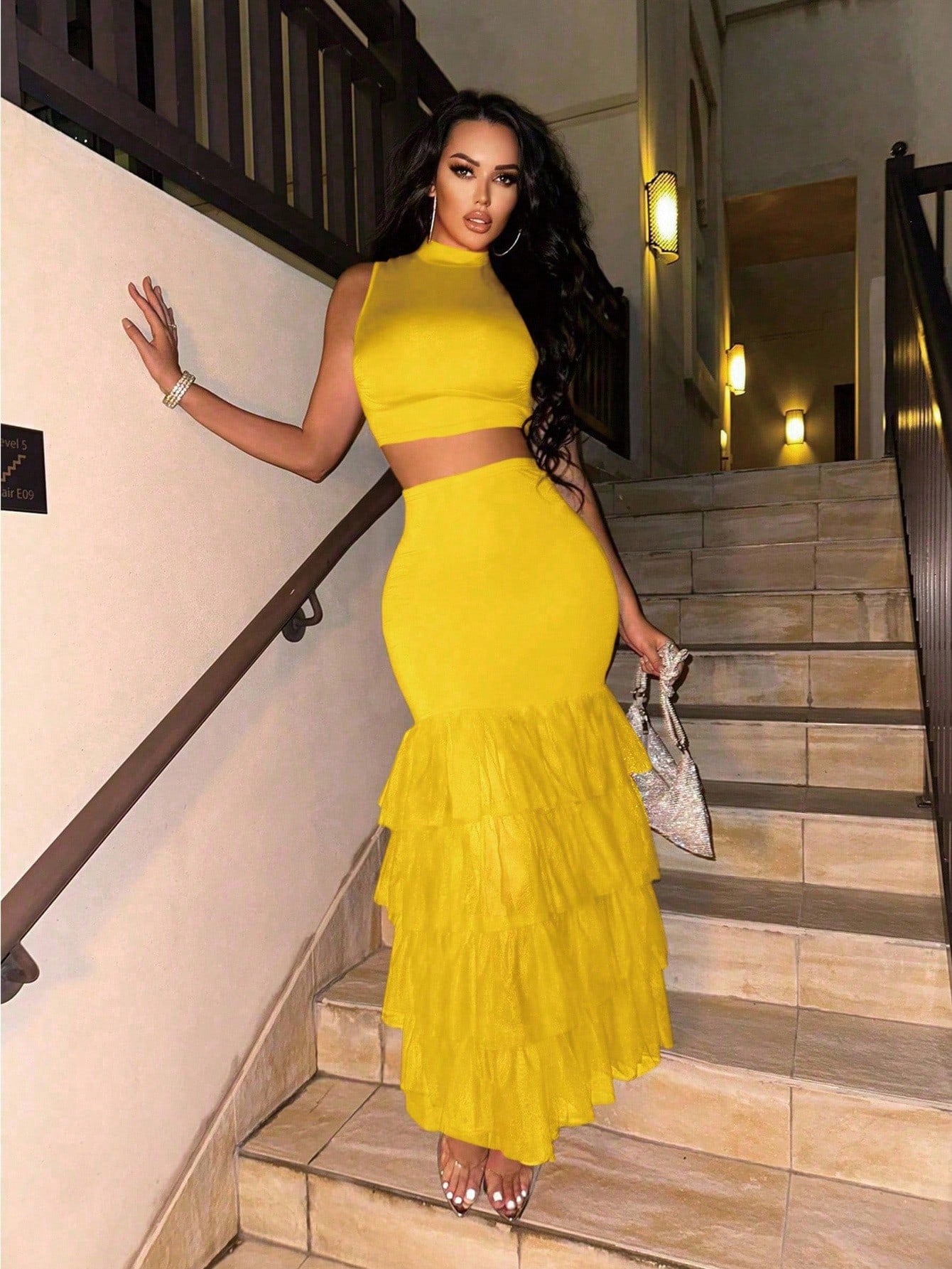 women VaVaBold Solid Color Stand Collar Tank Top & Multi-Layer Ruffle Hem Skirt Two-Piece Set