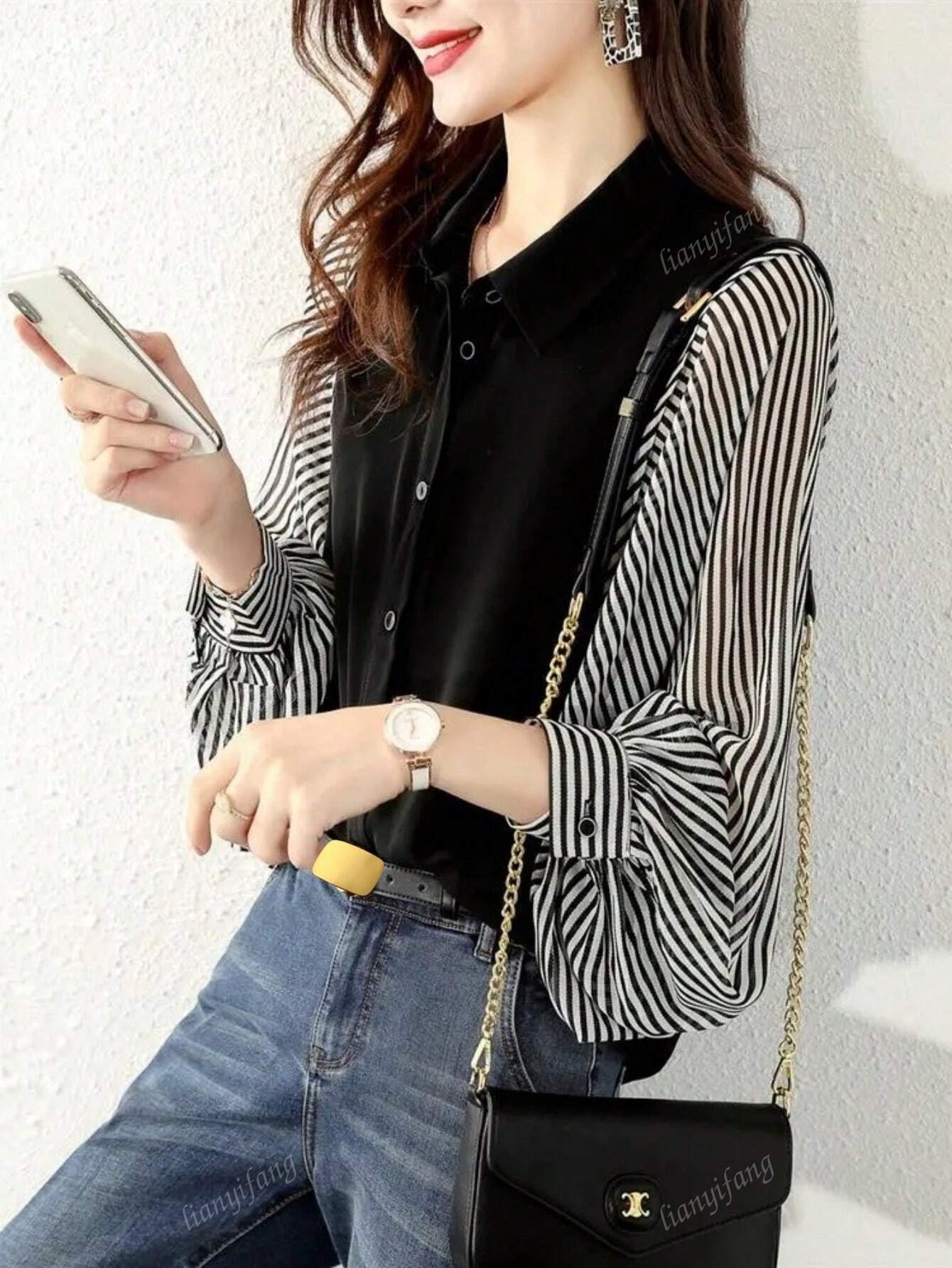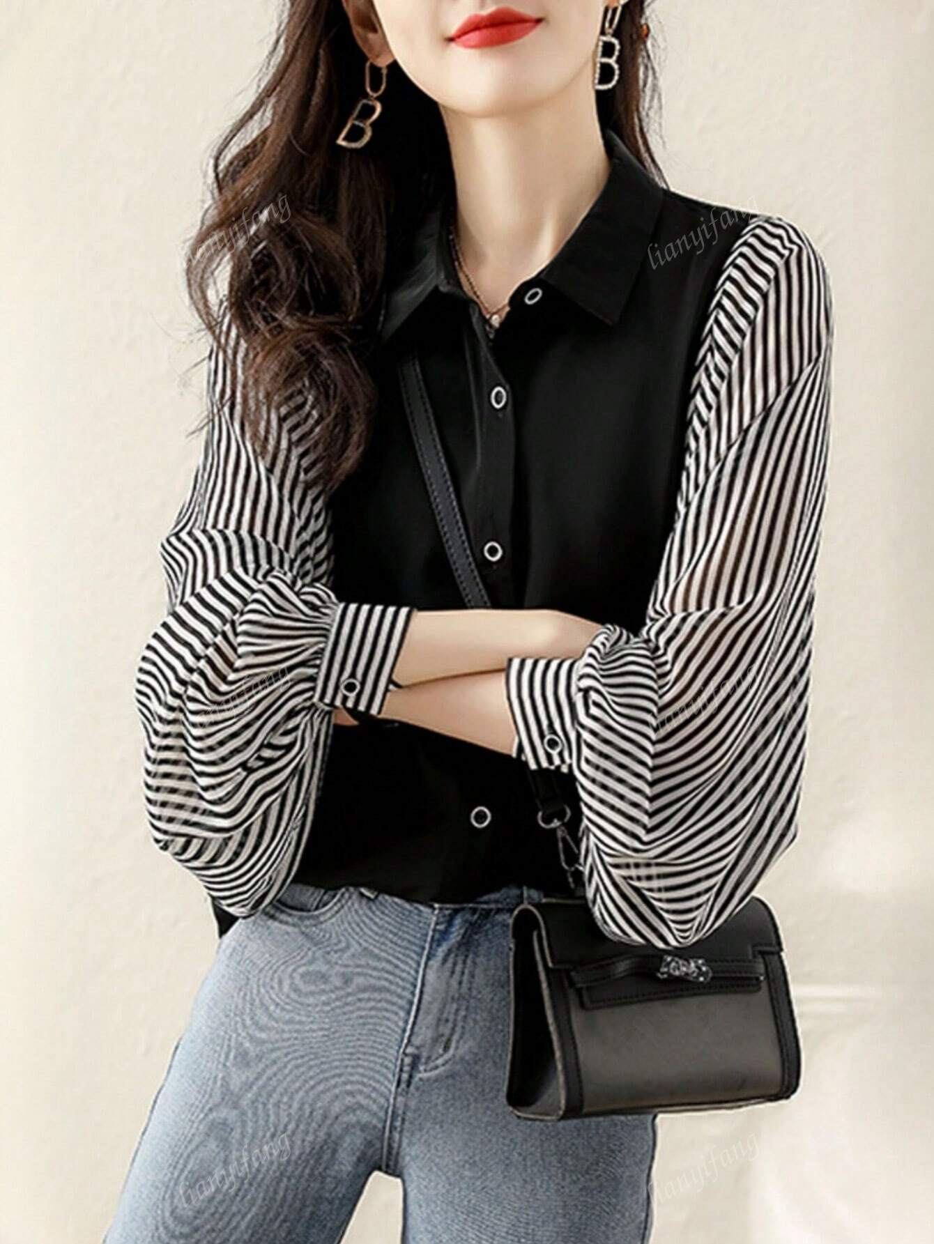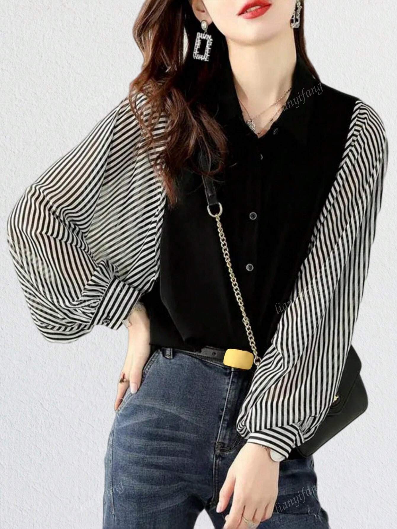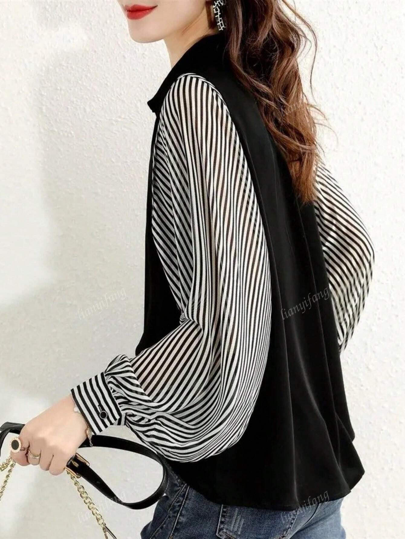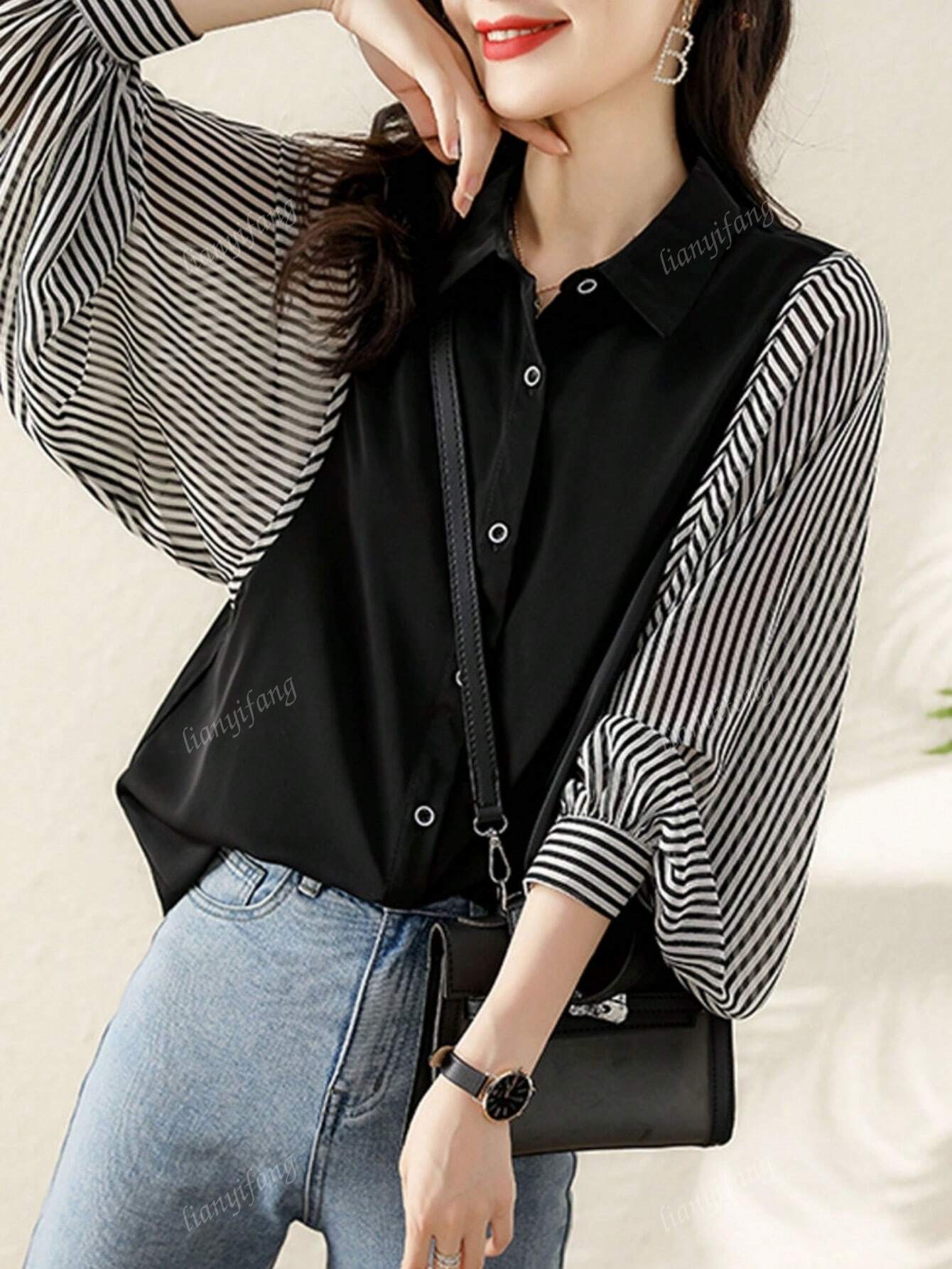 YUXIN 2025 Spring & Summer Korean - Style Striped Patchwork Shirt, Lantern - Sleeve Chiffon Patchwork,