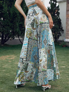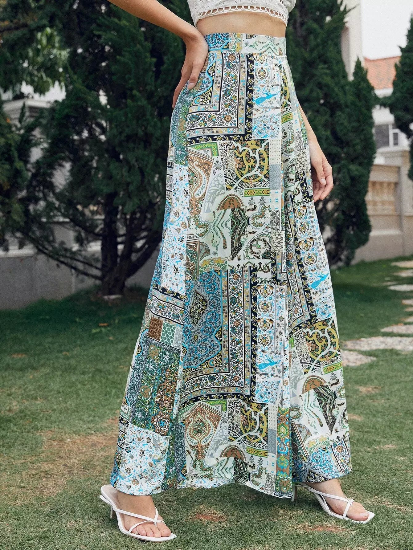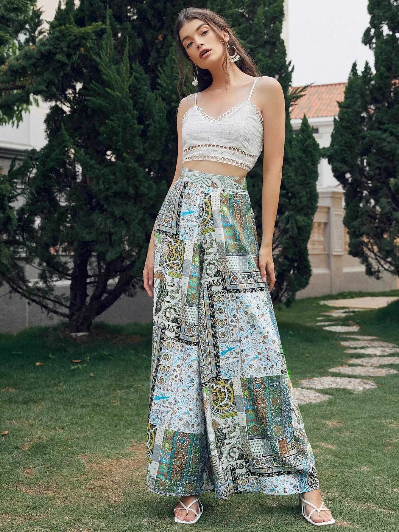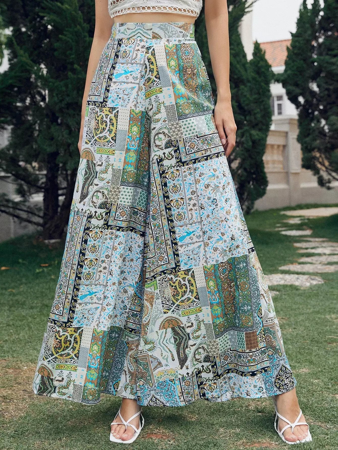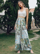 بنطال واسع الساق بطبعة مرقعة وسحاب خلفي