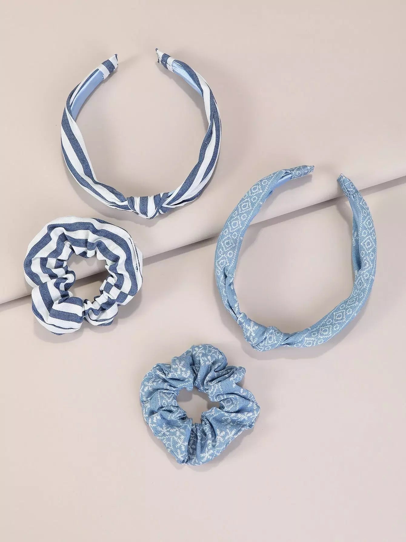 2 قطعة من طوق الشعر المخطط بنمط هندسي و2 قطعة من ربطة الشعر المطاطية