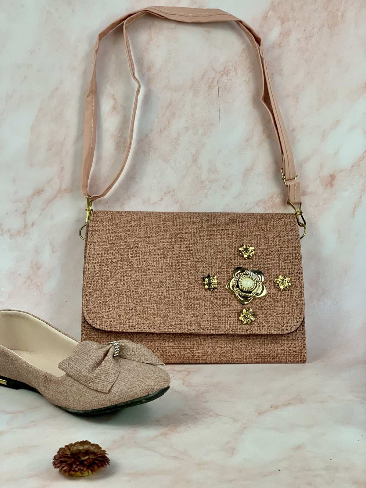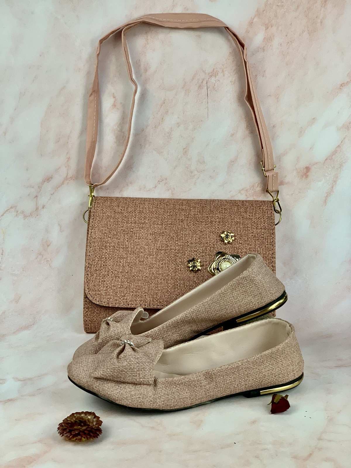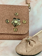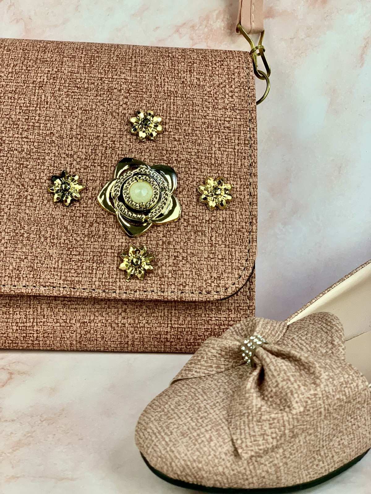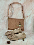 حقيبة وحذاء بيج بنمط نسيجي ذهبي مع زهرة معدنية مزخرفة