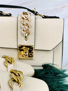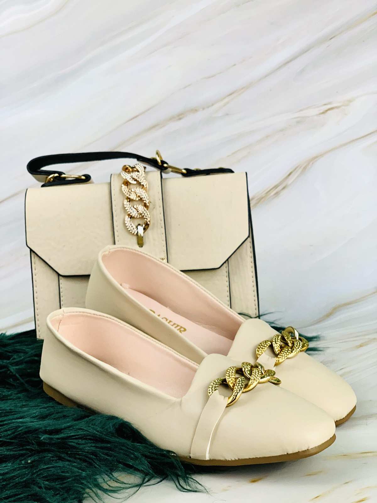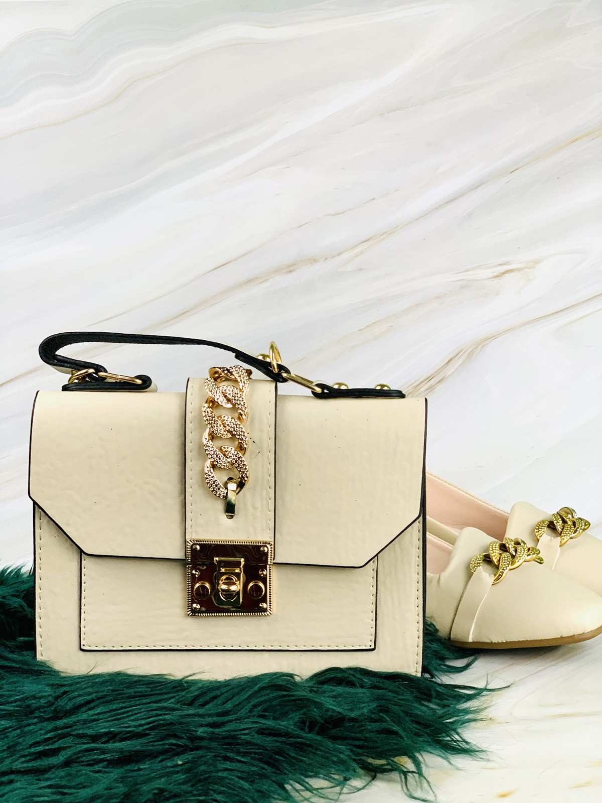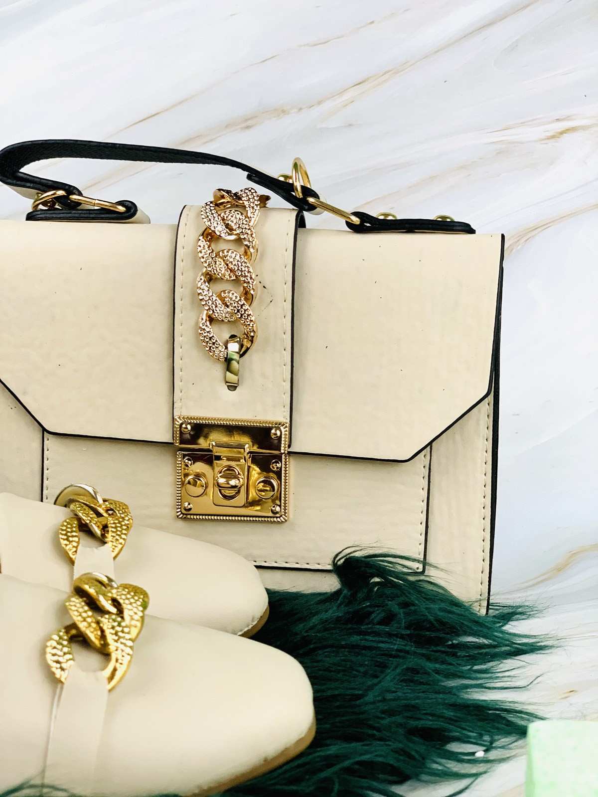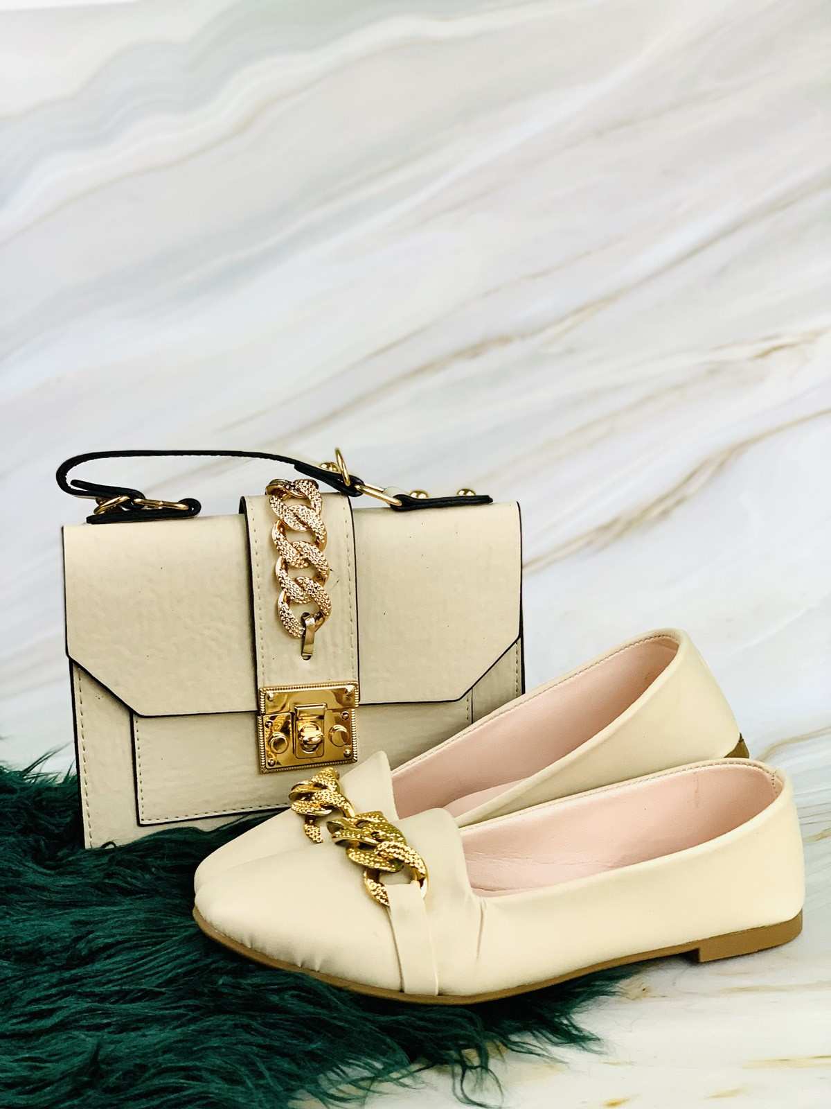 حقيبة وحذاء بيج مع حلقات ذهبية