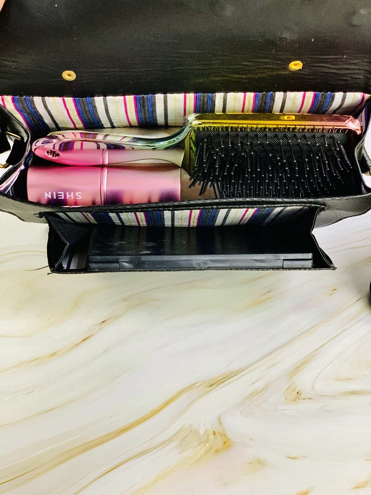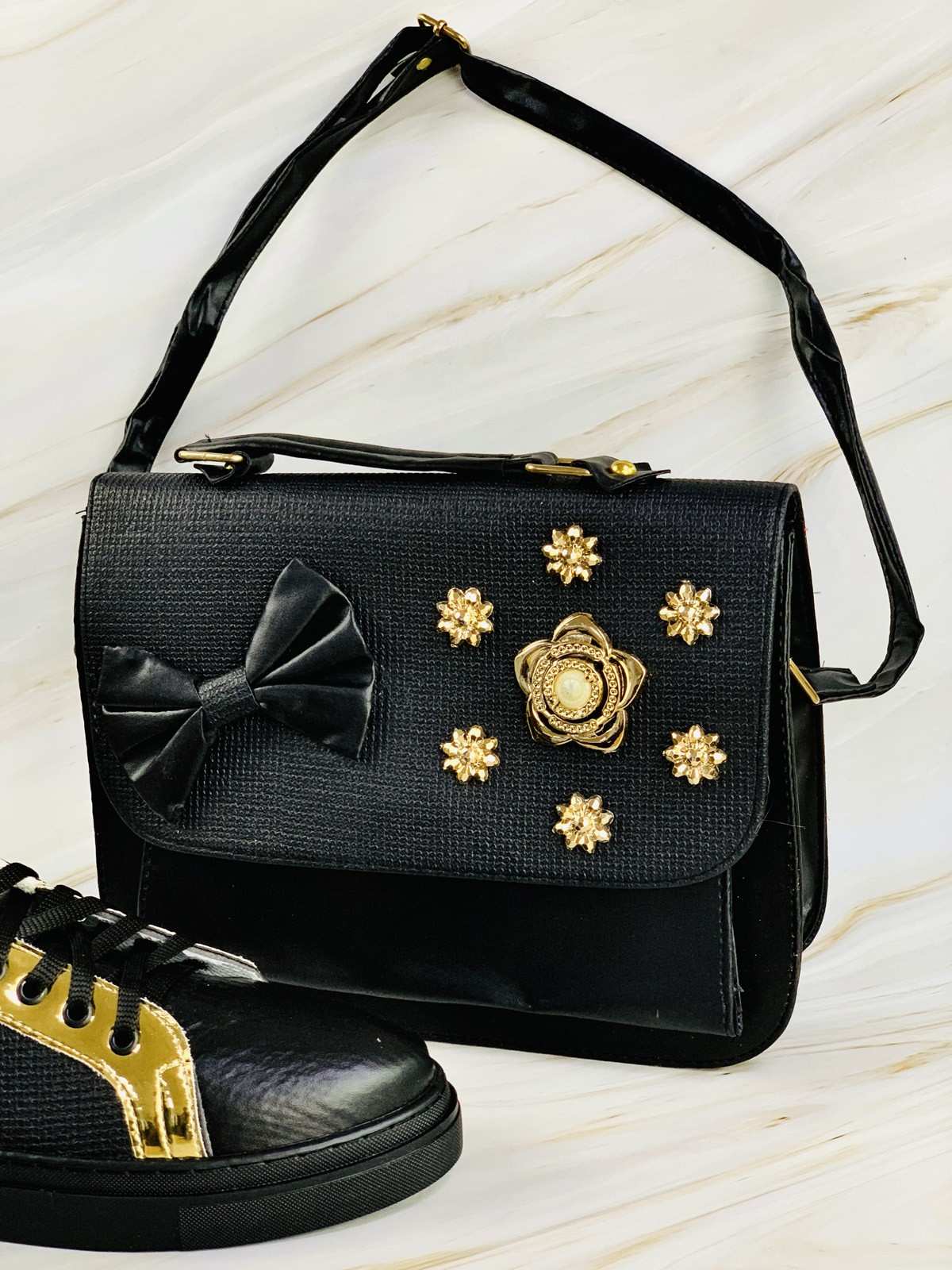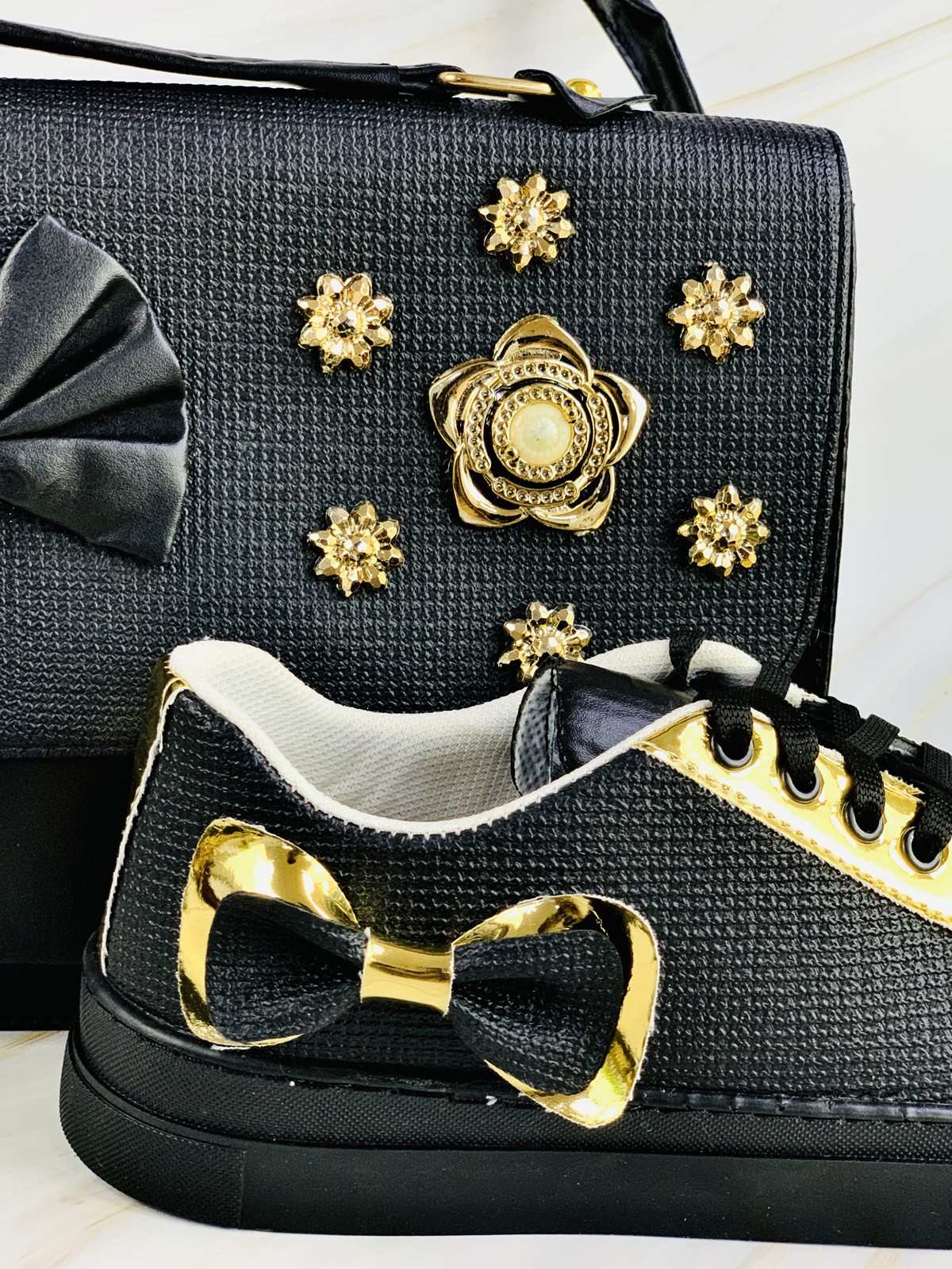 حقيبة سوداء وحذاء رياضي مزين بزهرة ذهبية