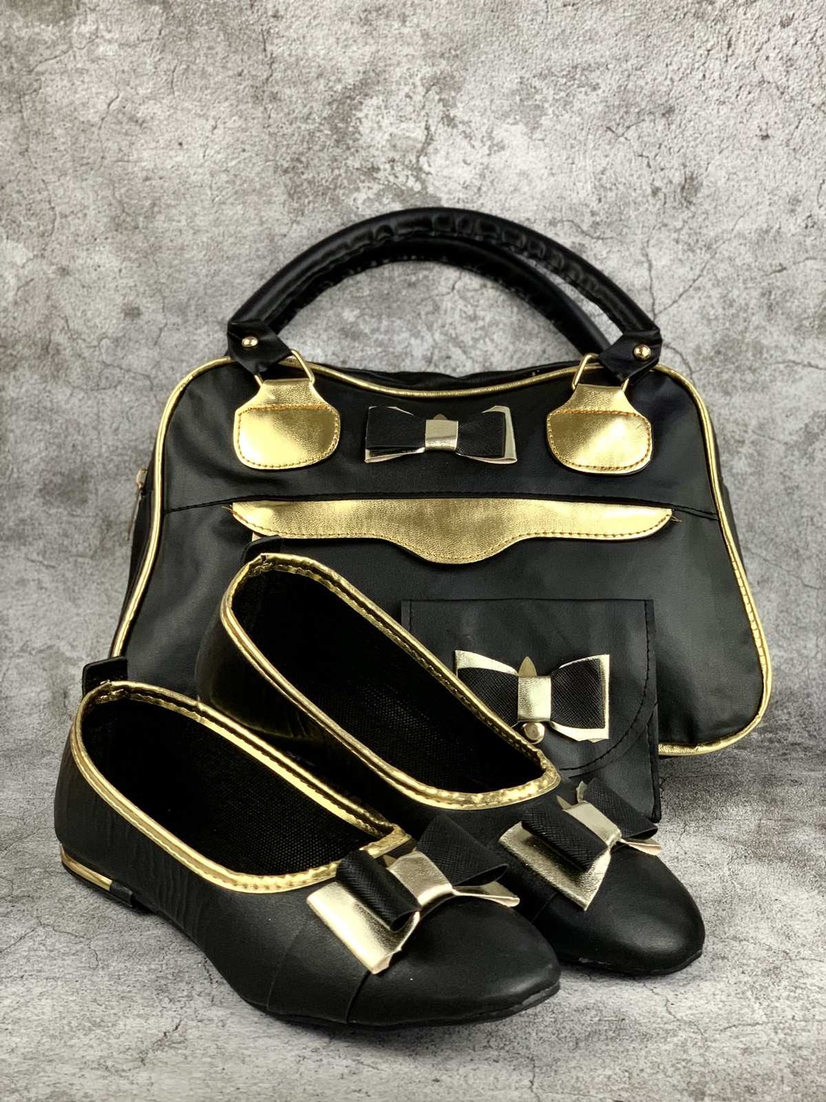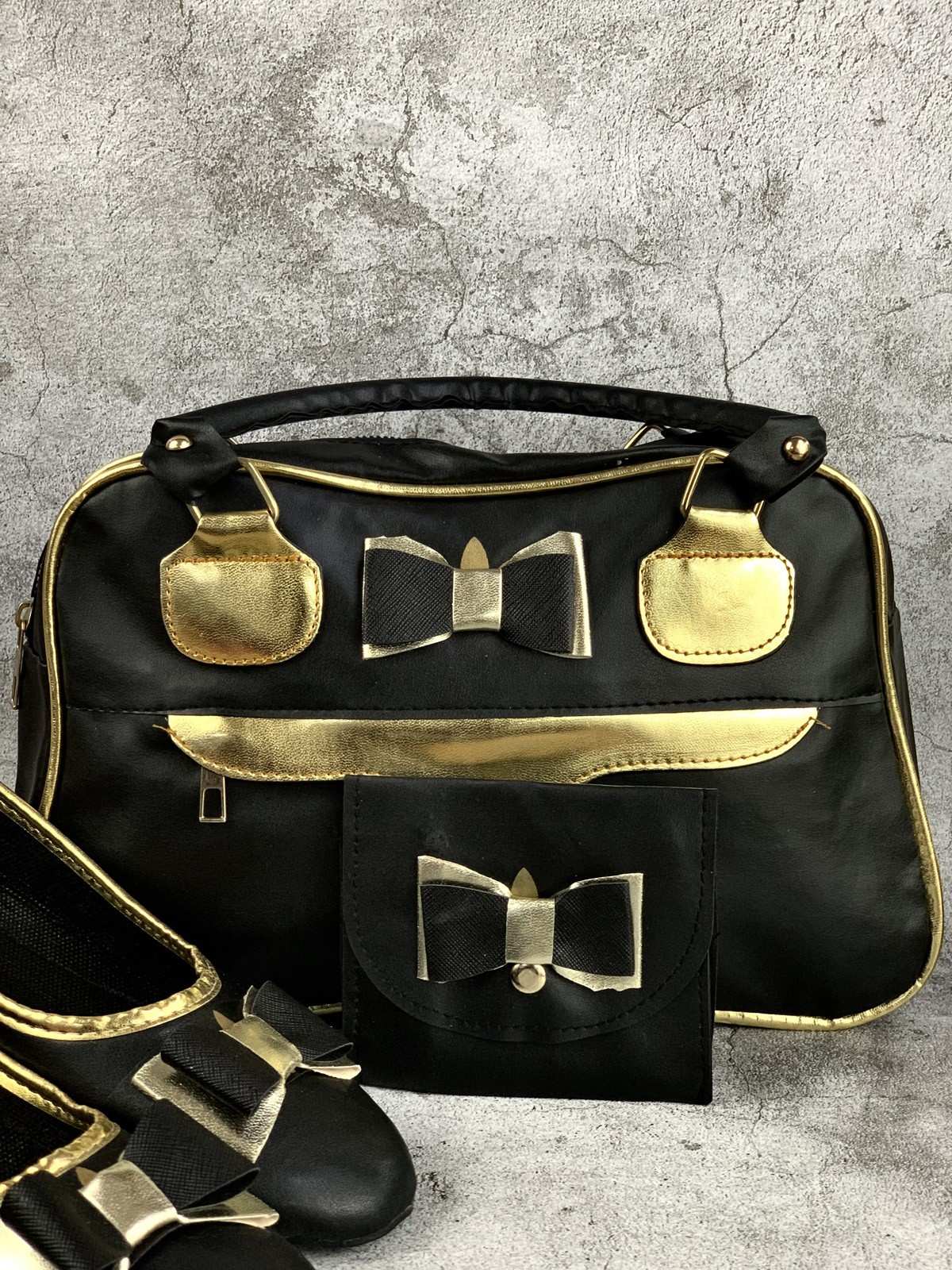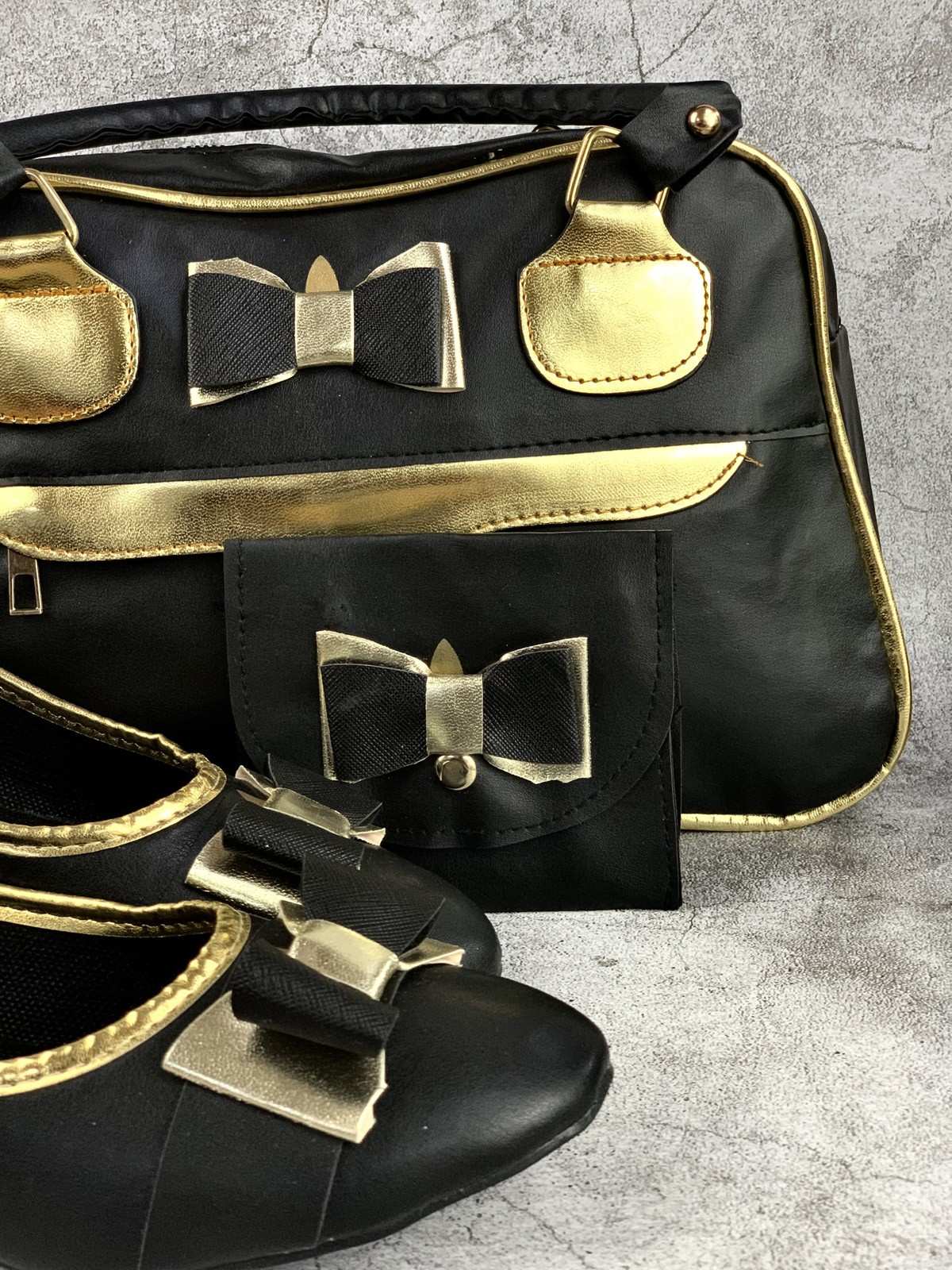 حقيبة ومحفظة وحذاء باللون الأسود مزين بزهرة ذهبية