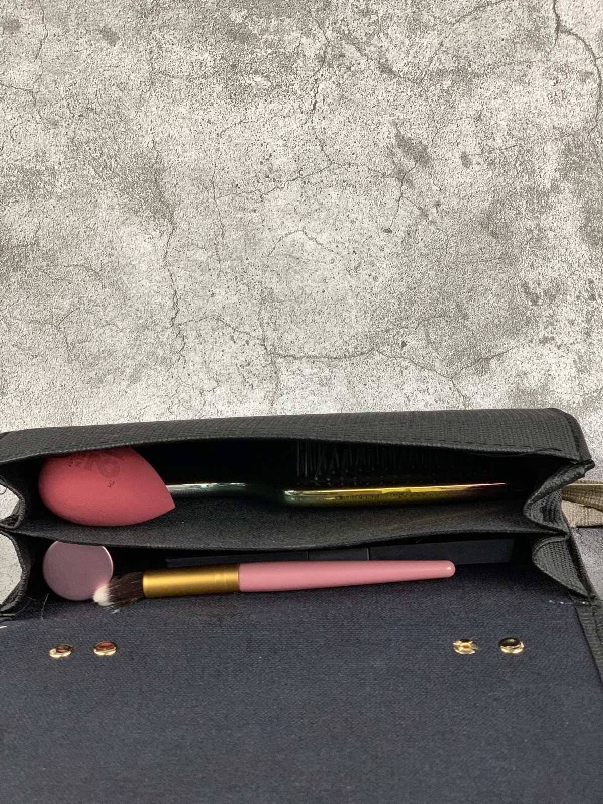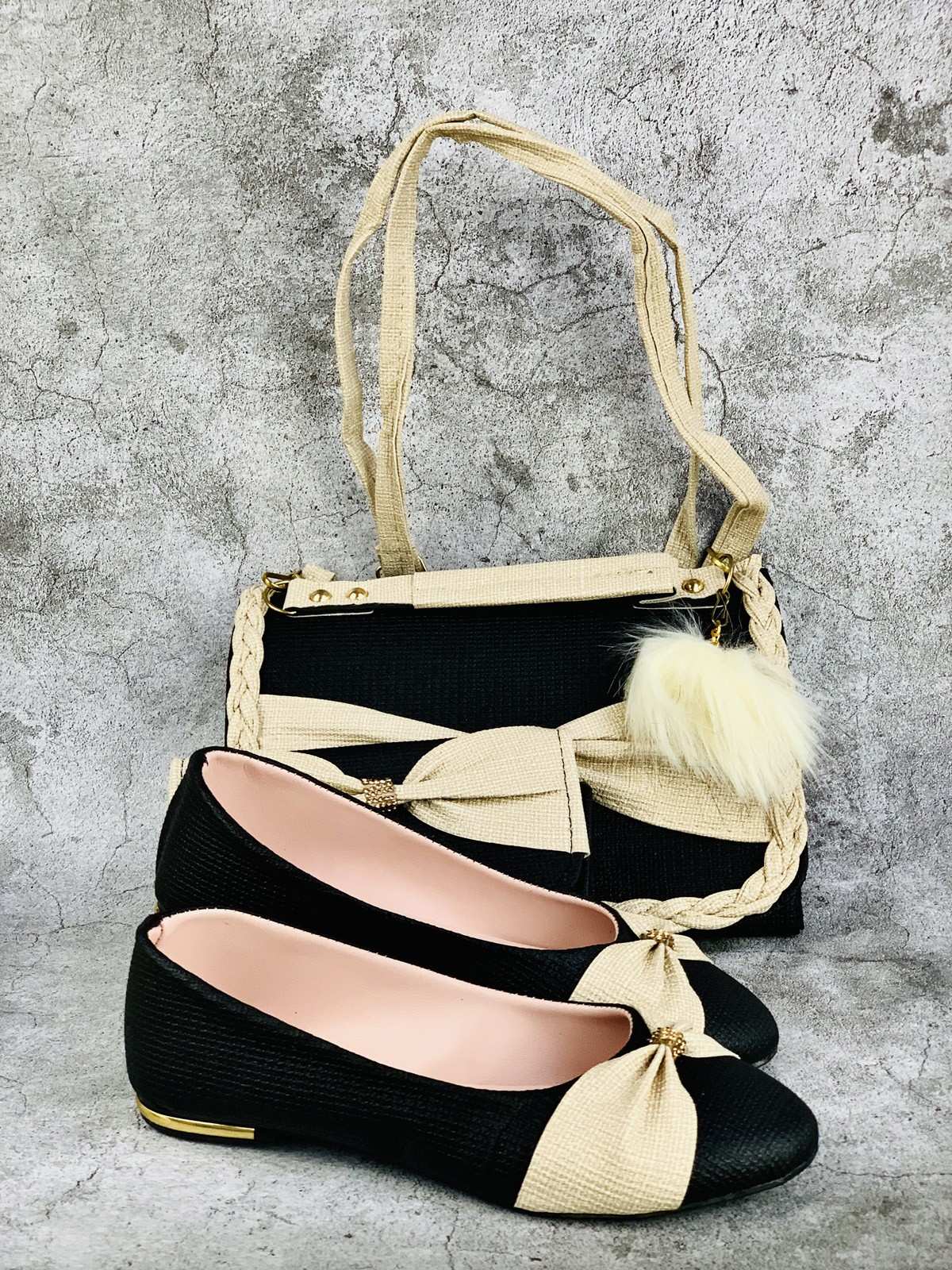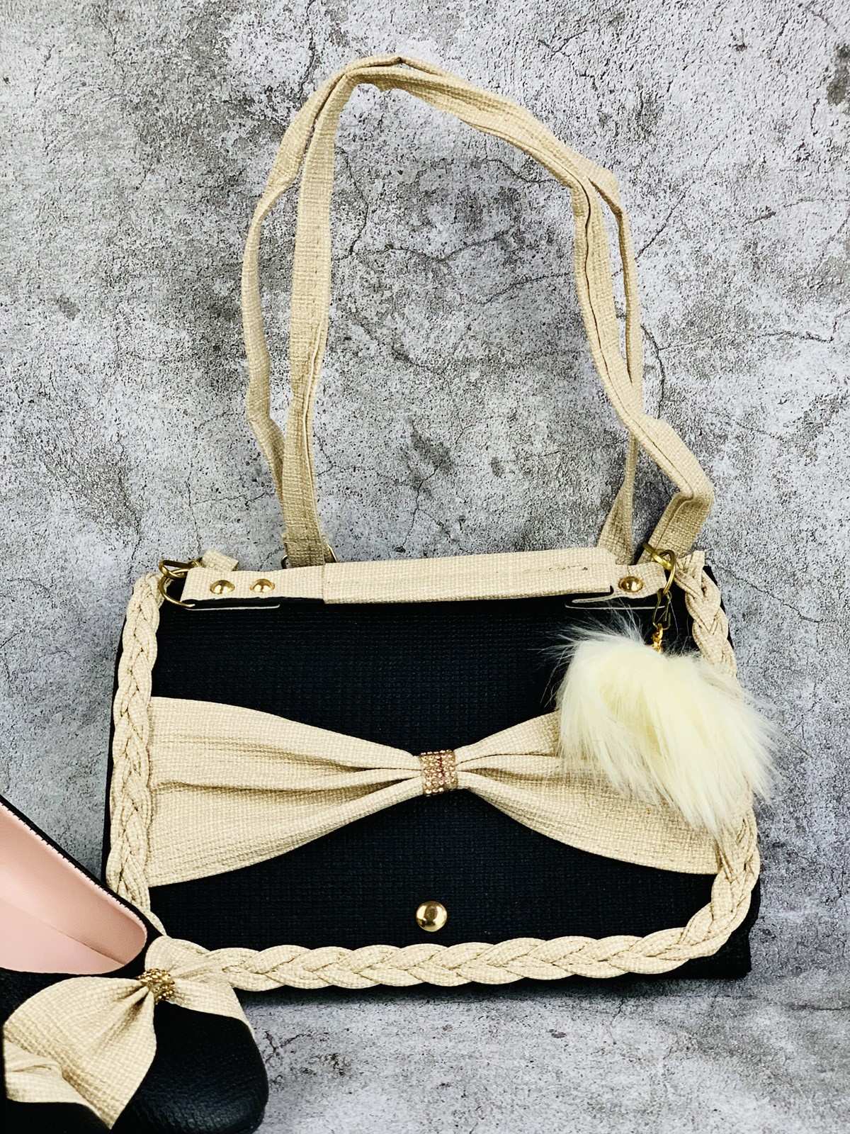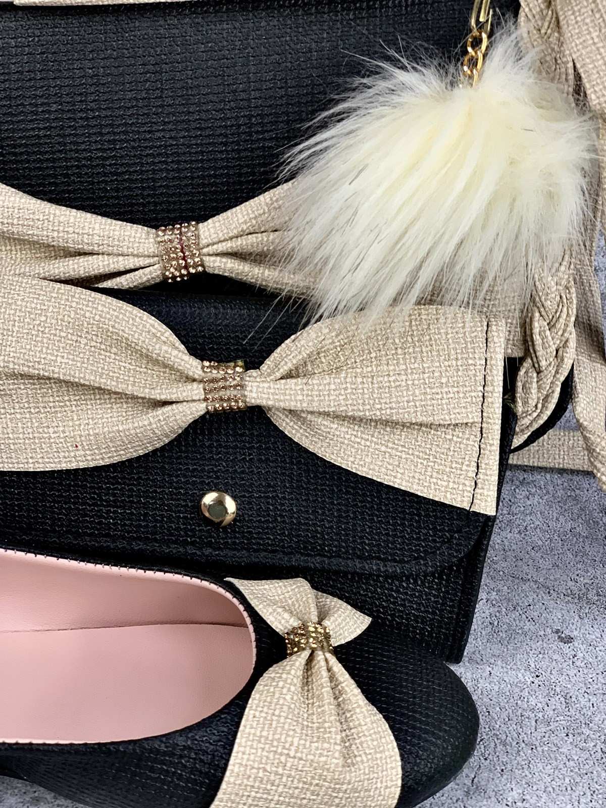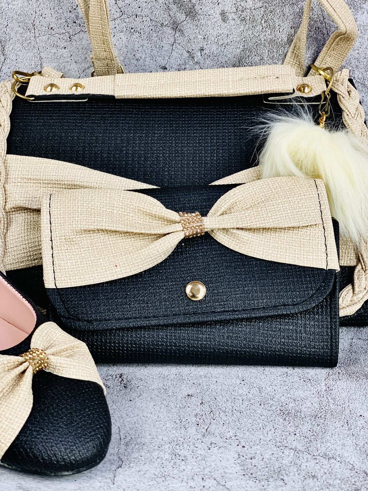 حقيبة وحذاء ومحفظة سوداء مع فيونكة مزخرفة على شكل زهرة مع فرو