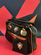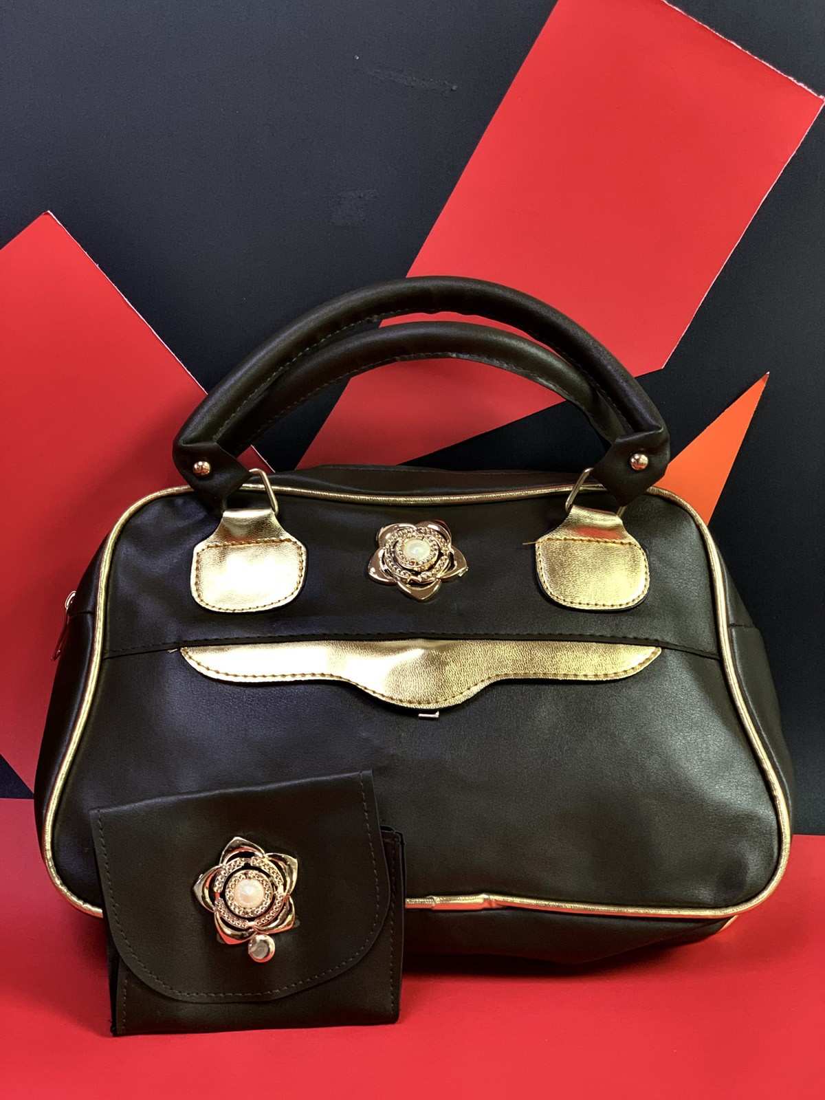 حقيبة سوداء مع محفظة وزهرة ذهبية