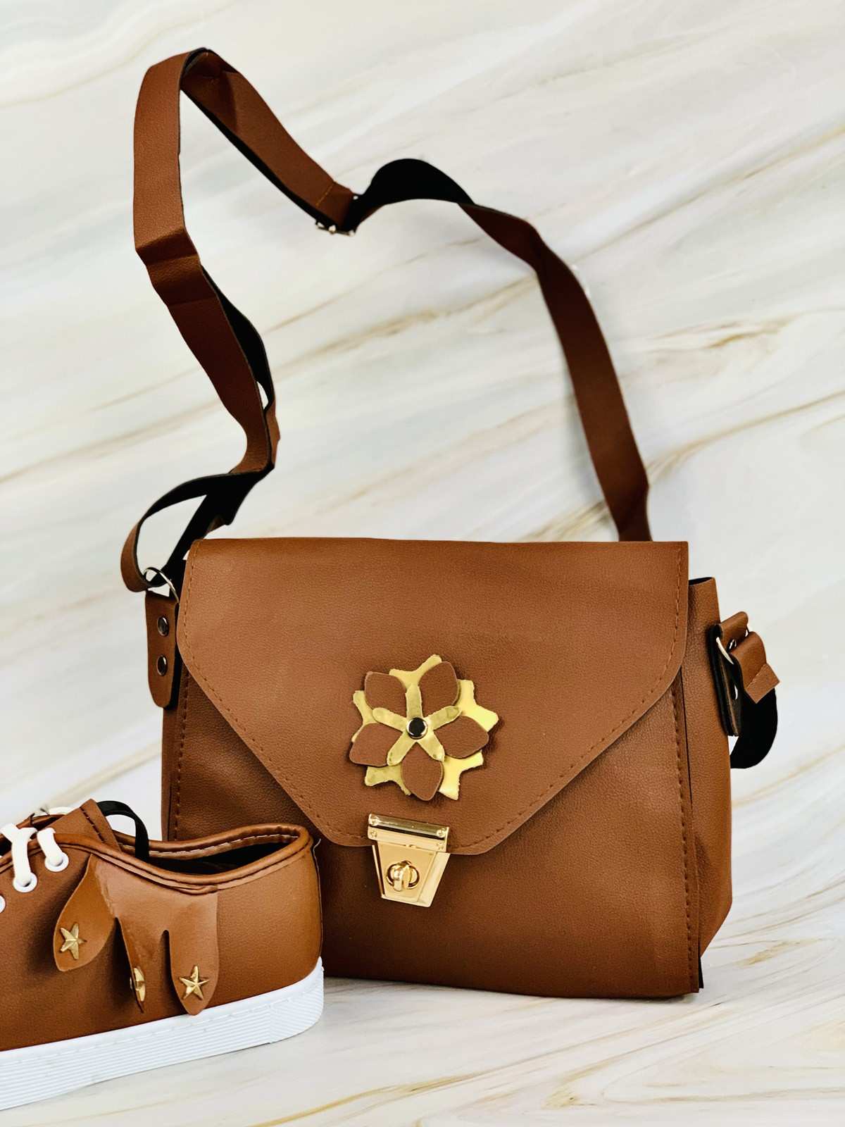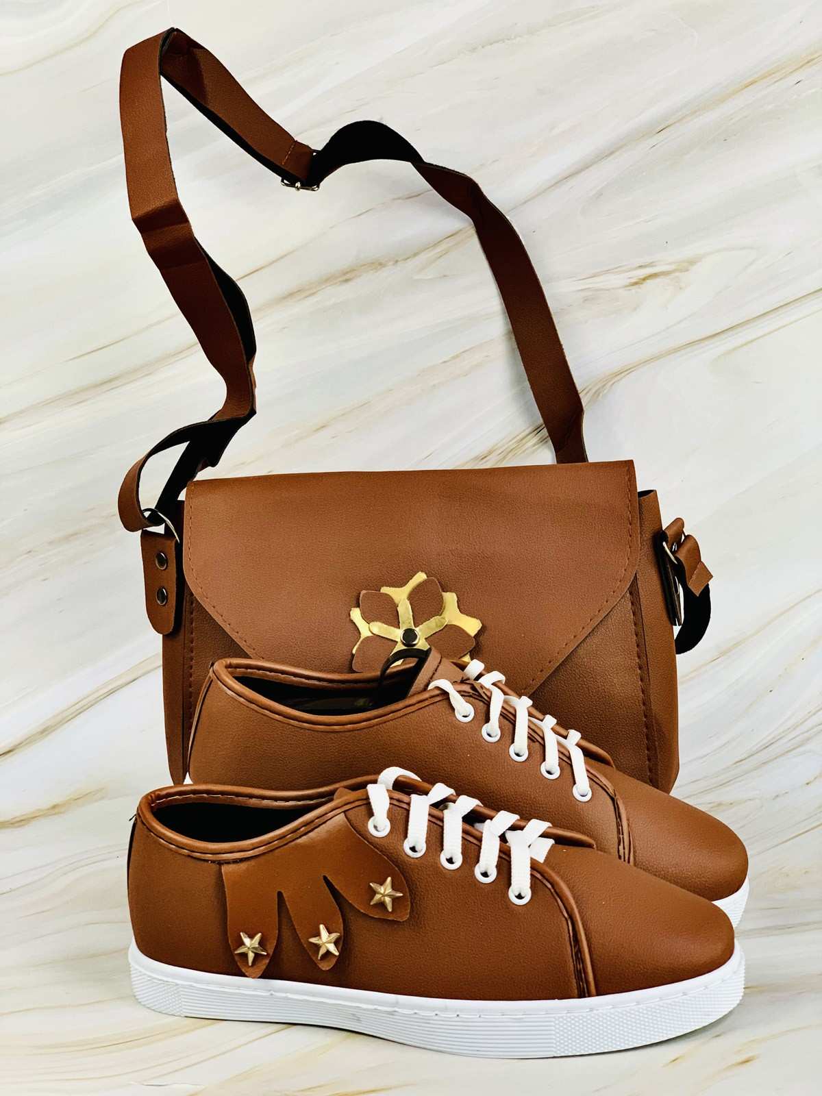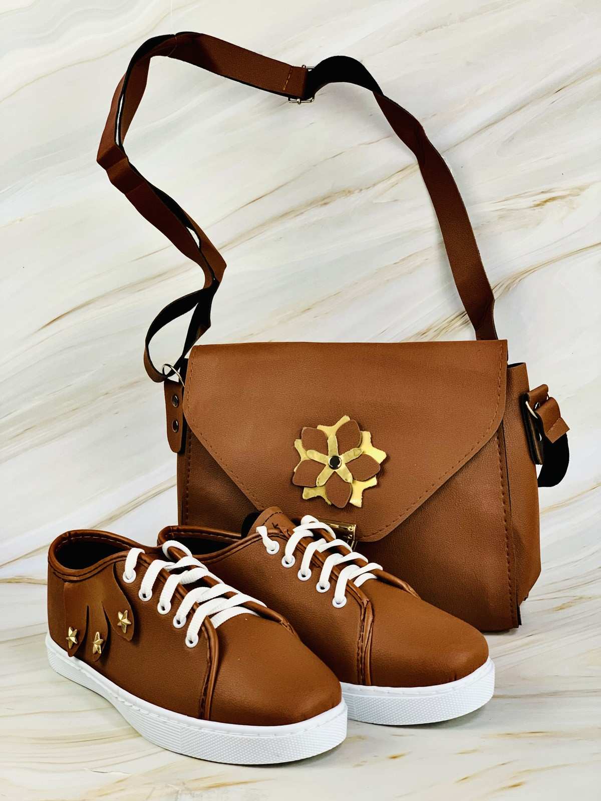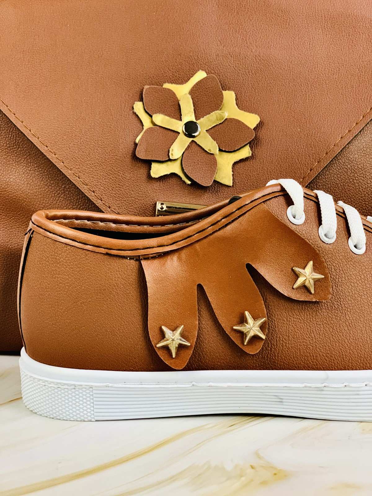 حقيبة بنية وحذاء رياضي مزين بزهرة مزخرفة