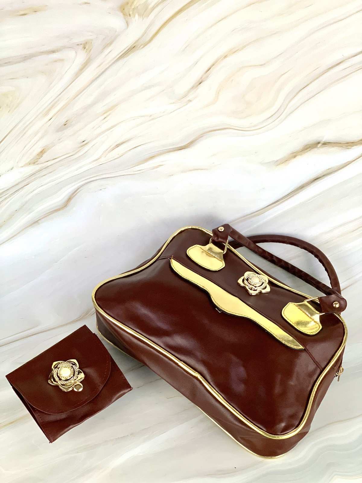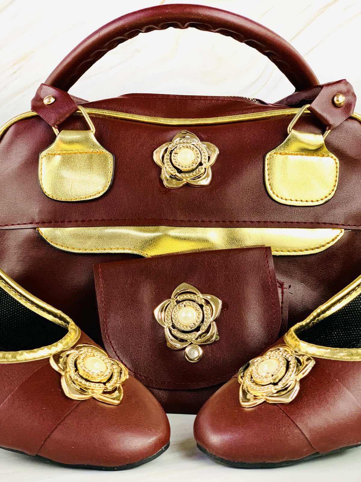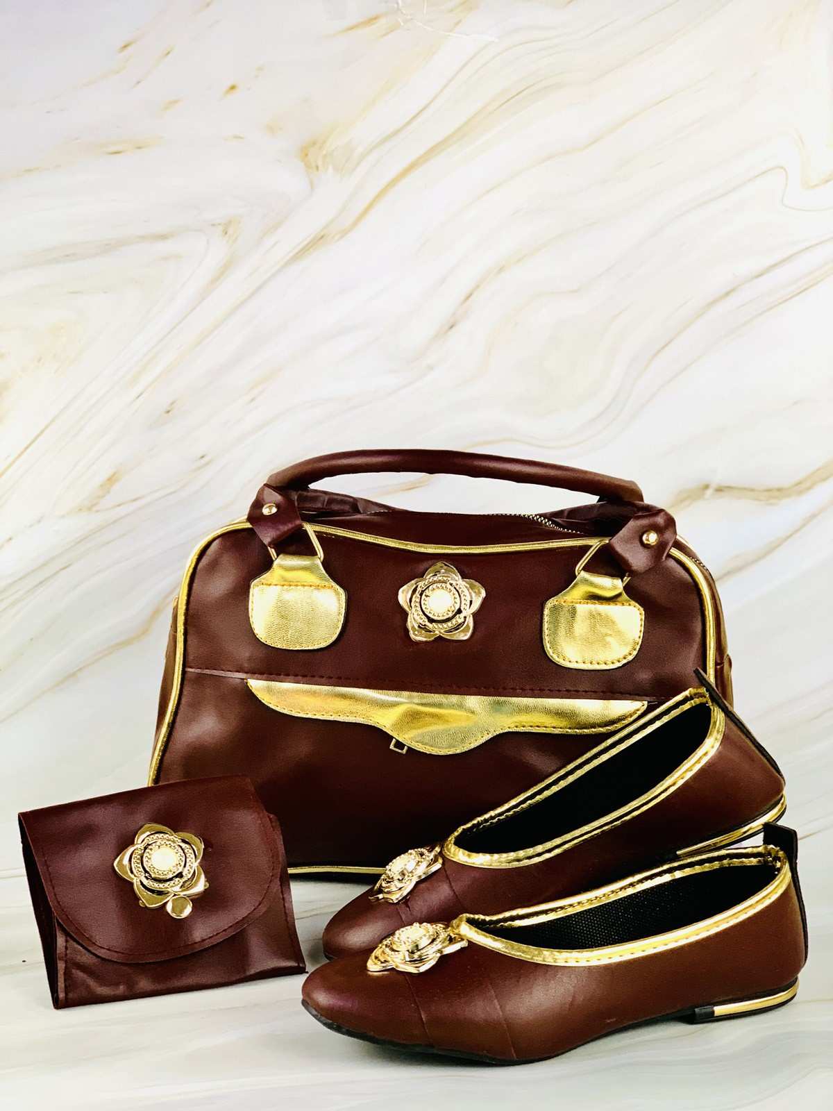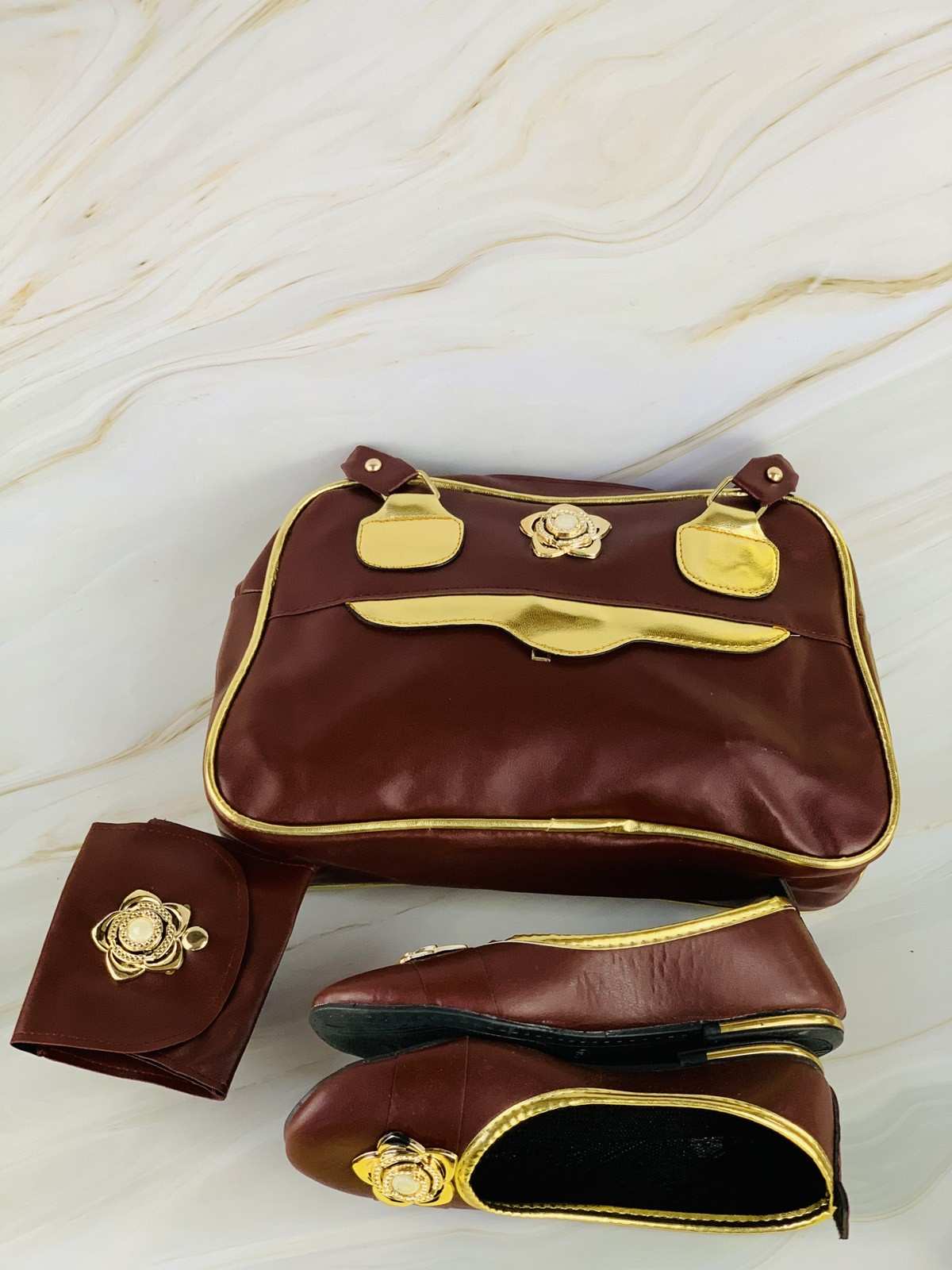 حقيبة وأحذية ومحفظة ذهبية وبنية