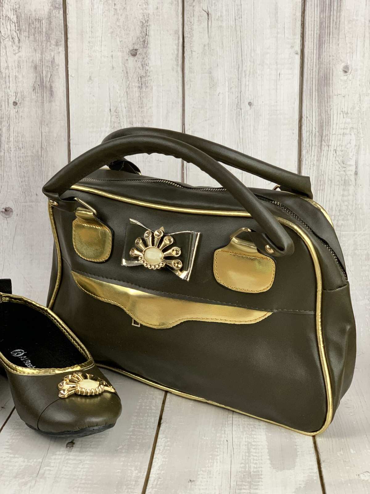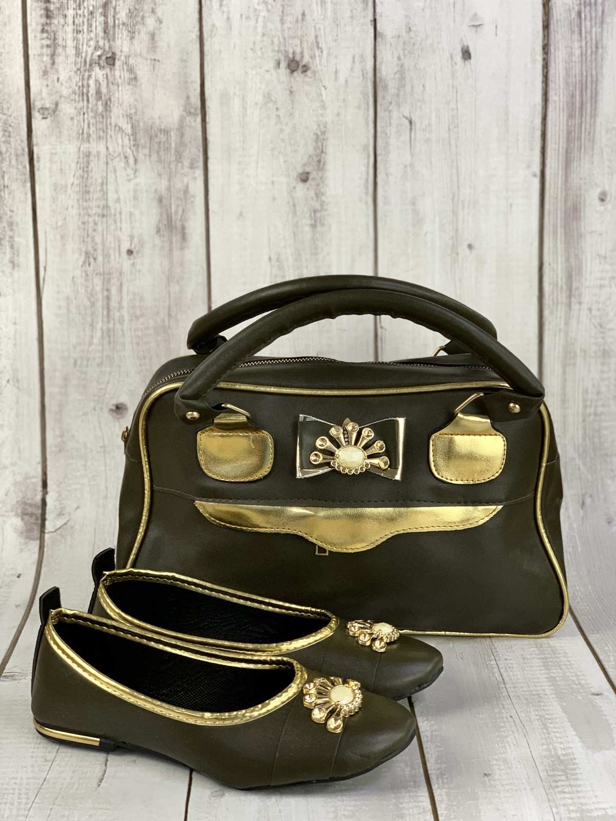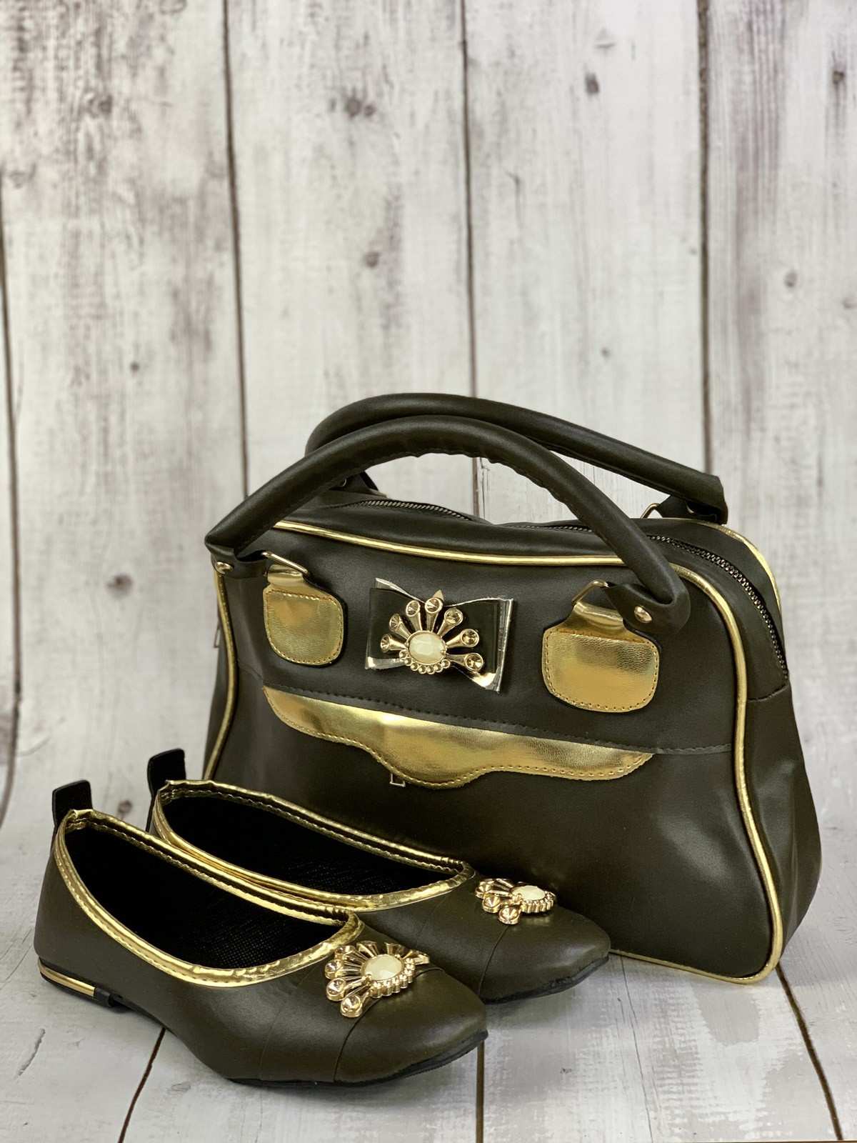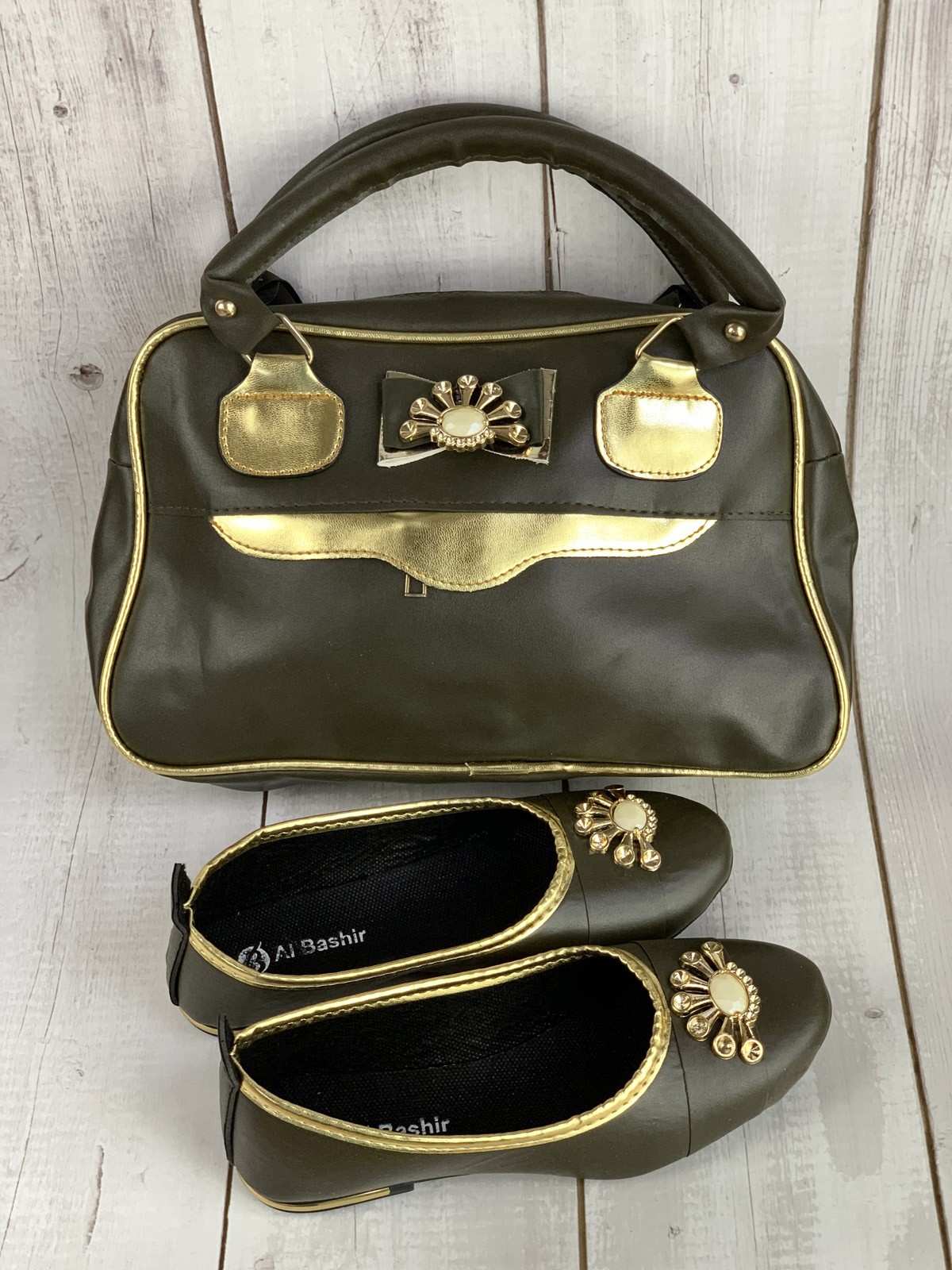 حقيبة وحذاء باللون الأخضر مع زهرة زخرفية