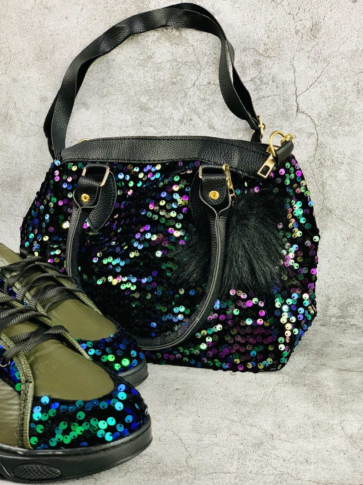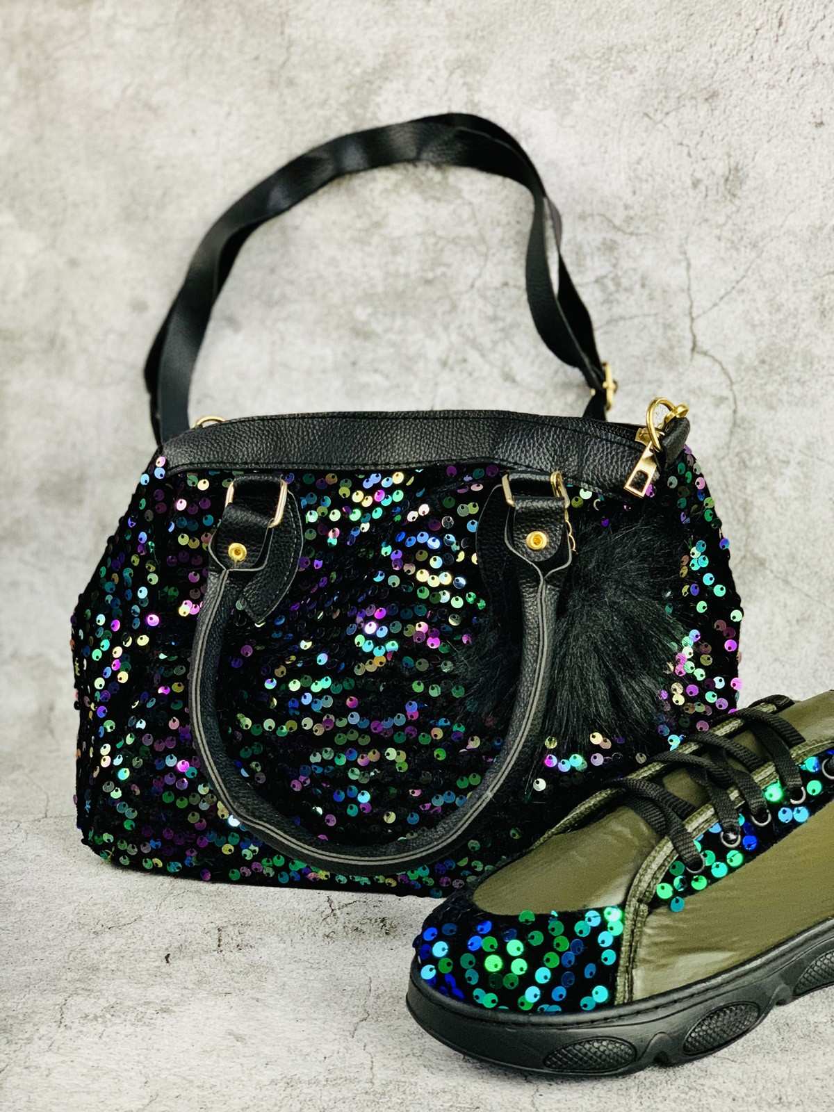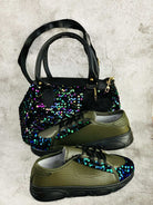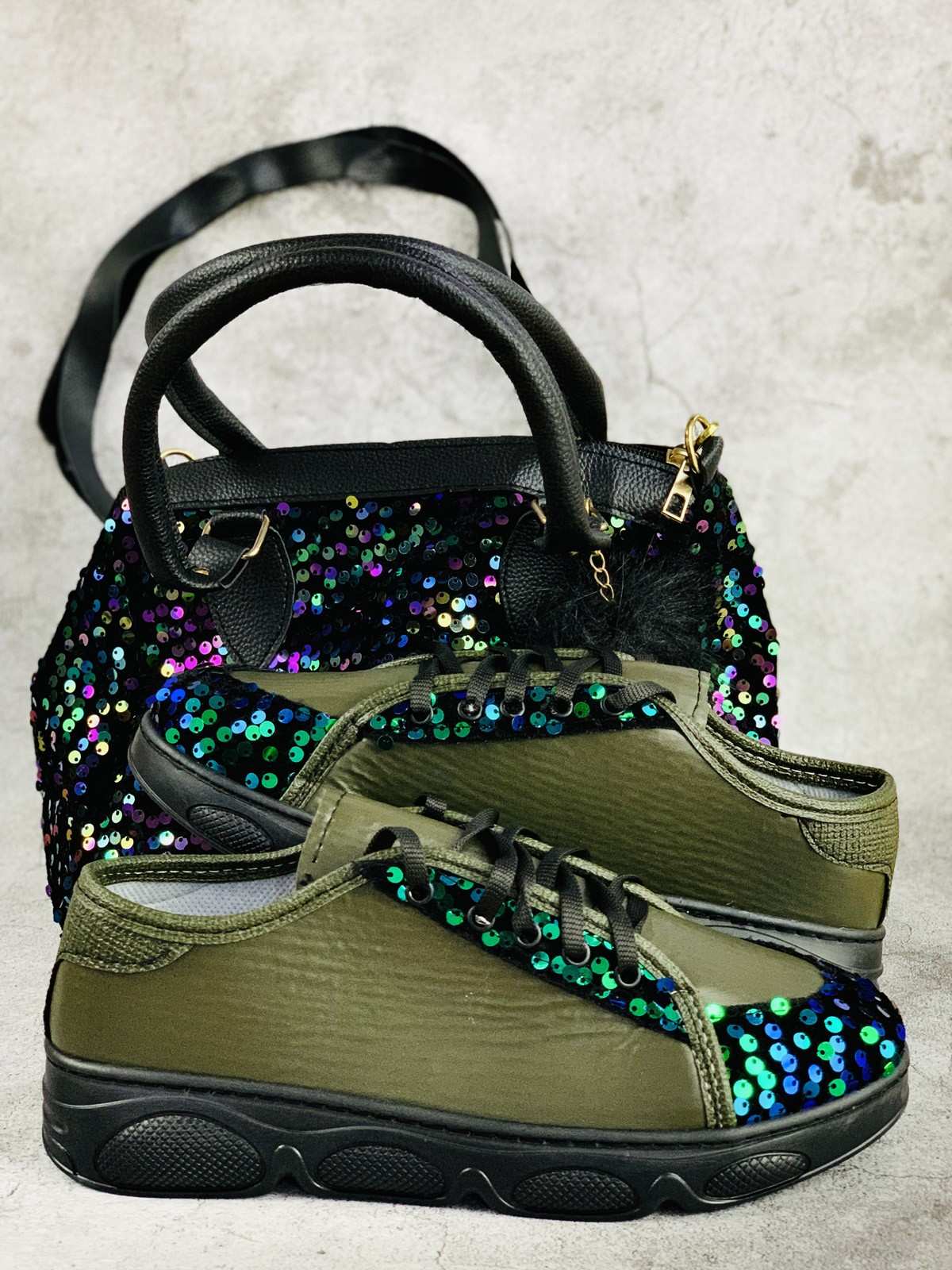 للنساء - حقيبة خضراء وحذاء رياضي مع بريق أزرق داكن