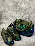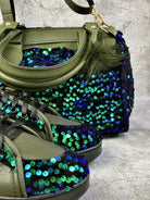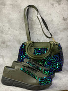 للنساء - حقيبة خضراء وحذاء رياضي مع بريق أزرق داكن