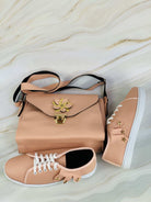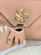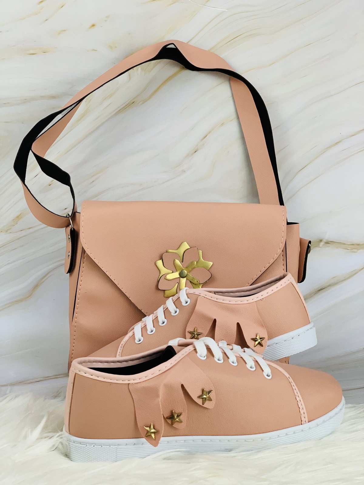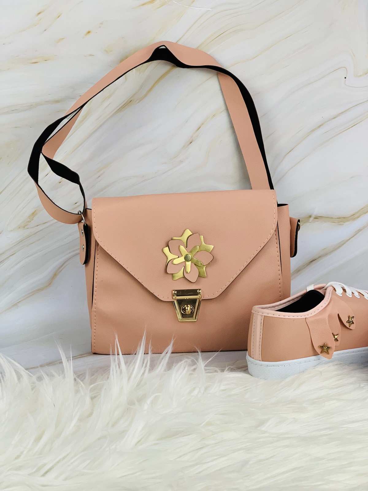 للنساء - حقيبة وردية وحذاء مع وردة ذهبية