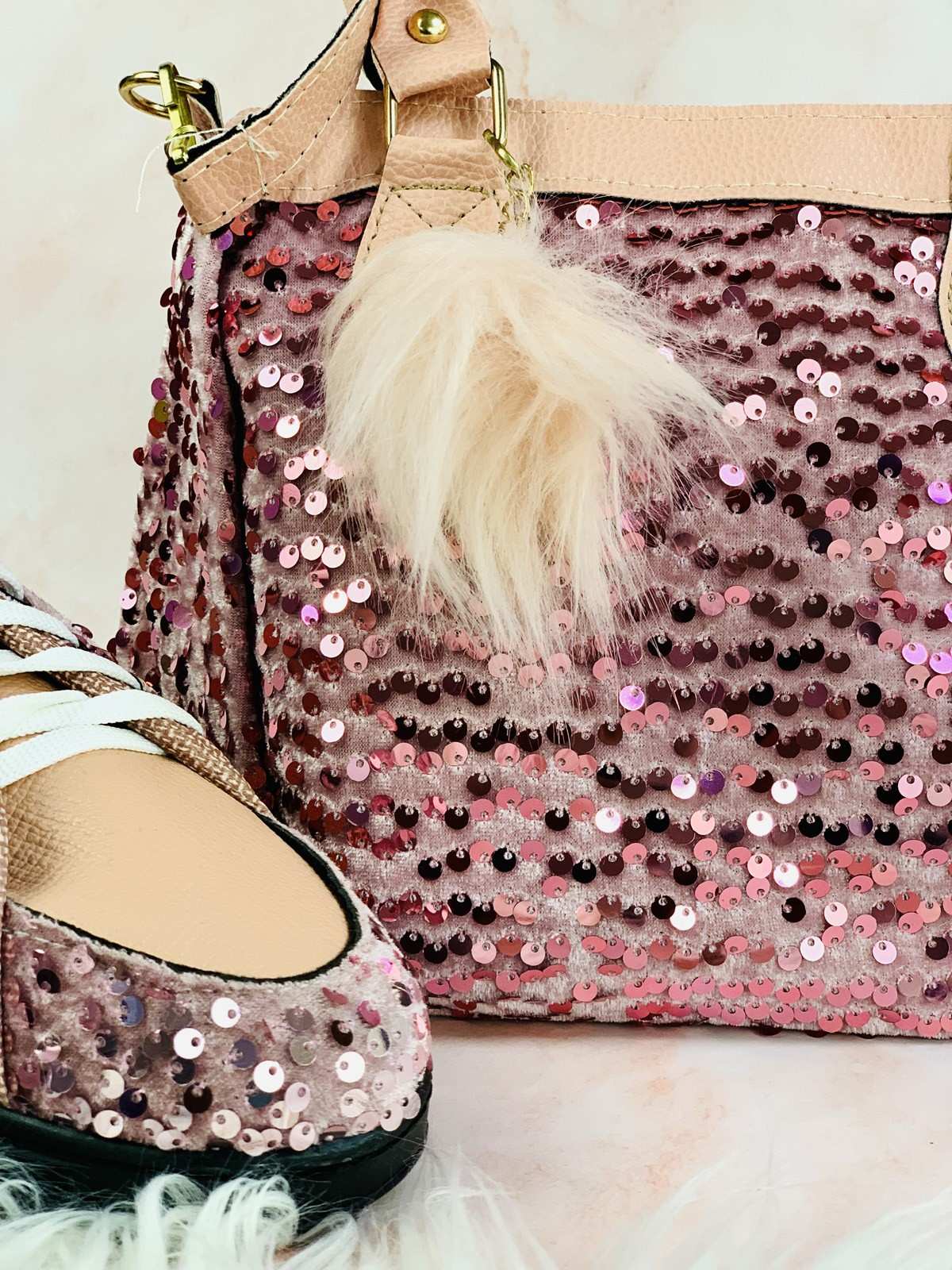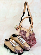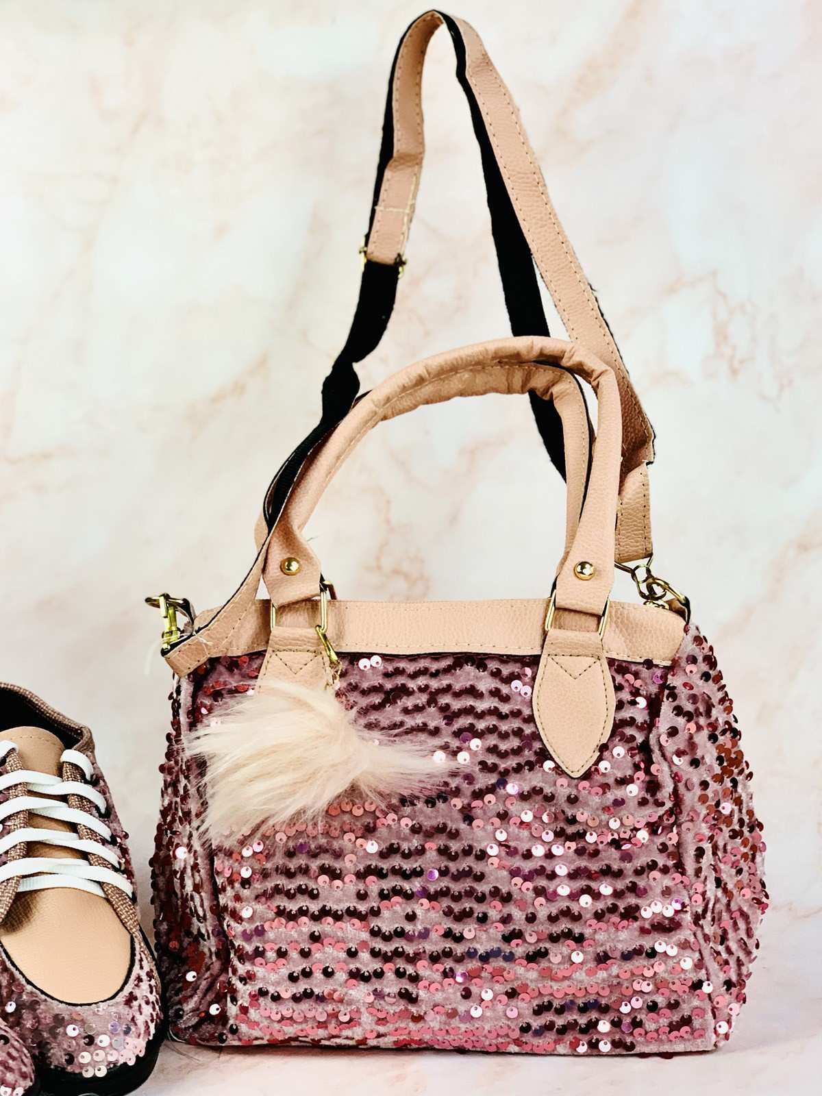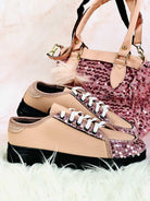 للنساء - حقيبة وردية لامعة وحذاء رياضي