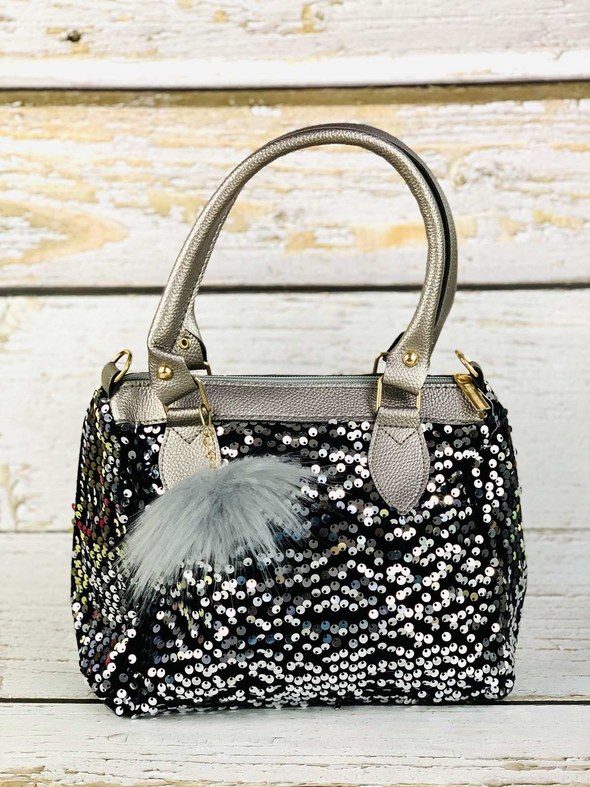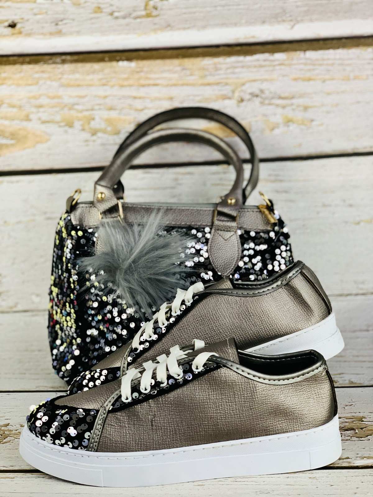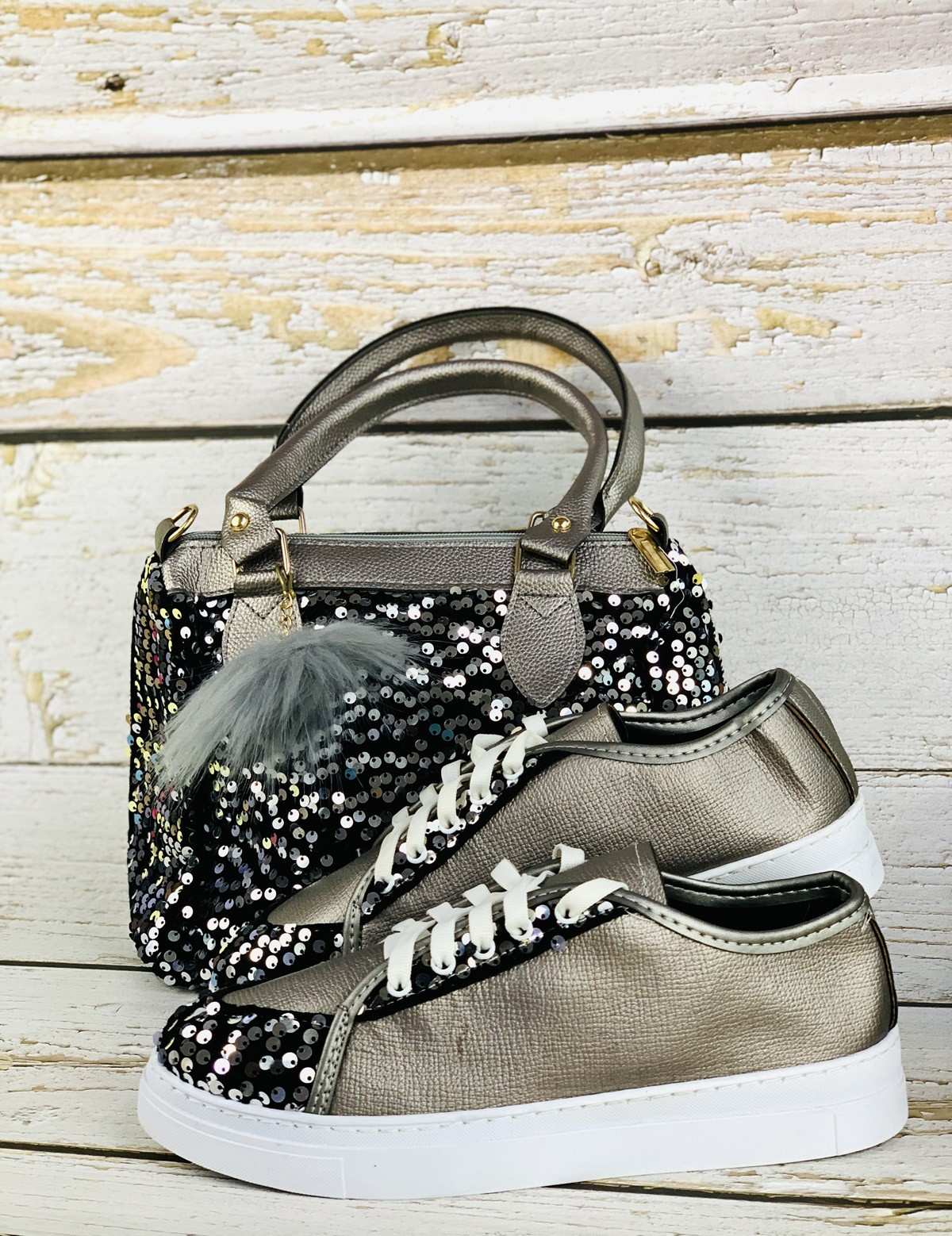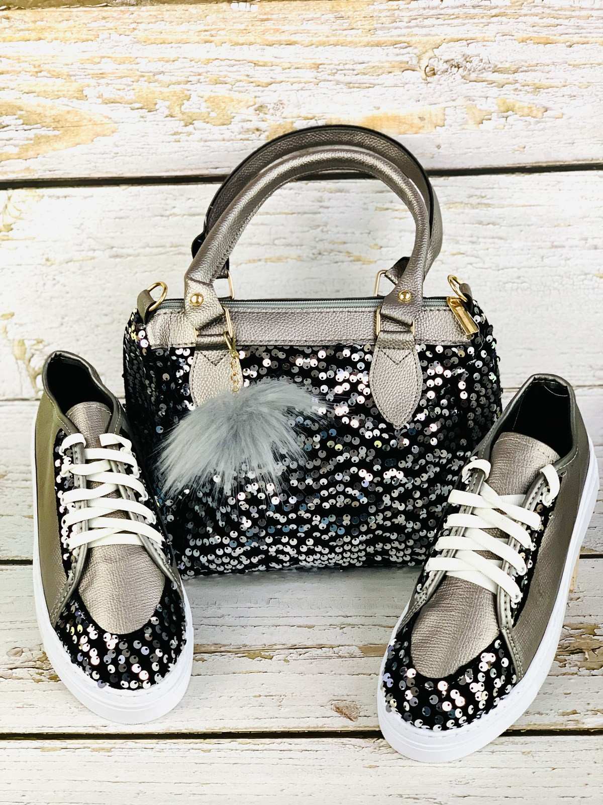 حقيبة حمراء وحذاء رياضي مع بريق ممزق