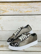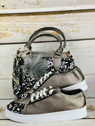 للنساء - حقيبة حمراء وحذاء رياضي ببريق ممزق
