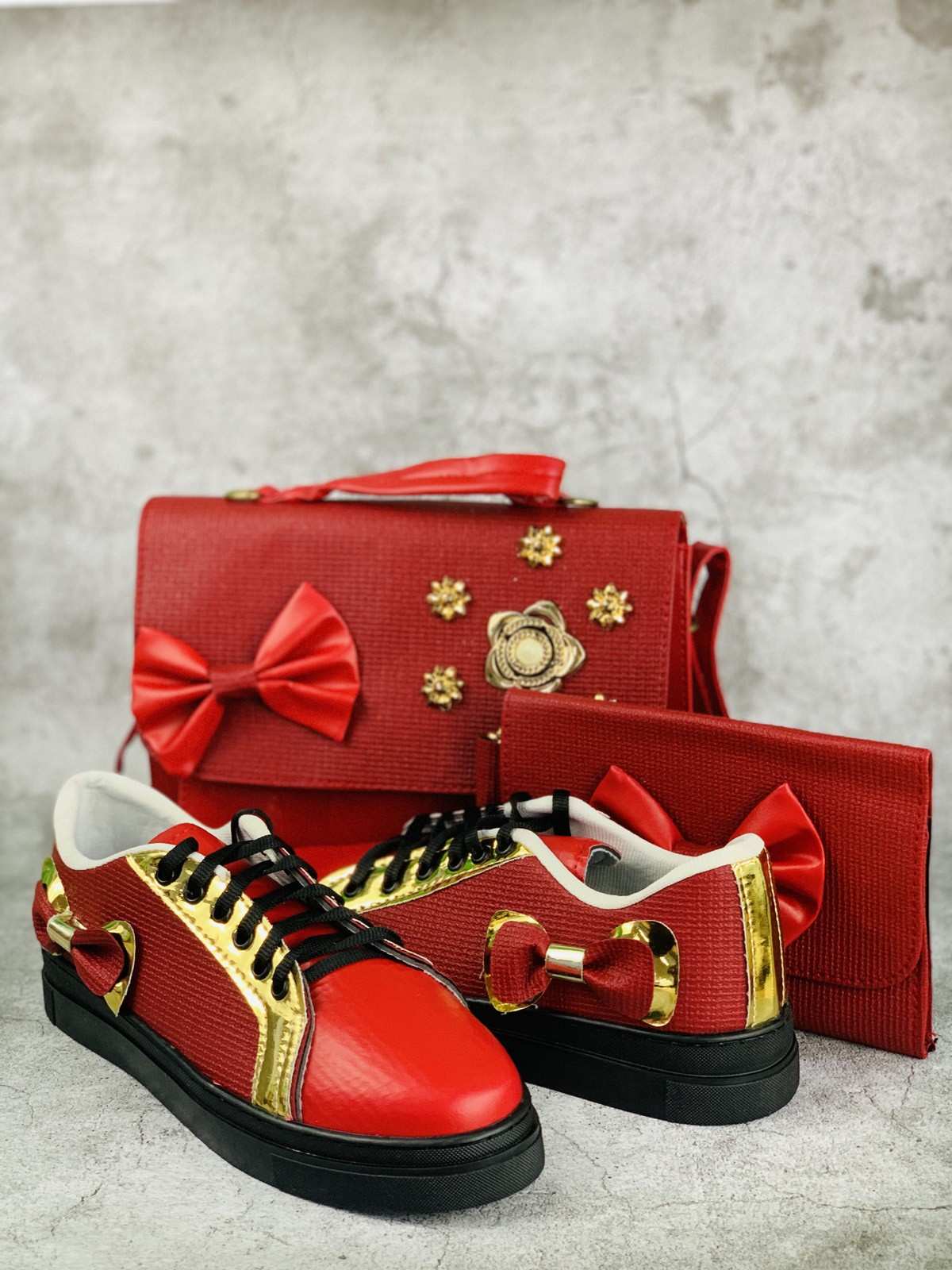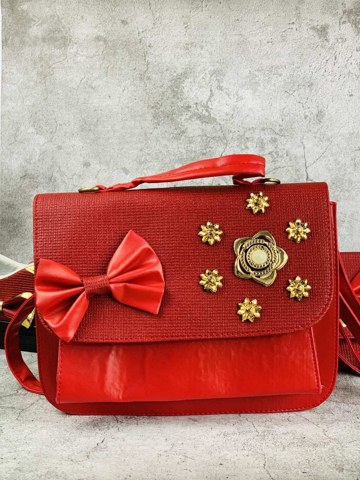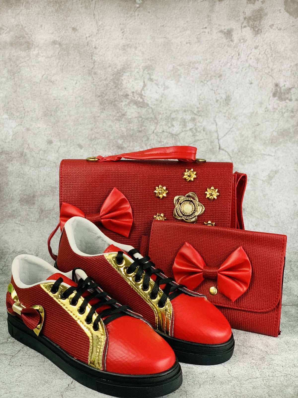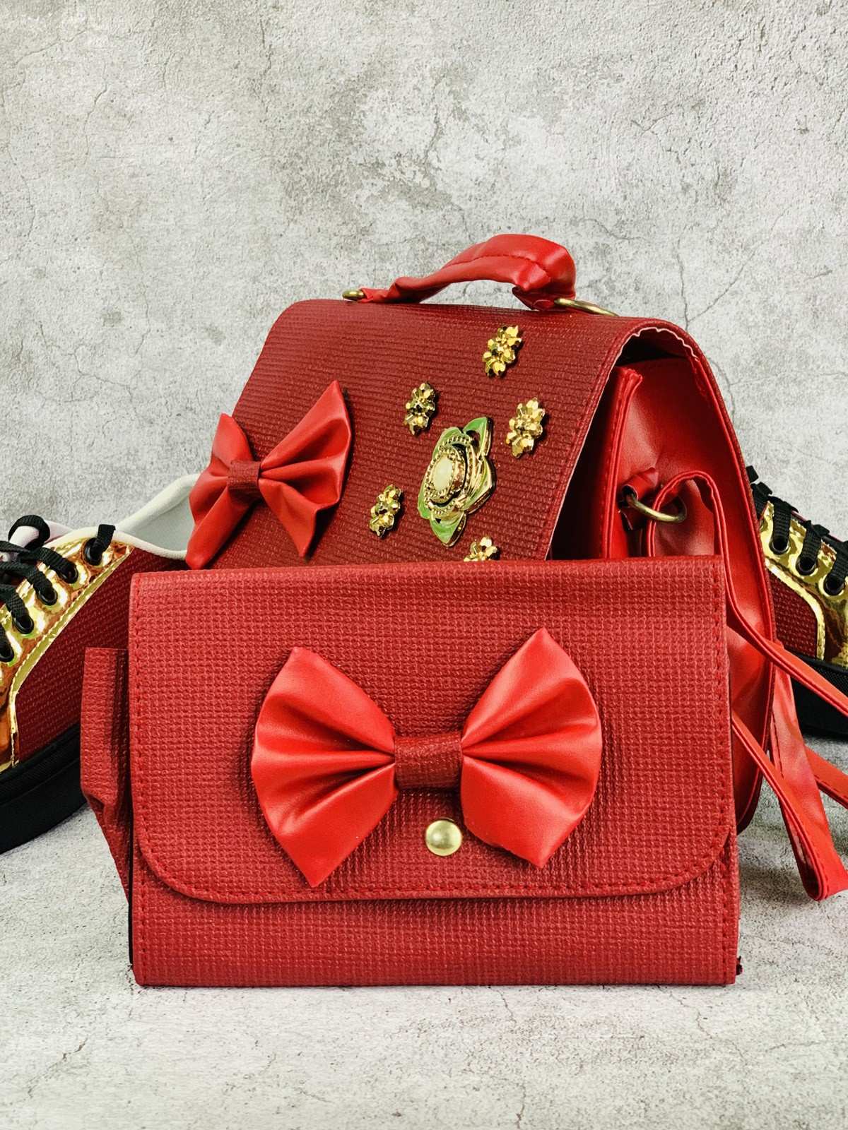 حقيبة حمراء وحذاء ومحفظة بعقدة زخرفية