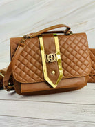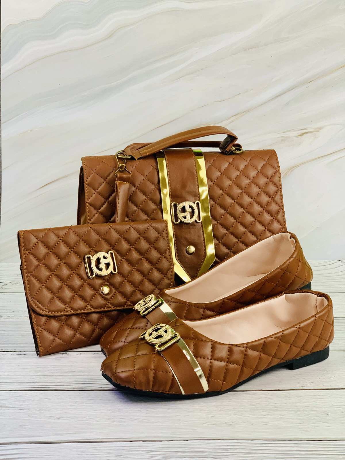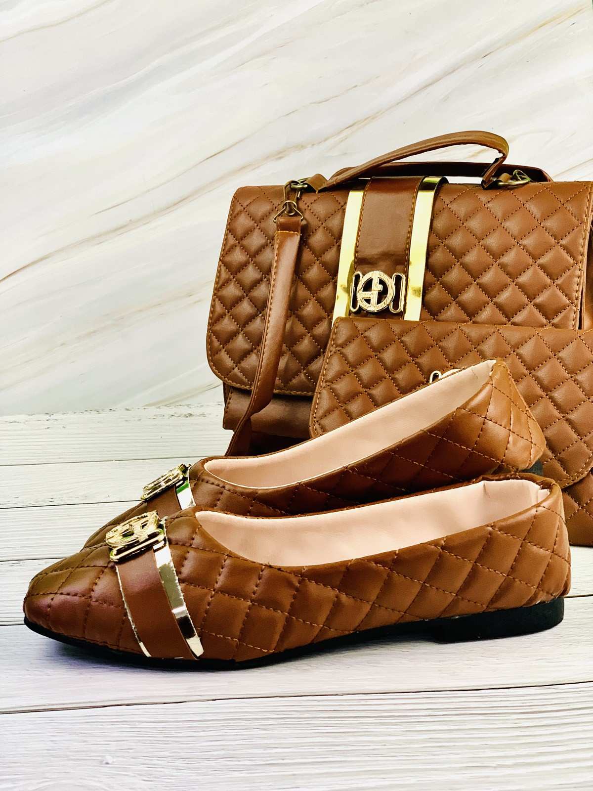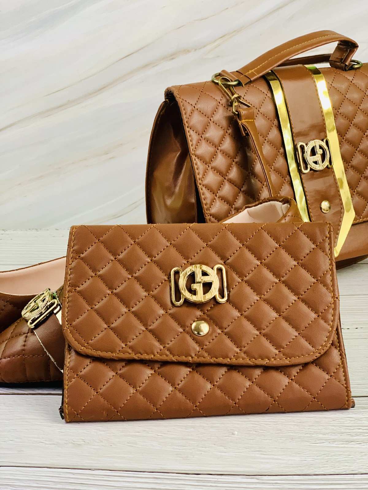 حقيبة وأحذية ومحفظة باللون البني الفاتح مختومة