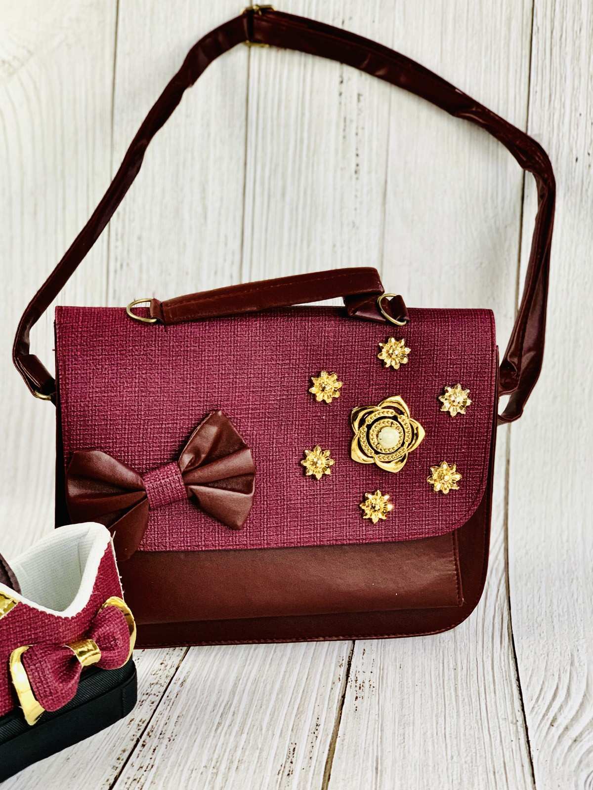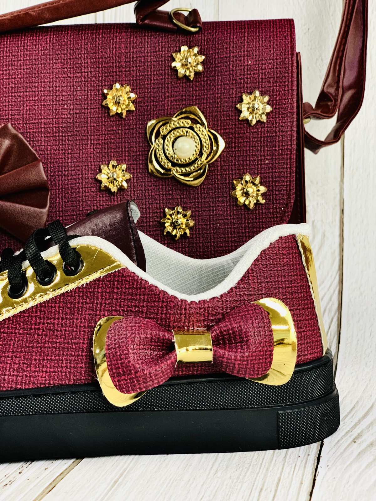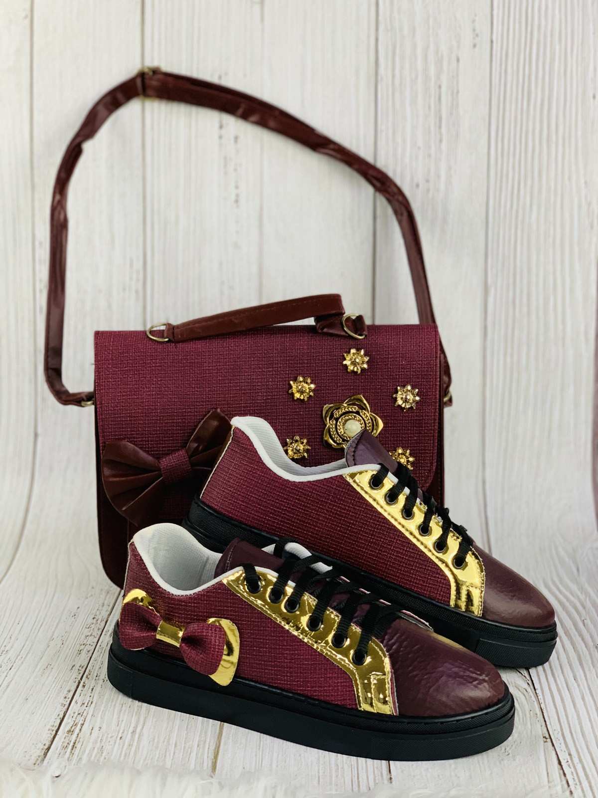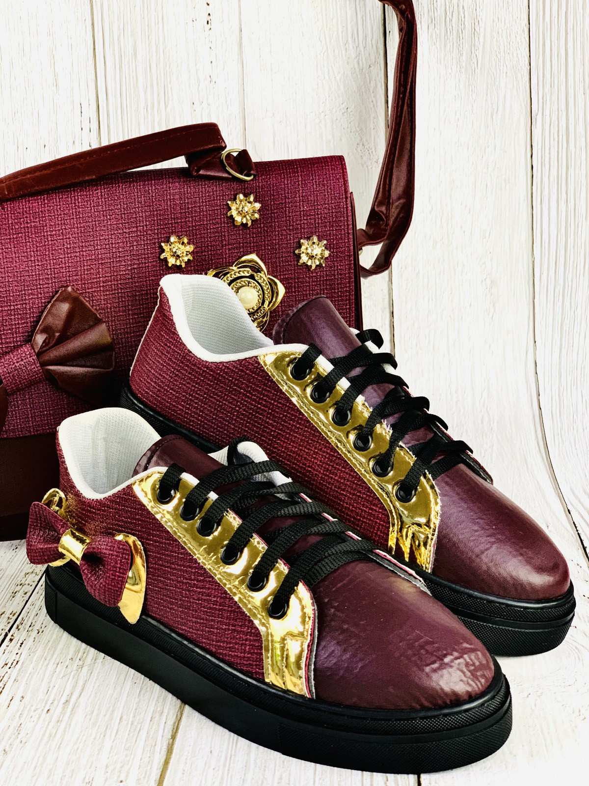 حقيبة نبيذ وأحذية رياضية مزينة بزهرة ذهبية