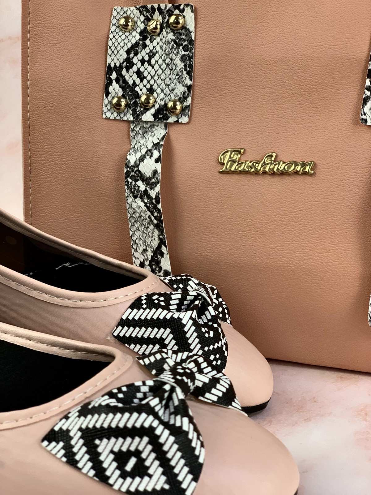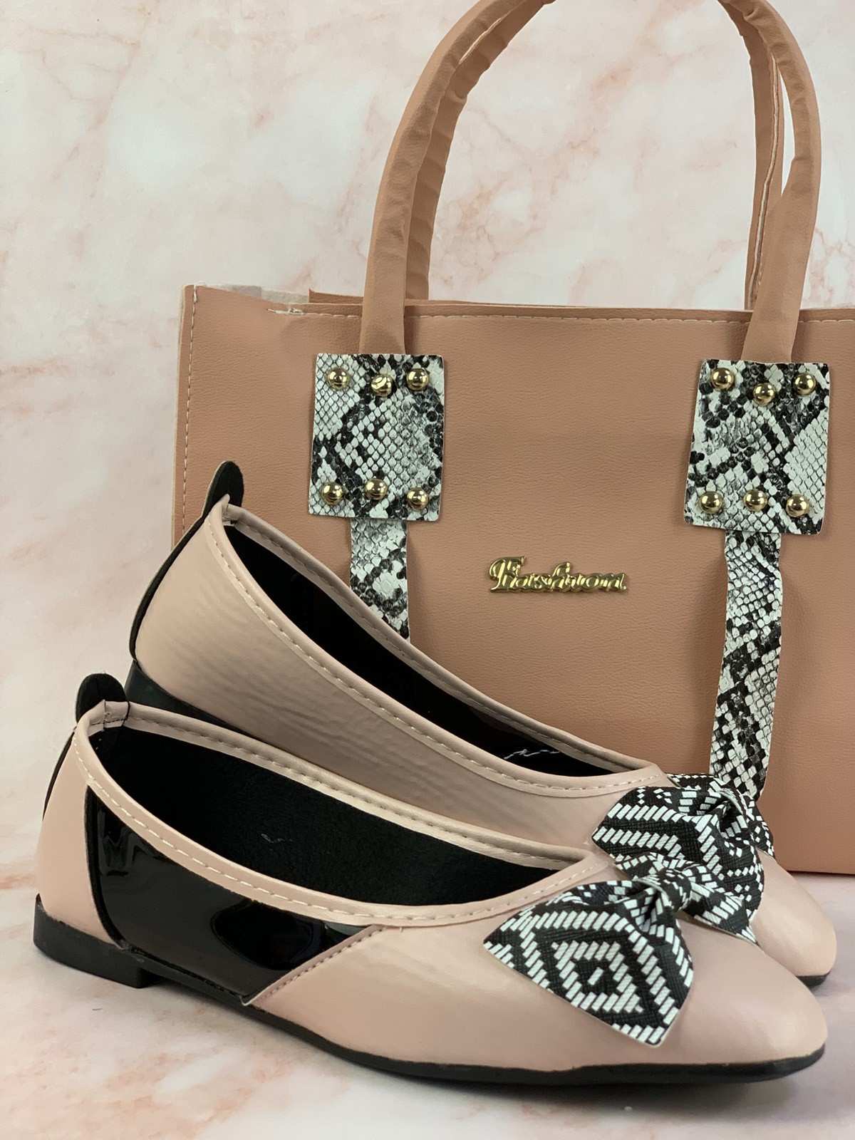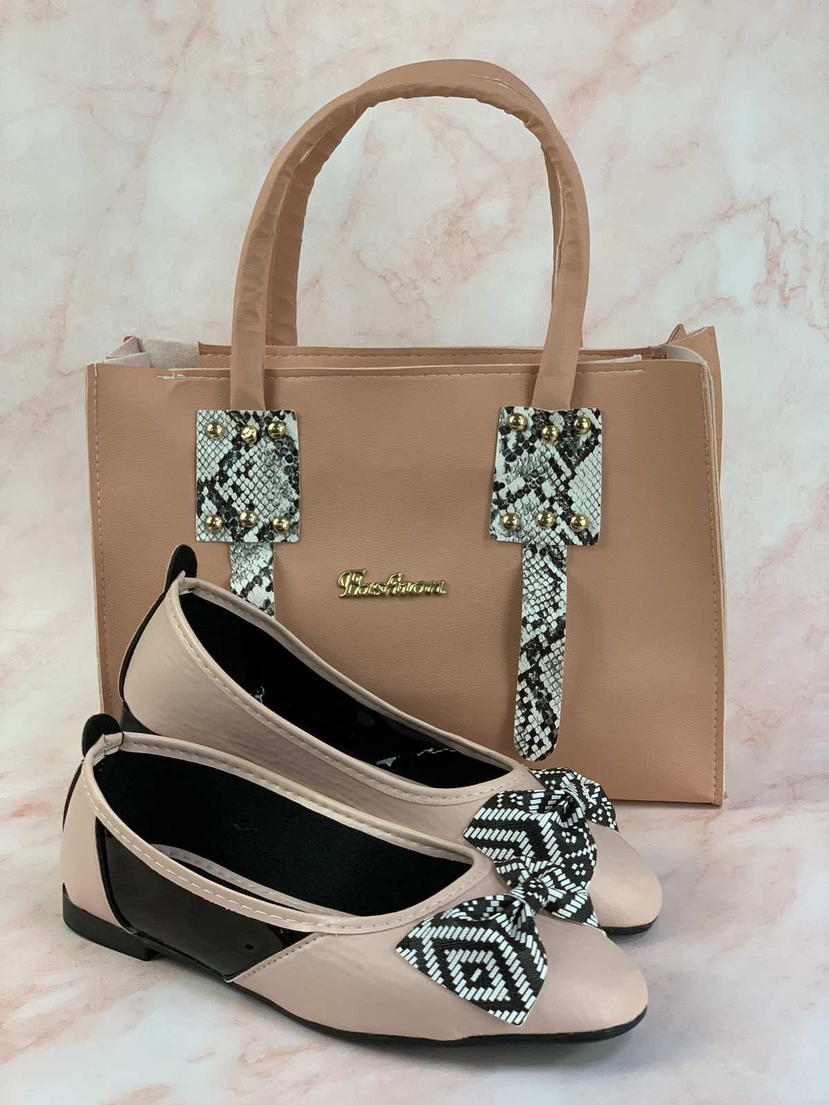 حقيبة وحذاء باللون البيج مع شكل ثعبان ومثبتات ذهبية