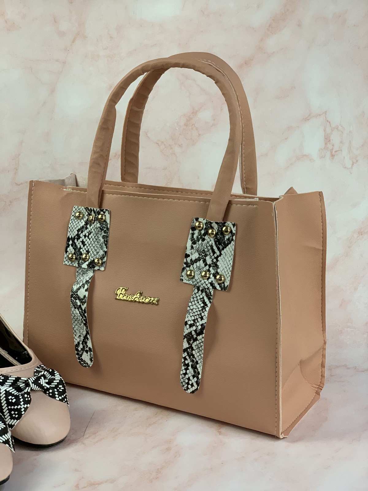 للنساء - حقيبة وحذاء باللون البيج مع شكل ثعبان ومثبتات ذهبية