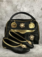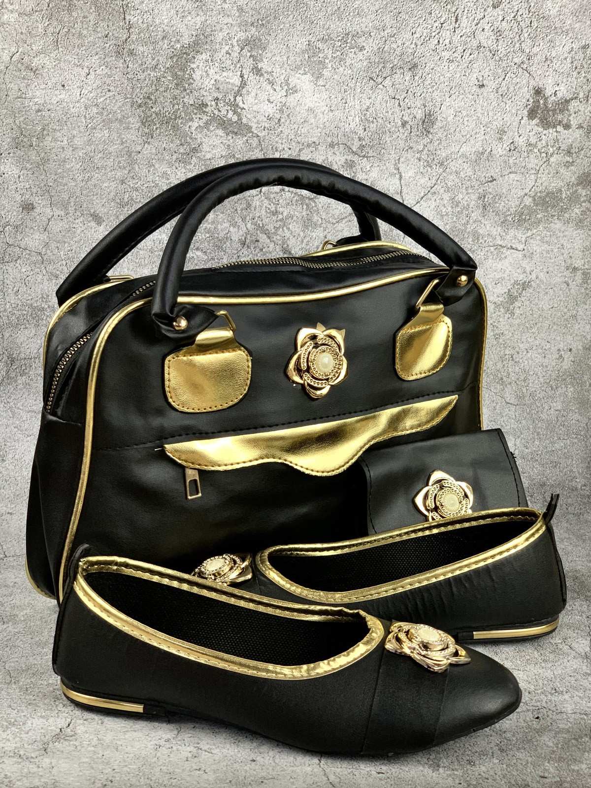 حقيبة ومحفظة وحذاء باللون الأسود مزين بزهرة ذهبية