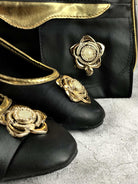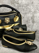 للنساء - حقيبة ومحفظة وحذاء باللون الأسود مزين بزهرة ذهبية