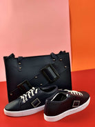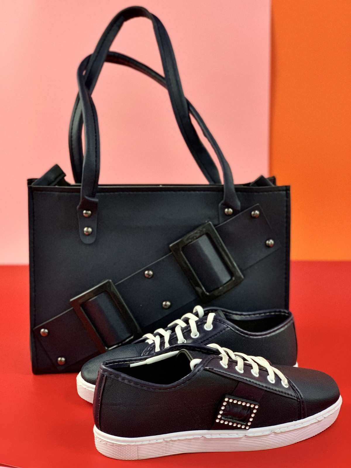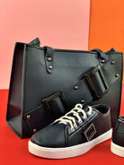 حقيبة سوداء مع حذاء بحلقات معدنية
